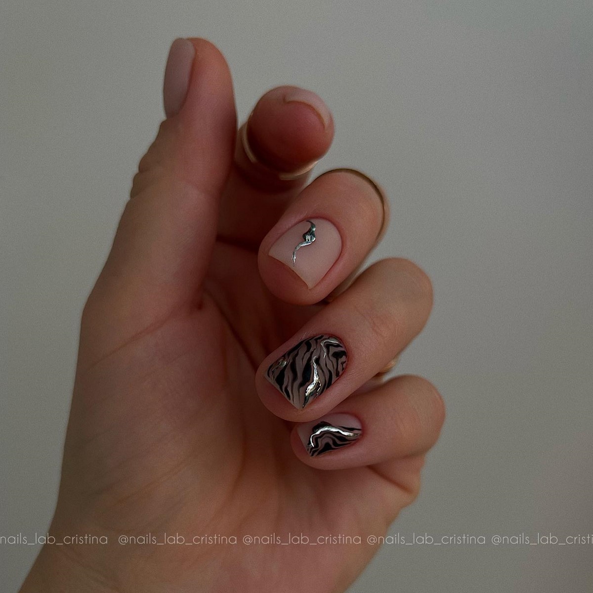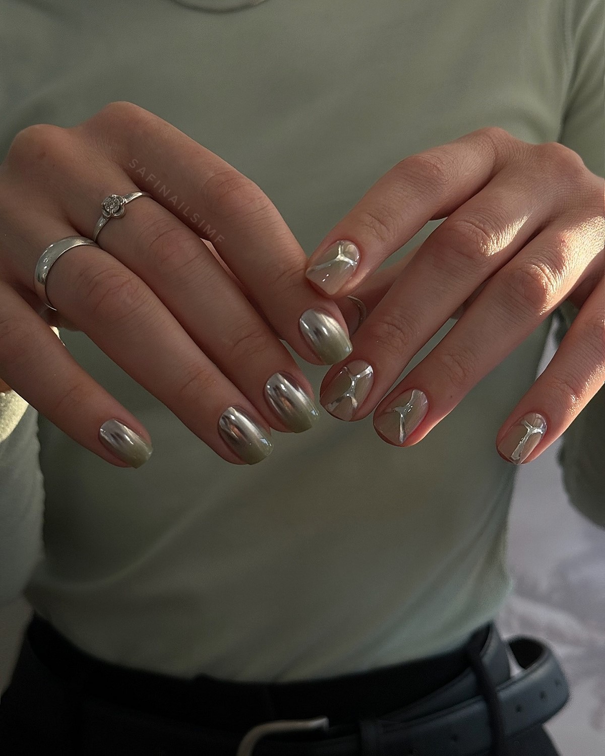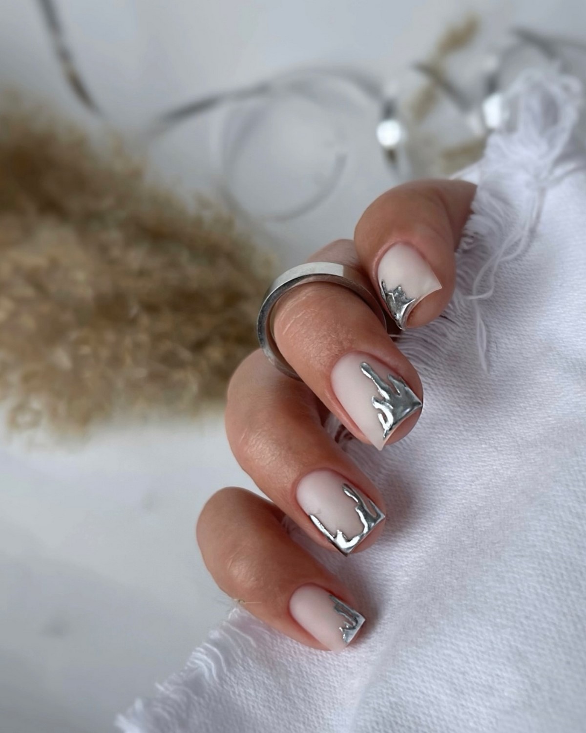 Цей дизайн виглядає особливо ефектно під святкові образи — новорічні вечірки, корпоративи, зимові зйомки. Найпопулярніші відтінки сезону — срібло, графіт, платина та холодний хром. Якщо хочеться додати елегантності, можна обрати варіант «краплі металу» у вигляді акцентних елементів на одному-двох нігтях. Такий підхід виглядає максимально трендово, але водночас стримано.