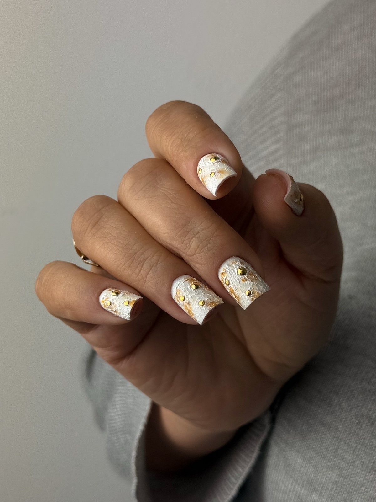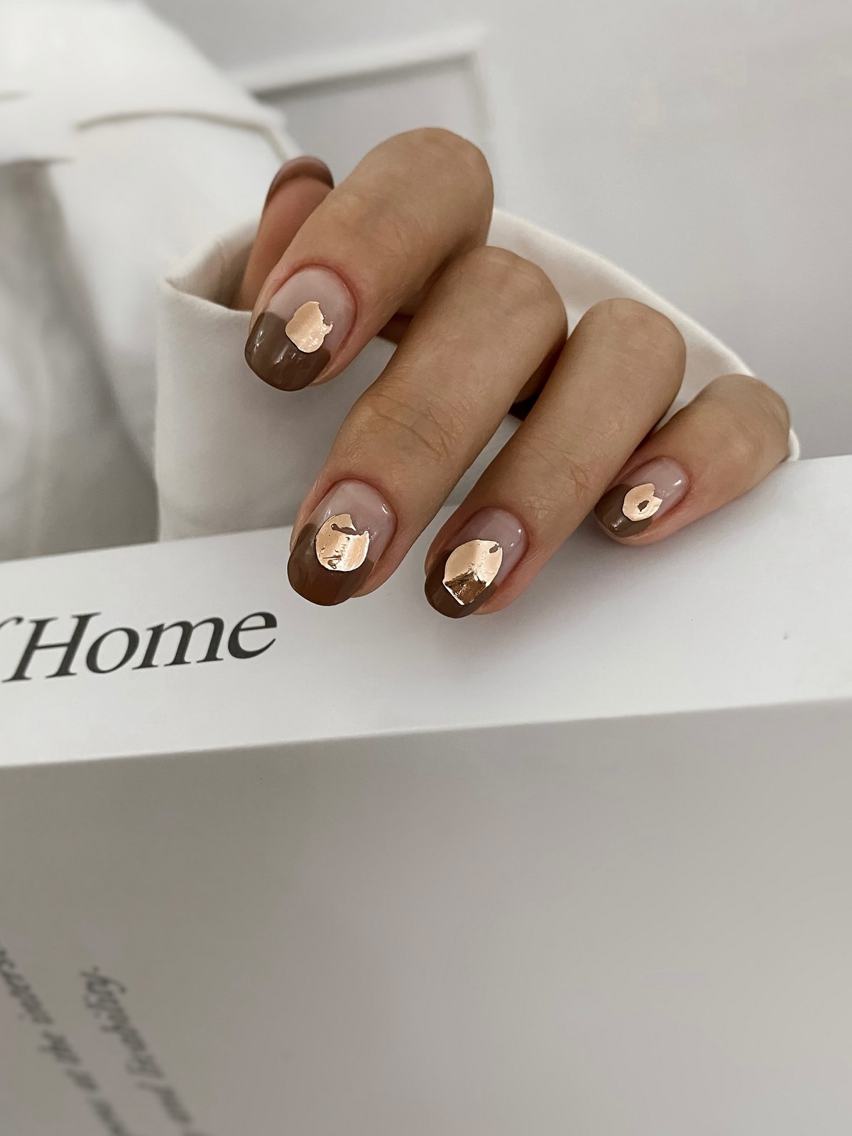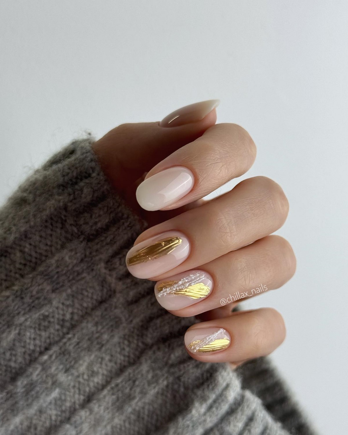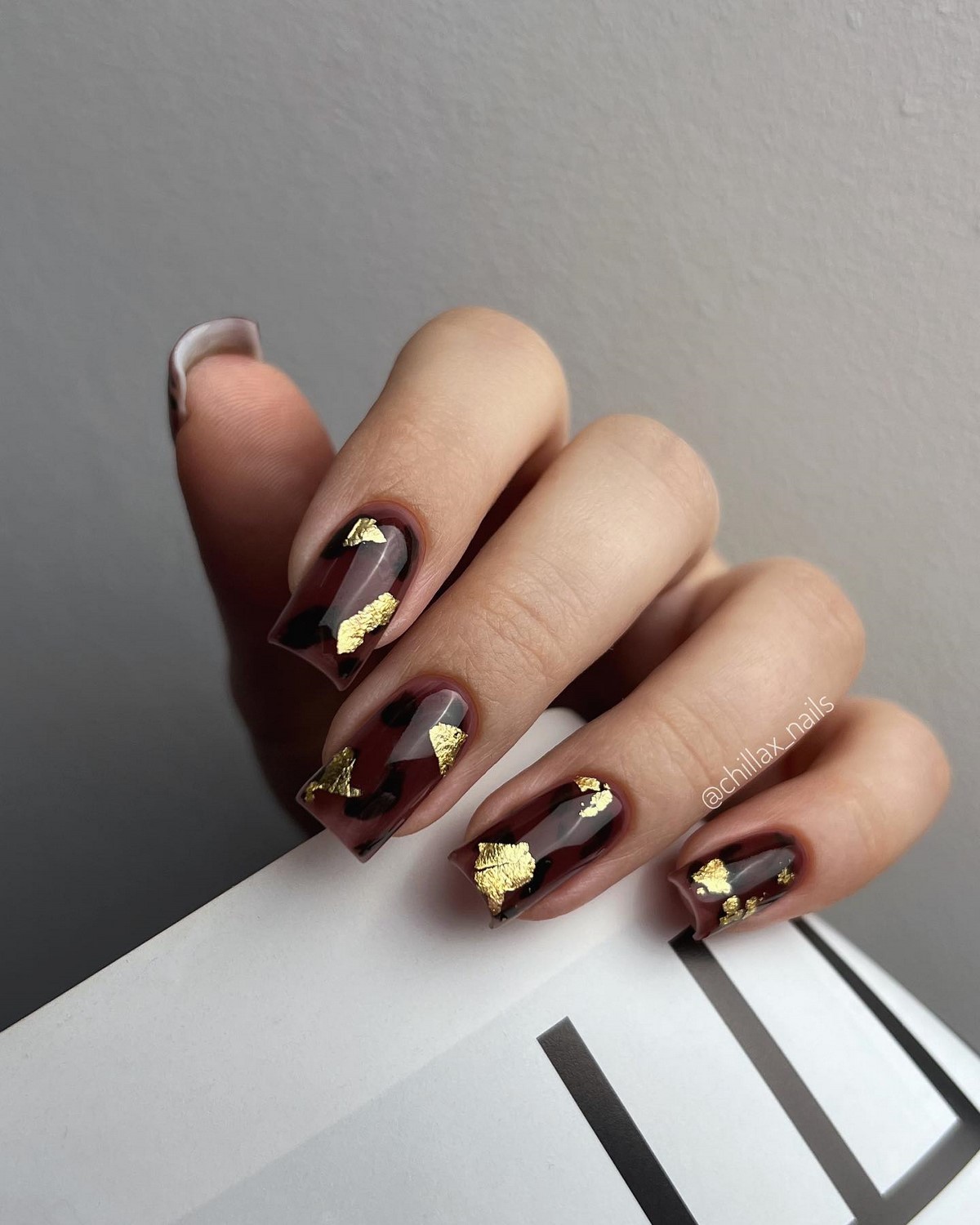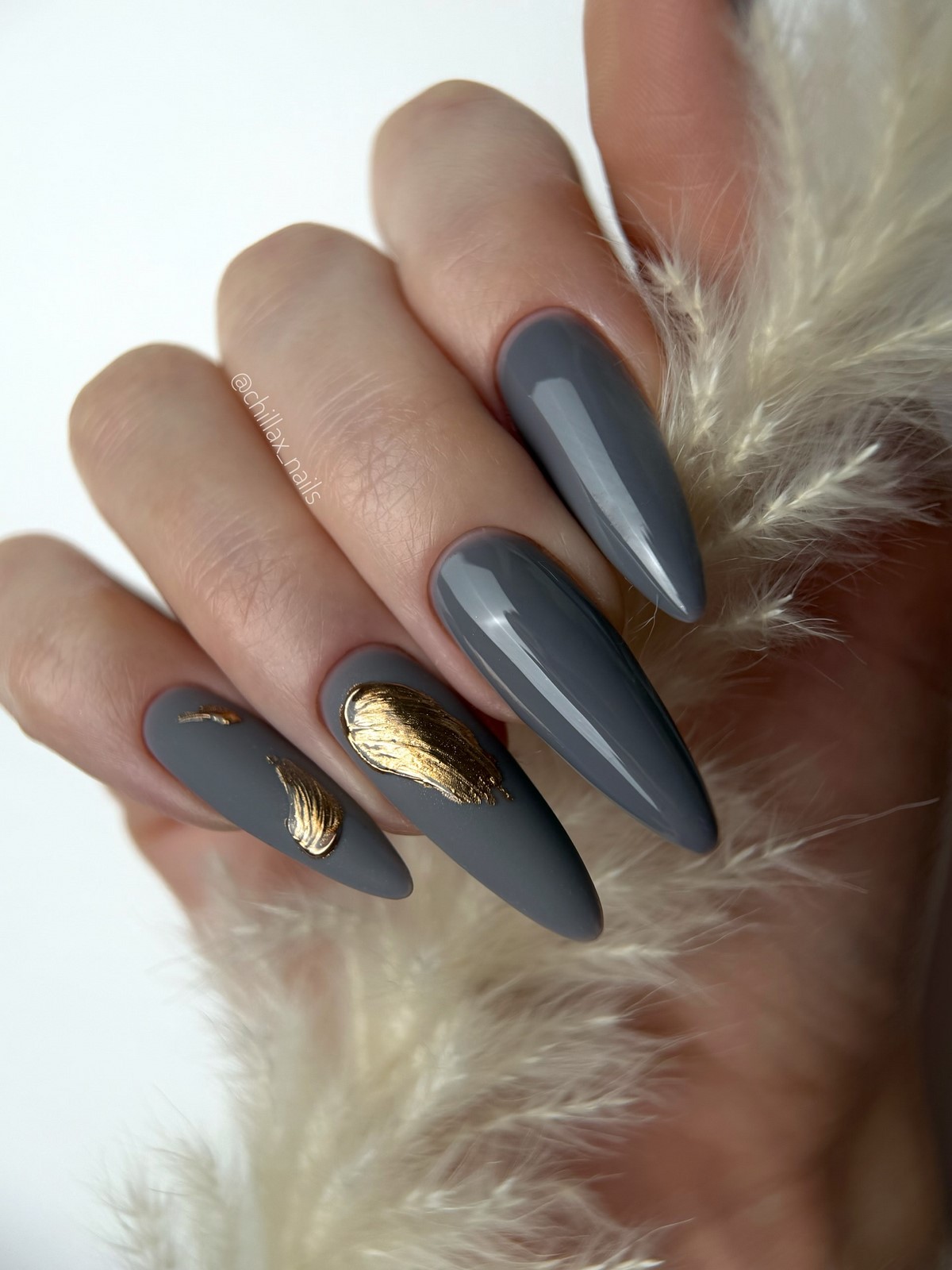 Золоті текстури найкраще розкриваються на однотонних темних покриттях, наприклад, шоколадному чи грифельному. Також модним вибором стануть холодні відтінки золота, які чудово поєднуються з сірими та молочними лаками. Дизайн виглядає сучасно та артистично, підкреслюючи індивідуальний стиль своєї власниці. Взимку такі варіанти особливо актуальні завдяки святковому сяйву.
