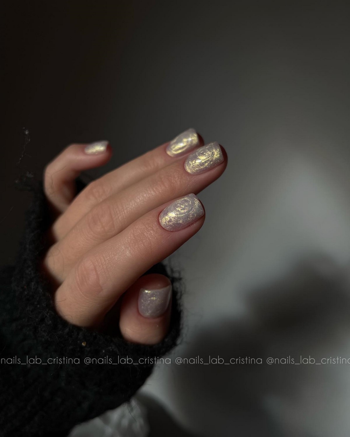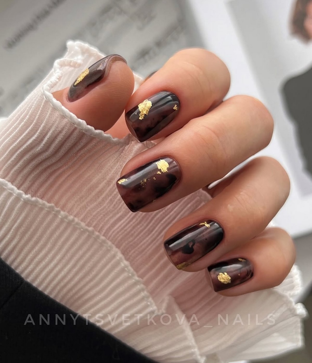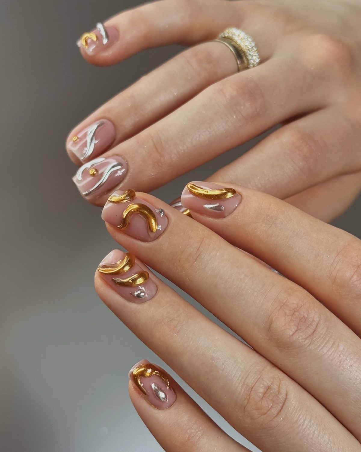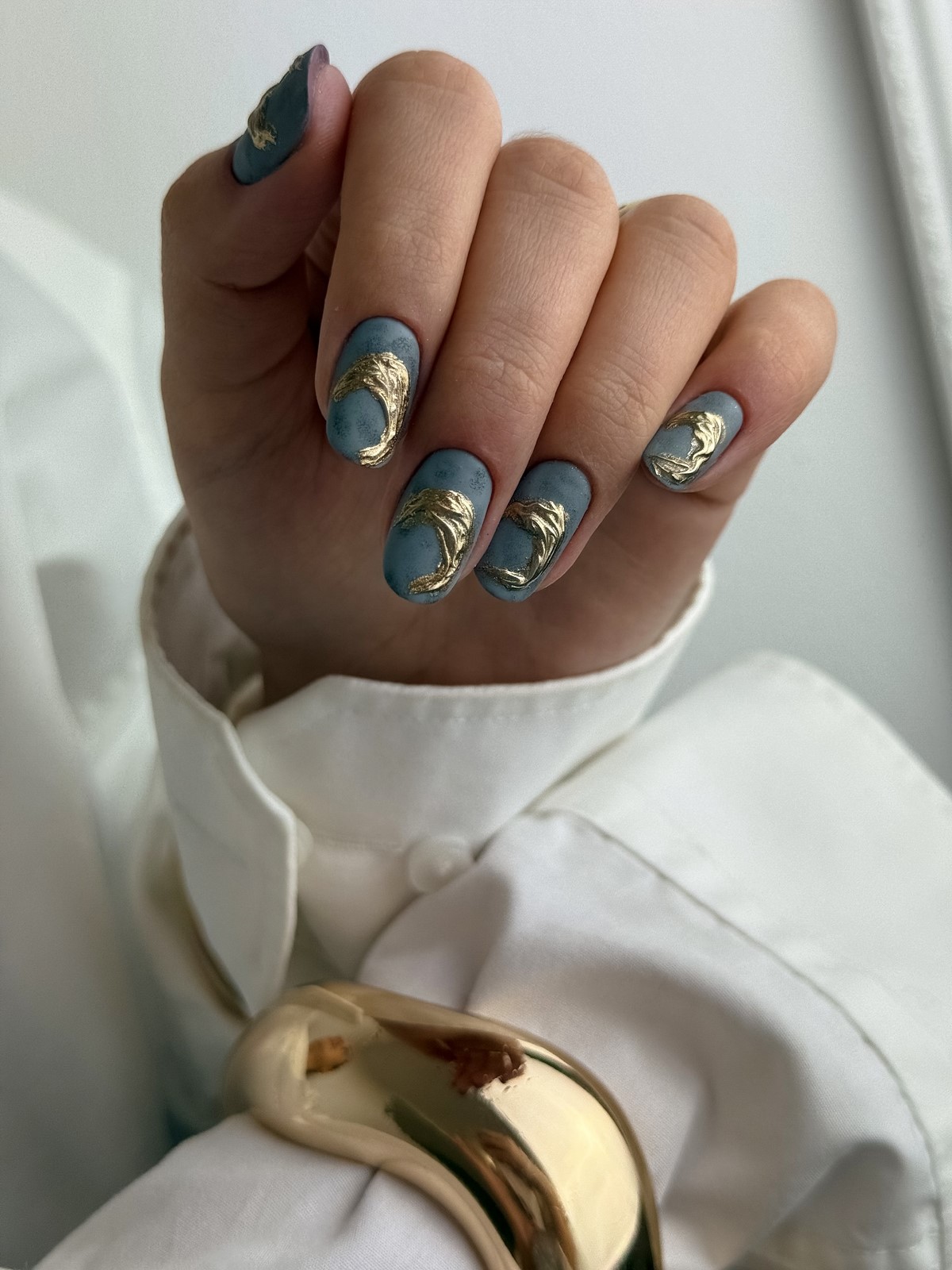 Золоті текстури найкраще розкриваються на однотонних темних покриттях, наприклад, шоколадному чи грифельному. Також модним вибором стануть холодні відтінки золота, які чудово поєднуються з сірими та молочними лаками. Дизайн виглядає сучасно та артистично, підкреслюючи індивідуальний стиль своєї власниці. Взимку такі варіанти особливо актуальні завдяки святковому сяйву.