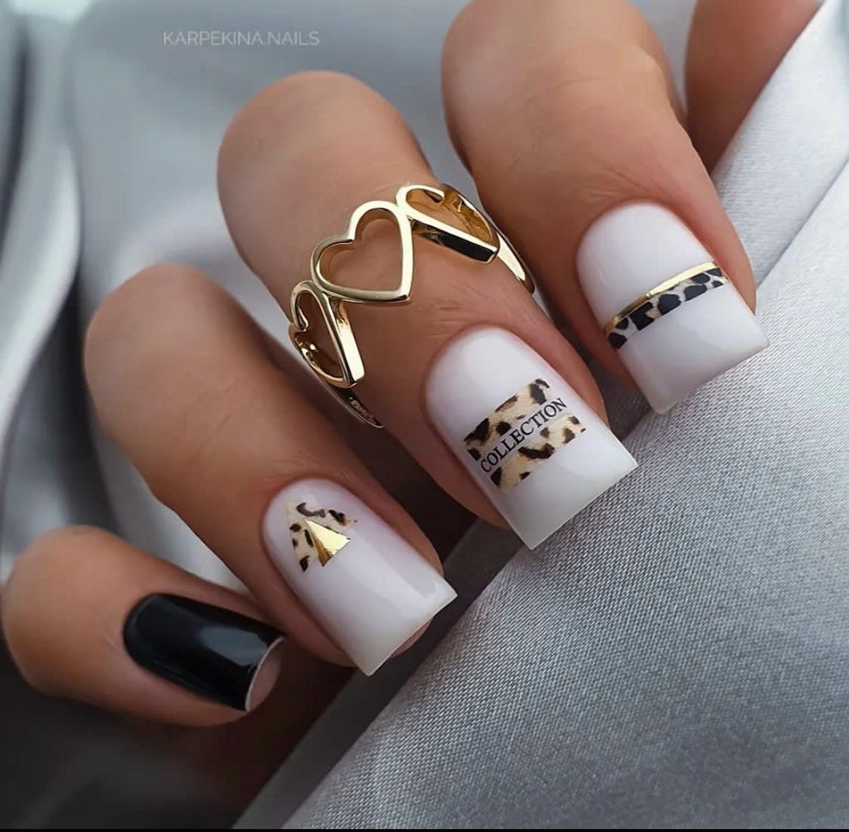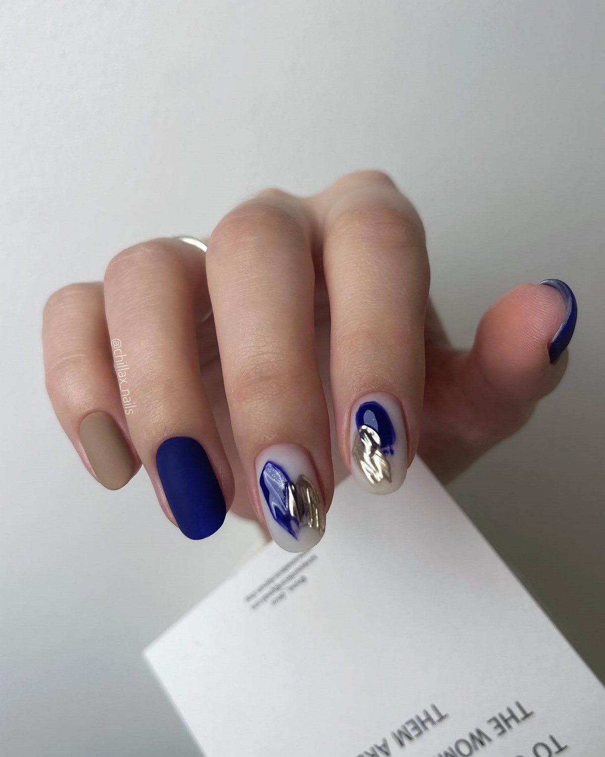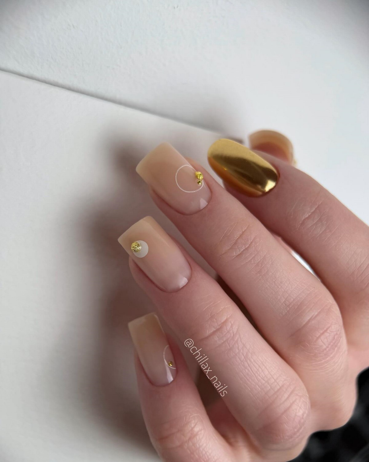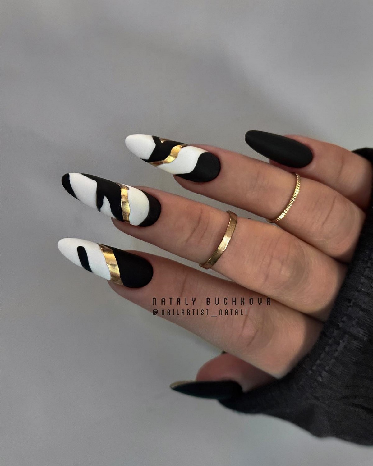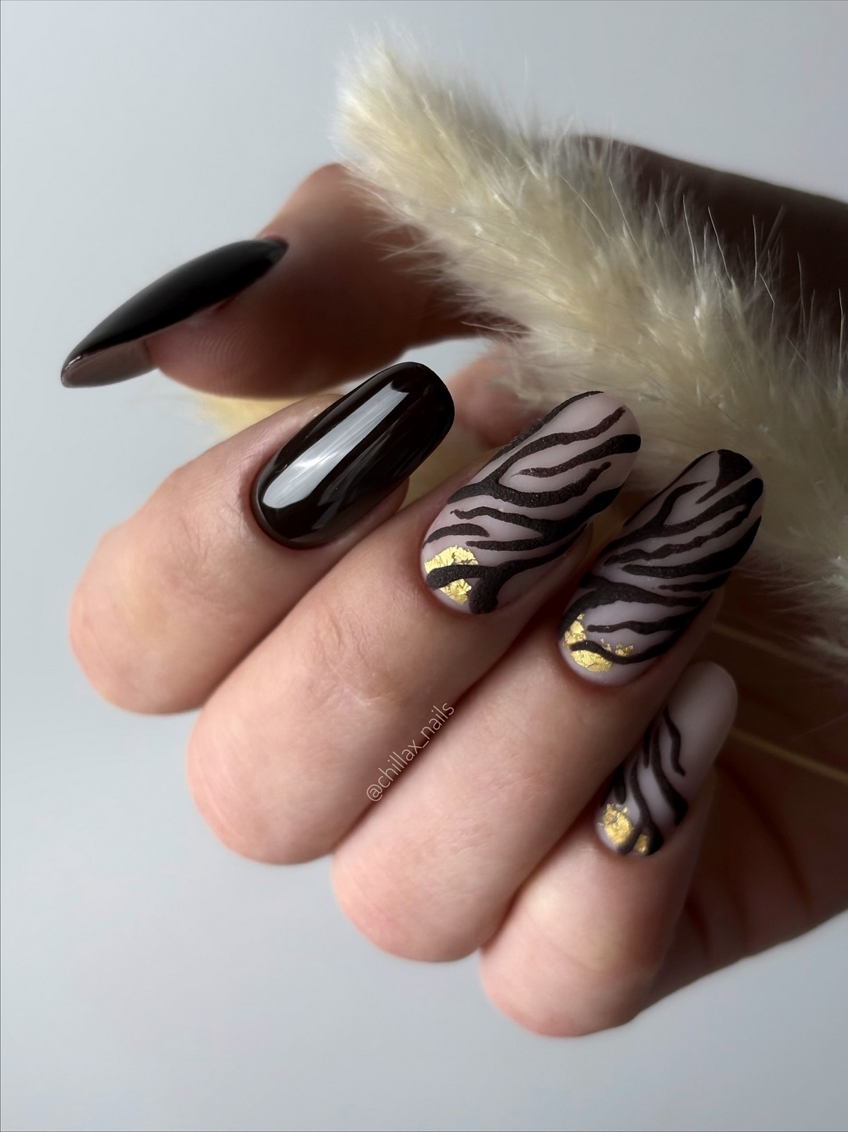 Золоті текстури найкраще розкриваються на однотонних темних покриттях, наприклад, шоколадному чи грифельному. Також модним вибором стануть холодні відтінки золота, які чудово поєднуються з сірими та молочними лаками. Дизайн виглядає сучасно та артистично, підкреслюючи індивідуальний стиль своєї власниці. Взимку такі варіанти особливо актуальні завдяки святковому сяйву.
