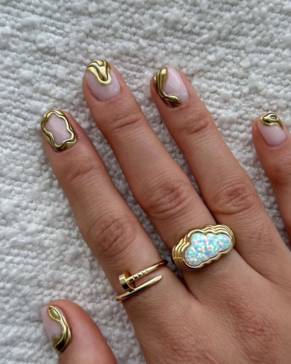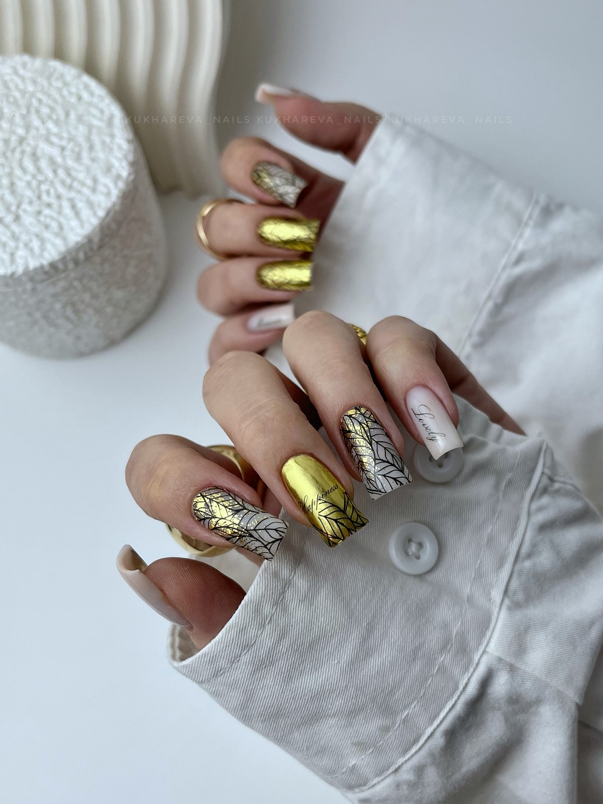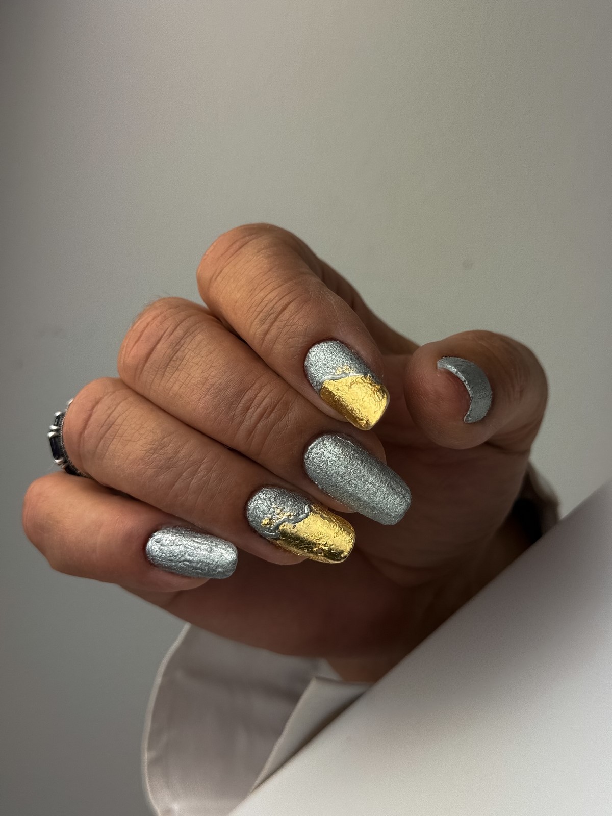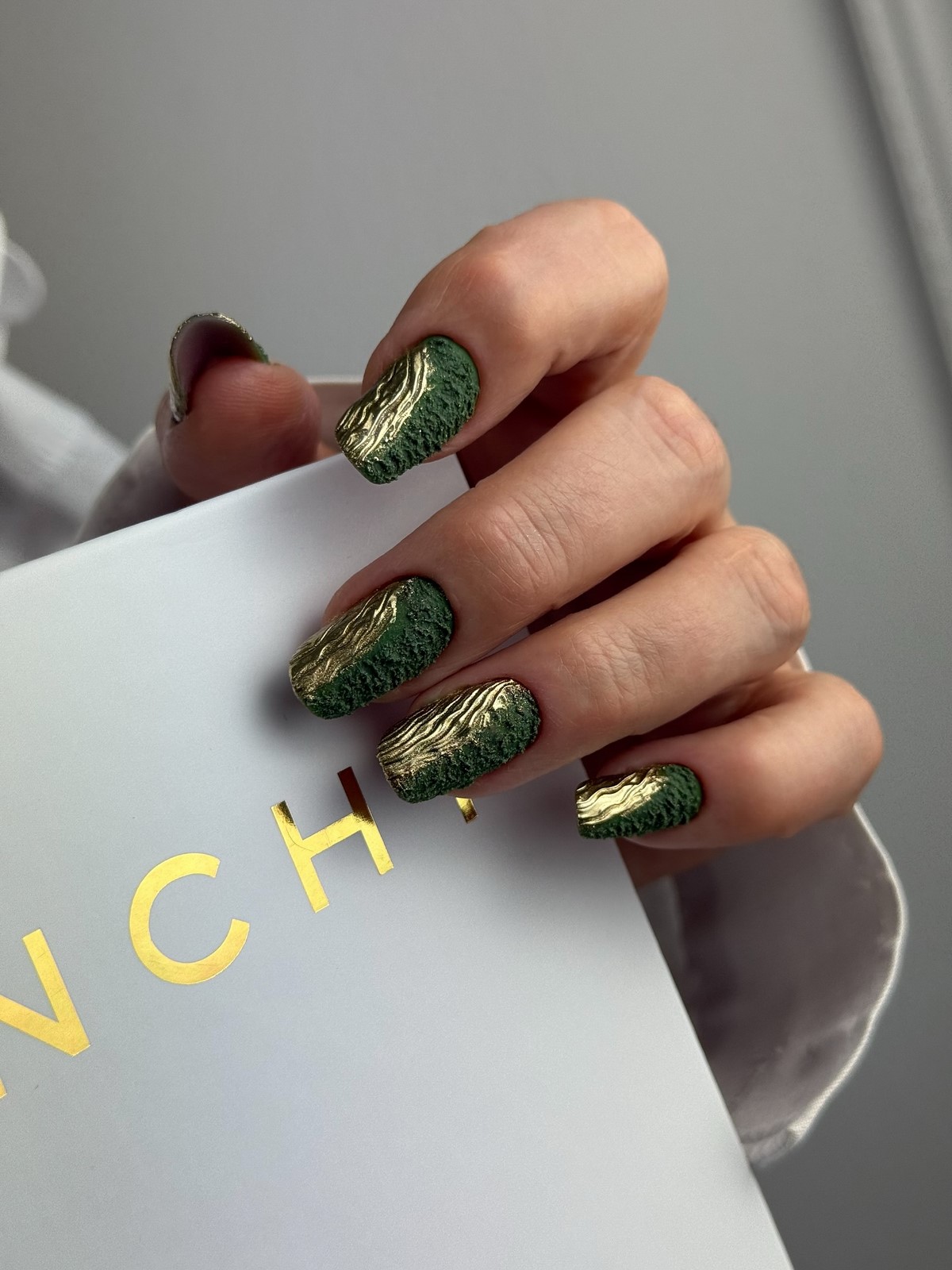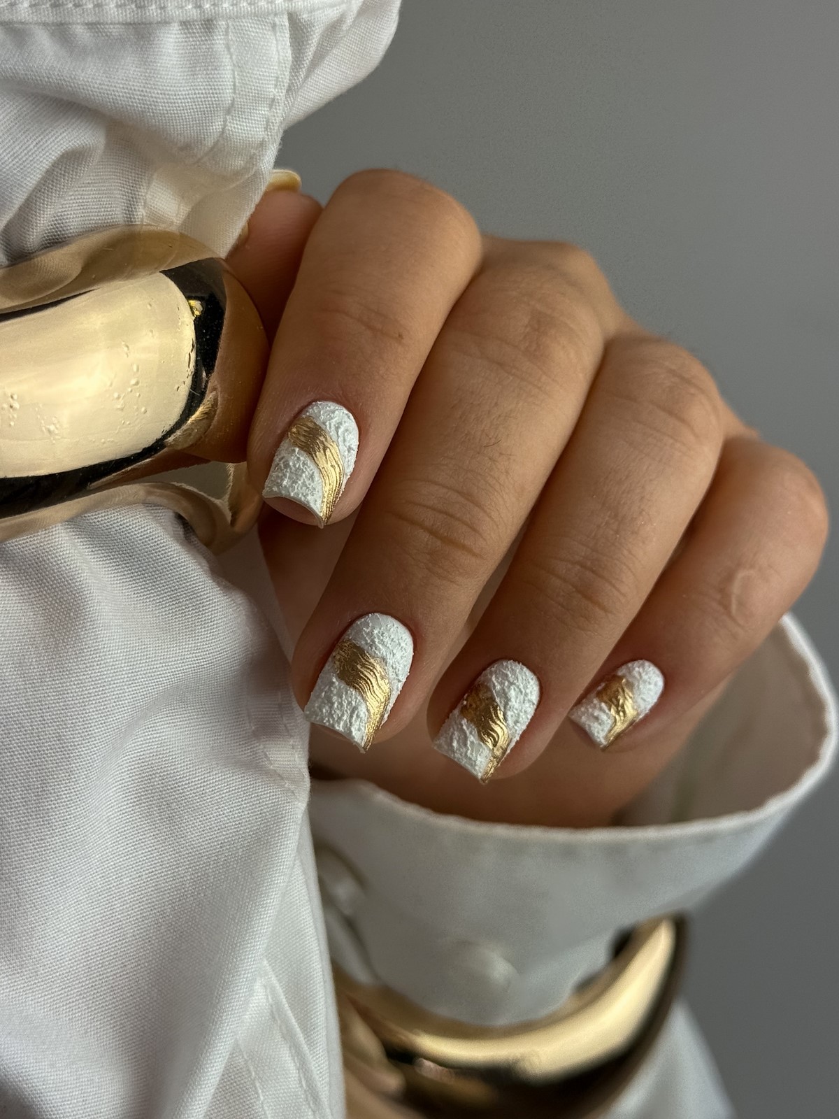 Якщо сусальне золото — це про індивідуальні форми, то золоті текстури — про гру поверхонь і складних блискучих ефектів. Дизайнери пропонують варіанти з ефектом потертостей, золотого піску, фольгованих мазків та крихти металу. Такі текстури створюють цікаву багатошаровість, роблячи манікюр глибоким та оригінальним.