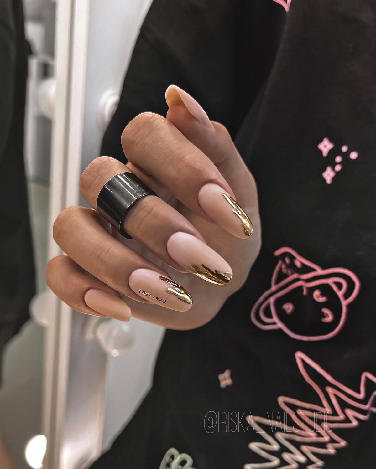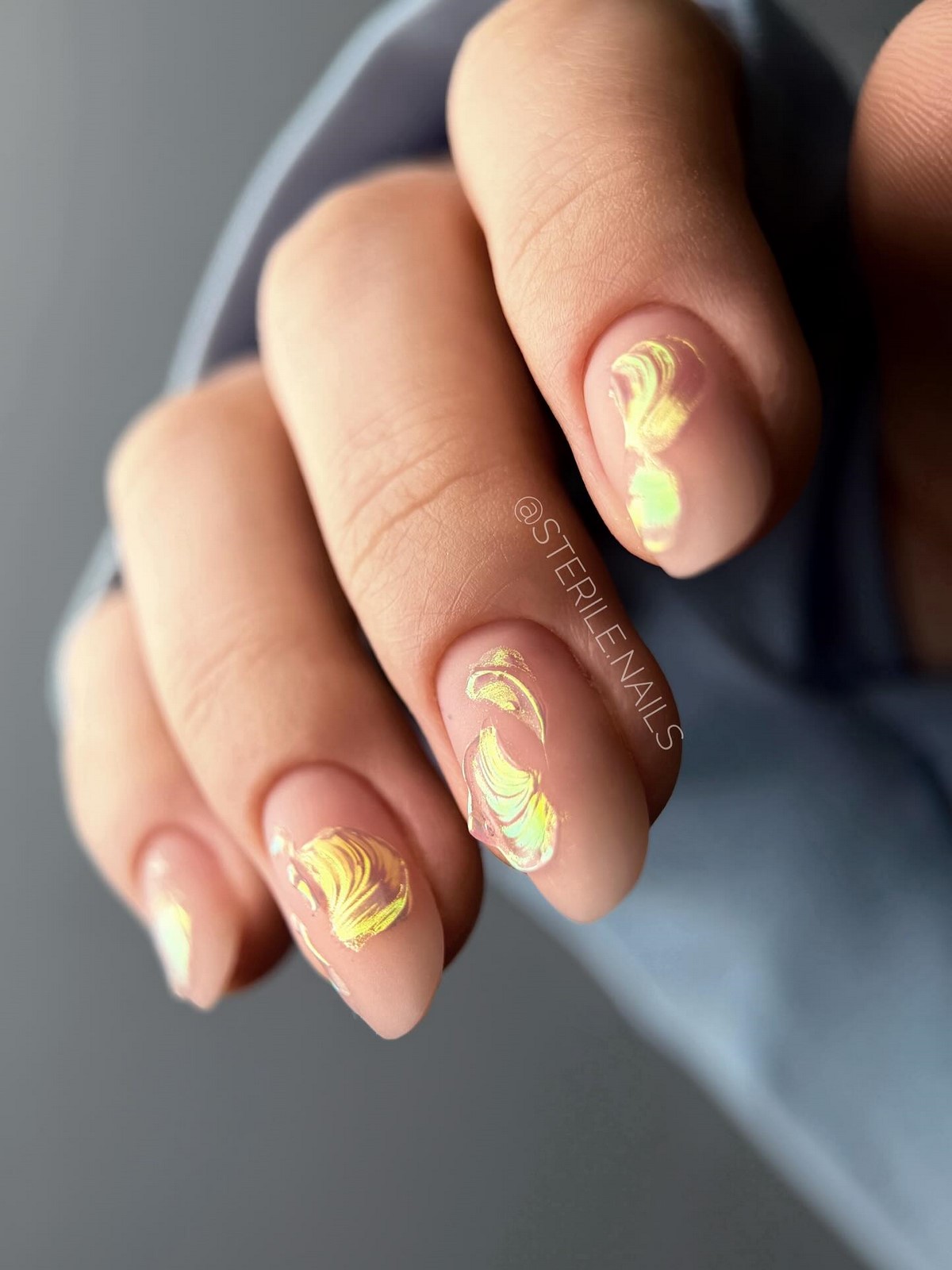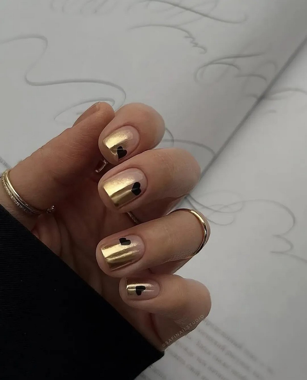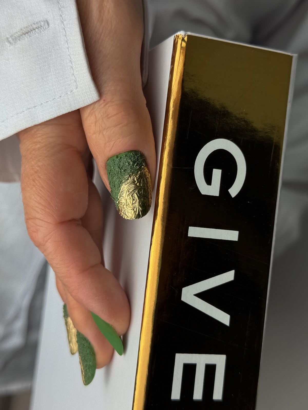 Якщо сусальне золото — це про індивідуальні форми, то золоті текстури — про гру поверхонь і складних блискучих ефектів. Дизайнери пропонують варіанти з ефектом потертостей, золотого піску, фольгованих мазків та крихти металу. Такі текстури створюють цікаву багатошаровість, роблячи манікюр глибоким та оригінальним.