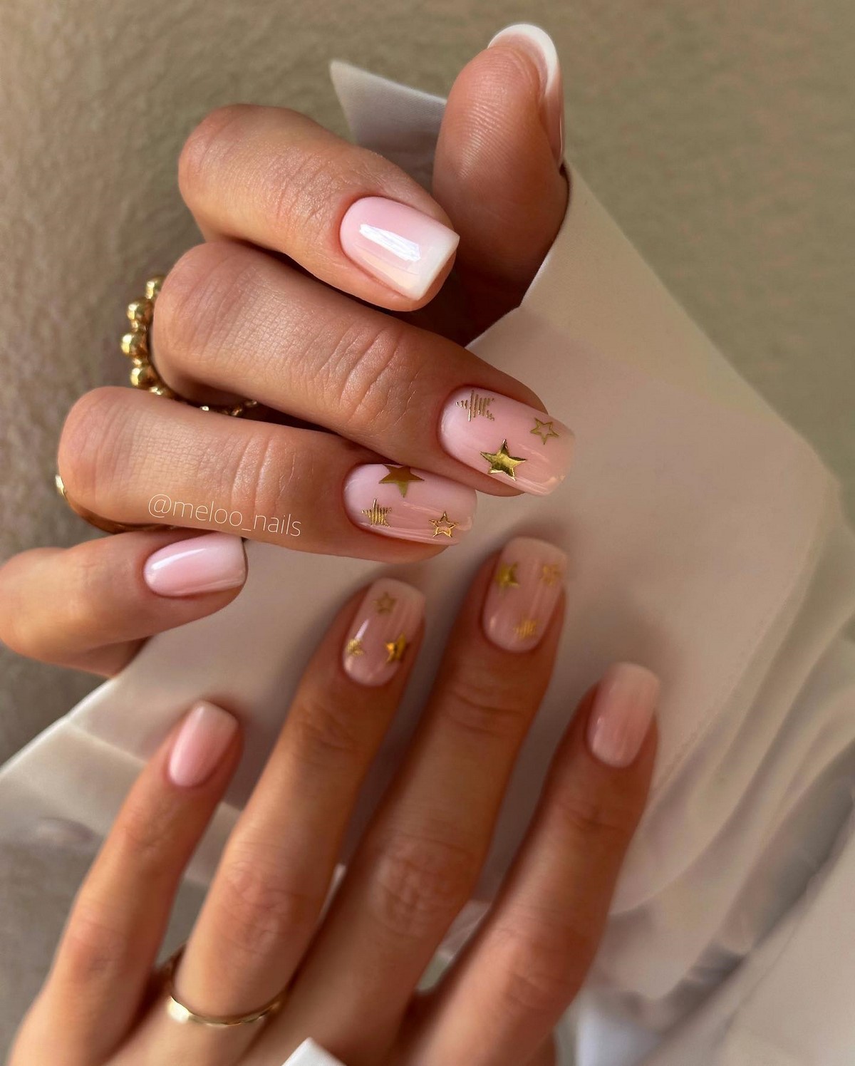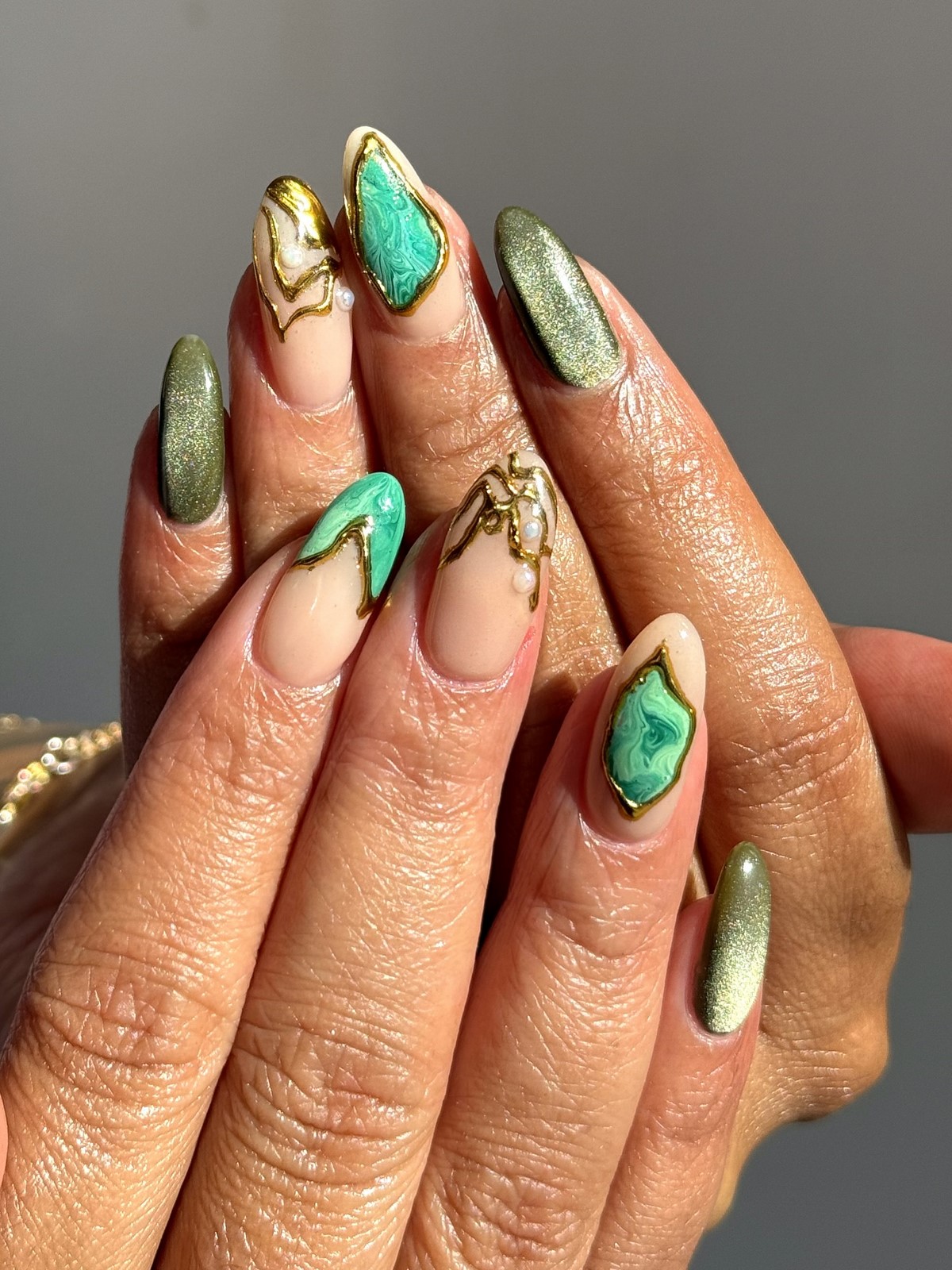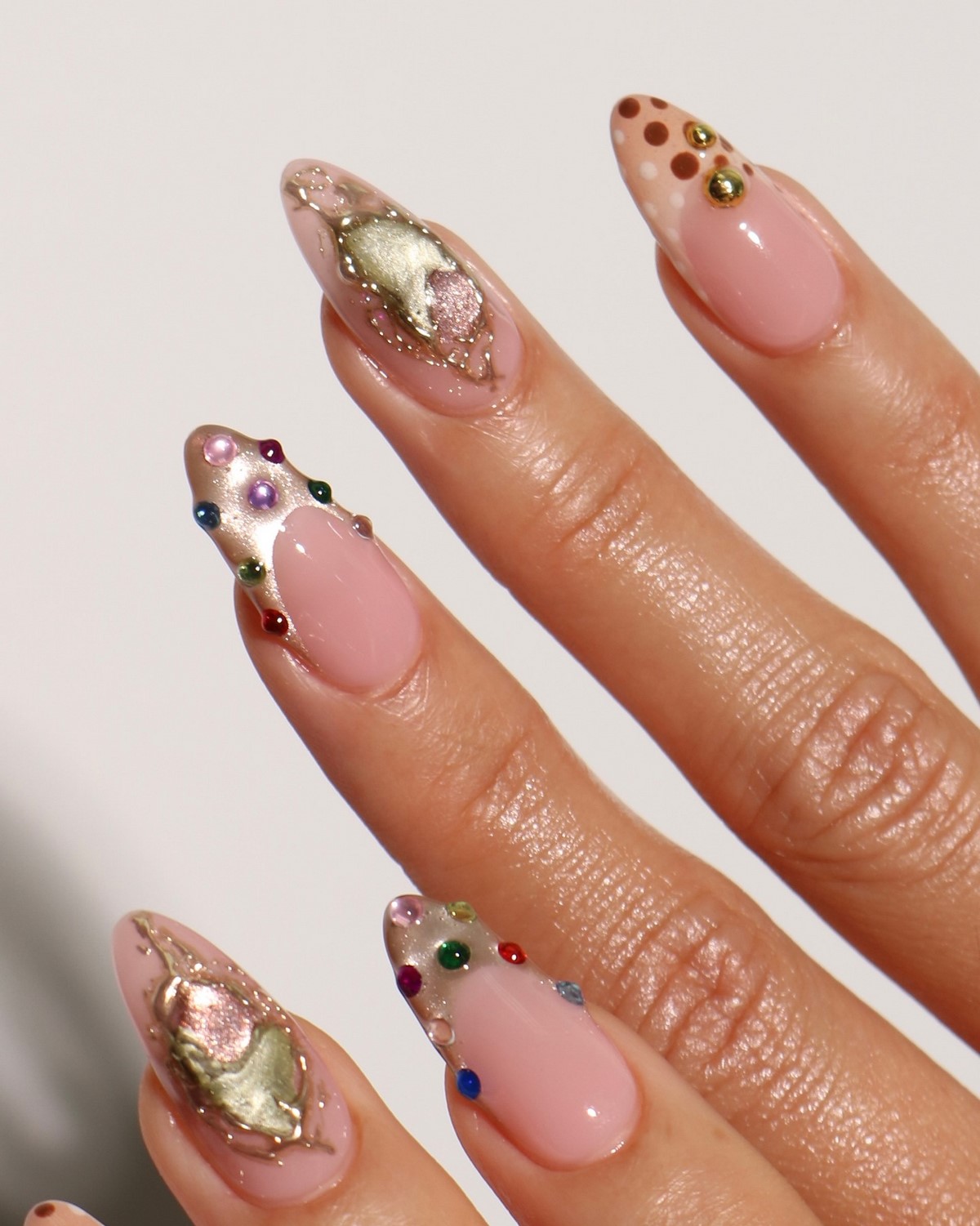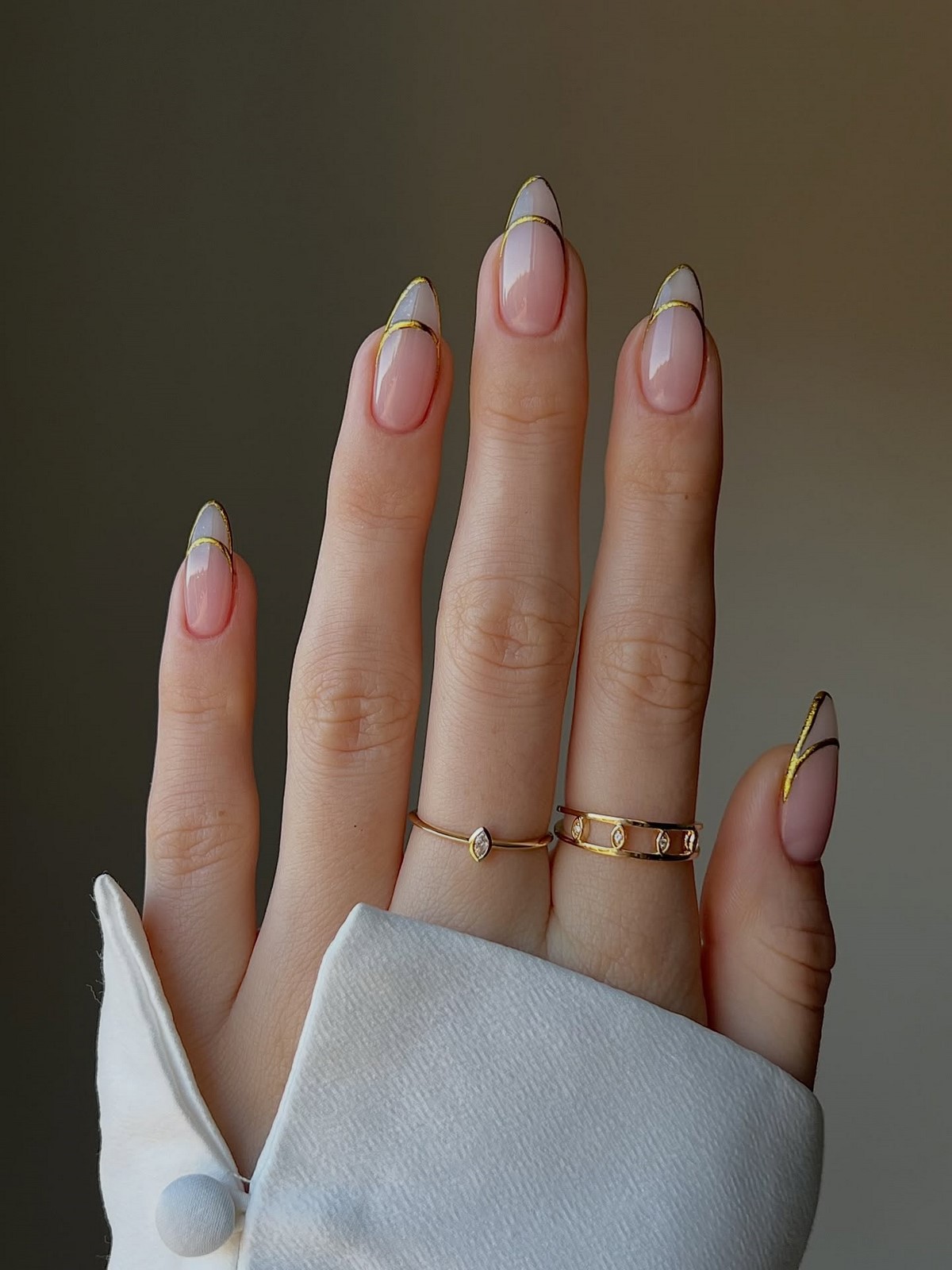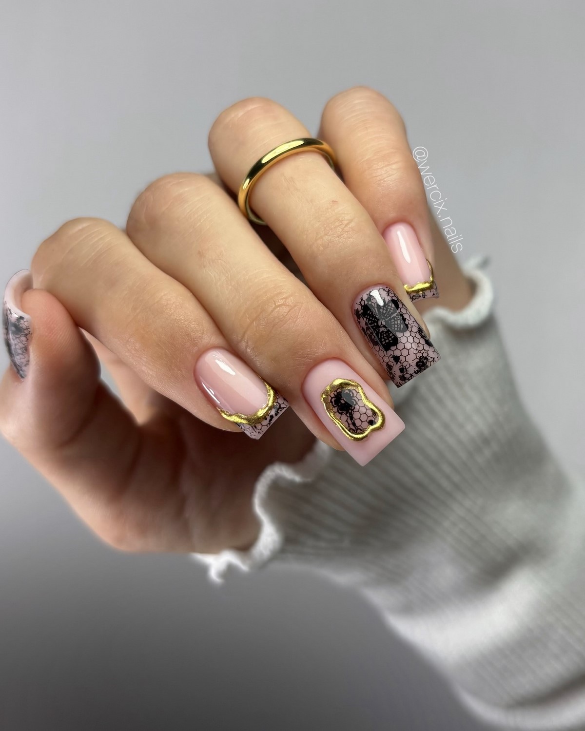 Якщо сусальне золото — це про індивідуальні форми, то золоті текстури — про гру поверхонь і складних блискучих ефектів. Дизайнери пропонують варіанти з ефектом потертостей, золотого піску, фольгованих мазків та крихти металу. Такі текстури створюють цікаву багатошаровість, роблячи манікюр глибоким та оригінальним.