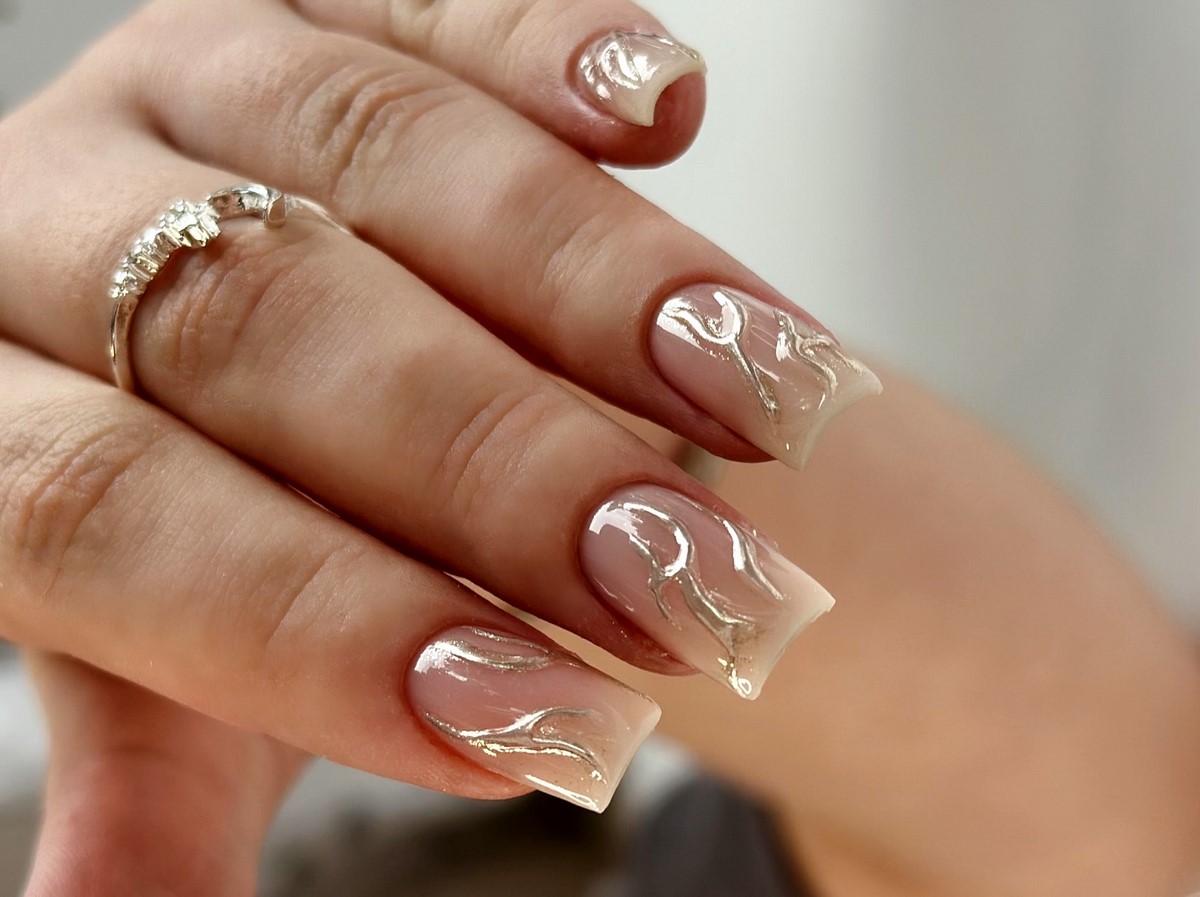 Ефект рідкого металу став головним відкриттям зимових трендів, адже поєднує гладкість, дзеркальність і скульптурність. Такий манікюр створює враження, ніби на поверхню нігтя нанесено краплі розплавленого срібла чи сталі. Майстри досягають цього результату завдяки спеціальним гелям з металічним блиском, які лягають об’ємно та з легким рельєфом. Рідкий метал ідеально підходить для коротких і середніх нігтів, додаючи образу сучасності та яскравого хромового акценту.
