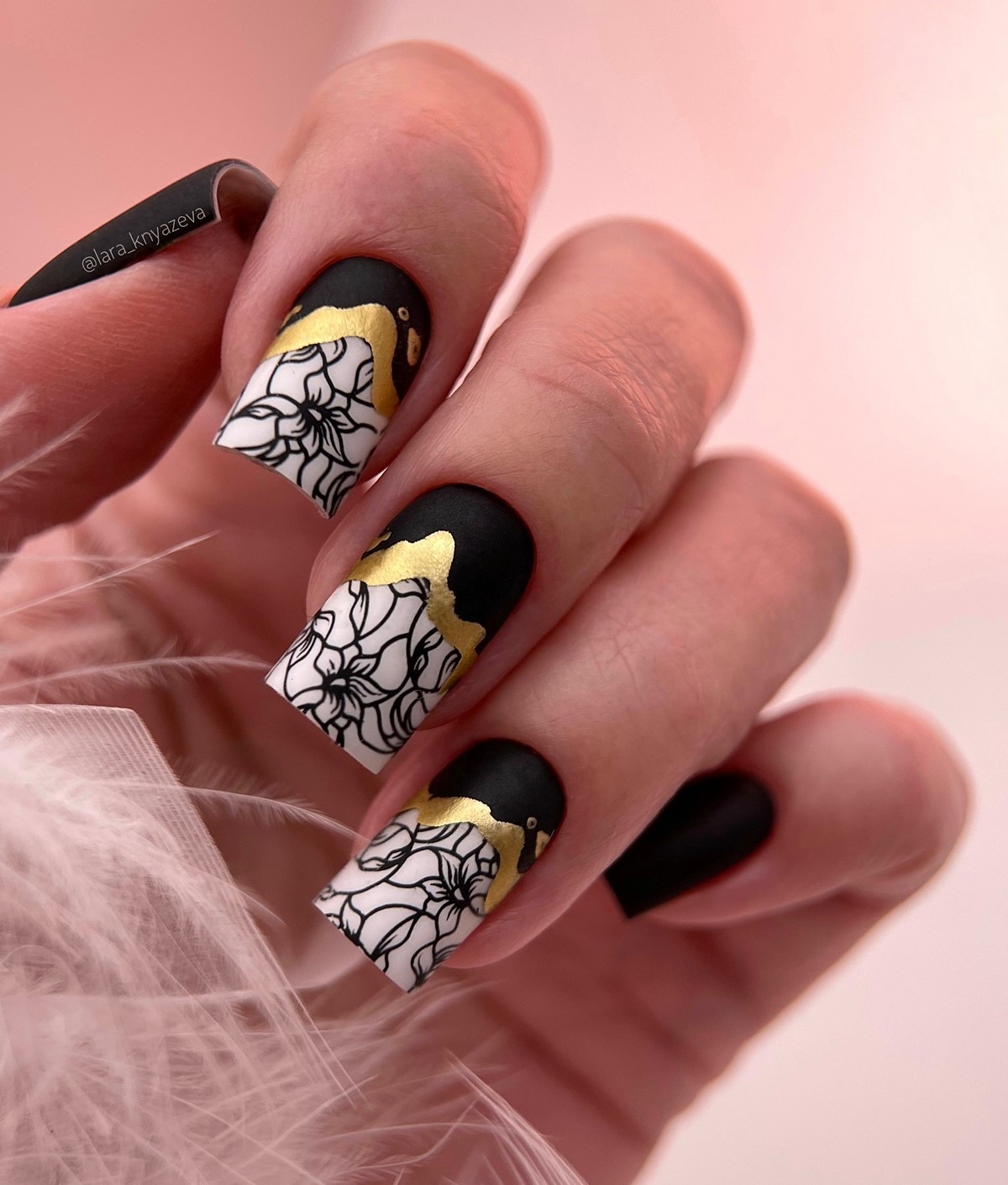 Одна з особливостей цього дизайну — його універсальність та художність. Він чудово виглядає на темних базах: чорному, бордовому, смарагдовому чи синьому глибокому. Також золото гармонійно поєднується з пастельними зимовими відтінками, такими як молочний або пудрово-рожевий. Сусальне золото робить манікюр статусним і візуально дорогим, що ідеально підходить для зимових вечірок.