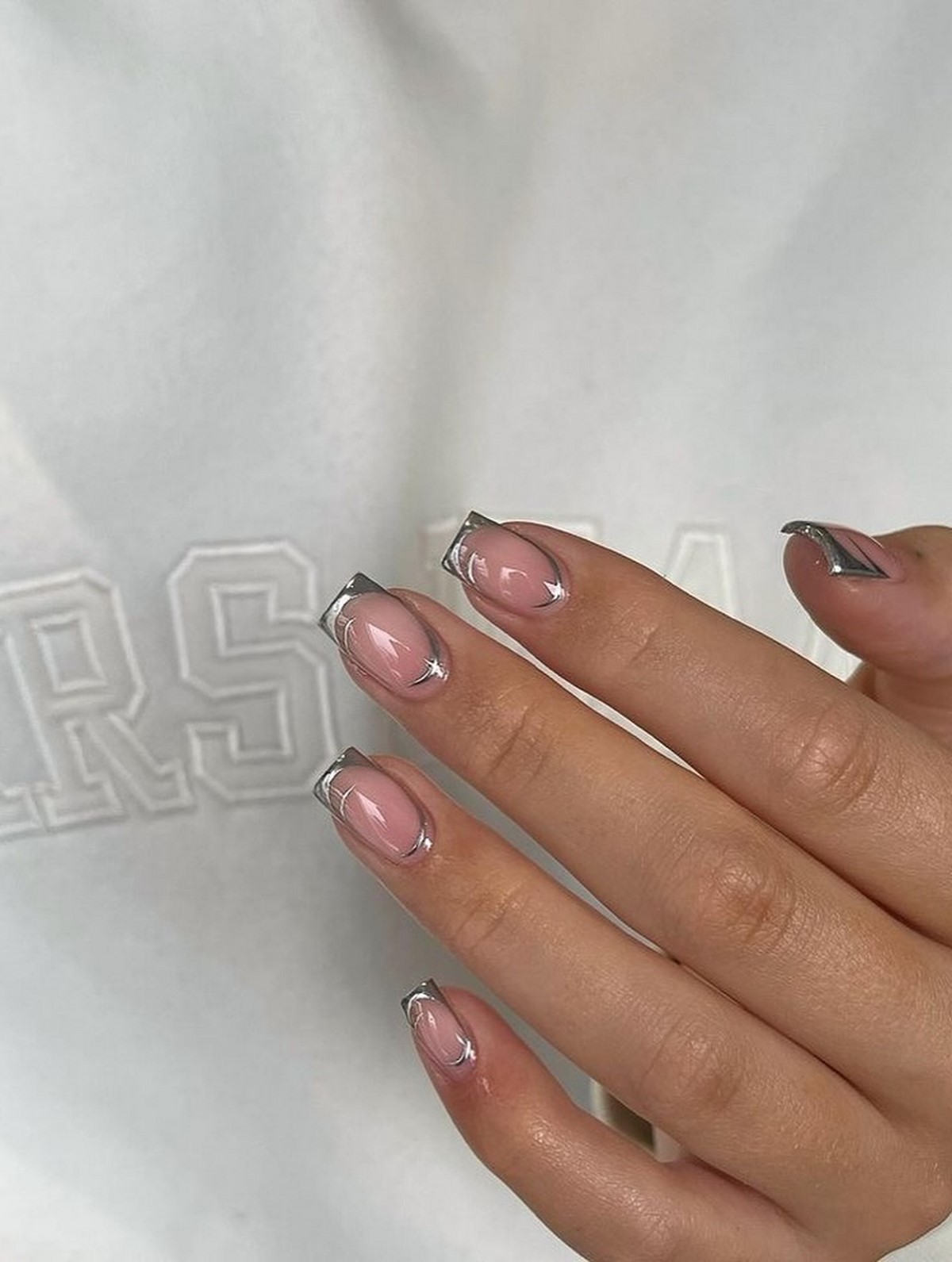 Класичний французький манікюр у новому сезоні отримує модернізоване звучання — металеві кінчики замість білого. Такий френч виглядає стильно та аристократично, особливо у поєднанні з молочними, нюдовими або напівпрозорими базовими відтінками. Металевий край додає дизайну графічності й витонченого блиску, але не перевантажує загальну композицію.
