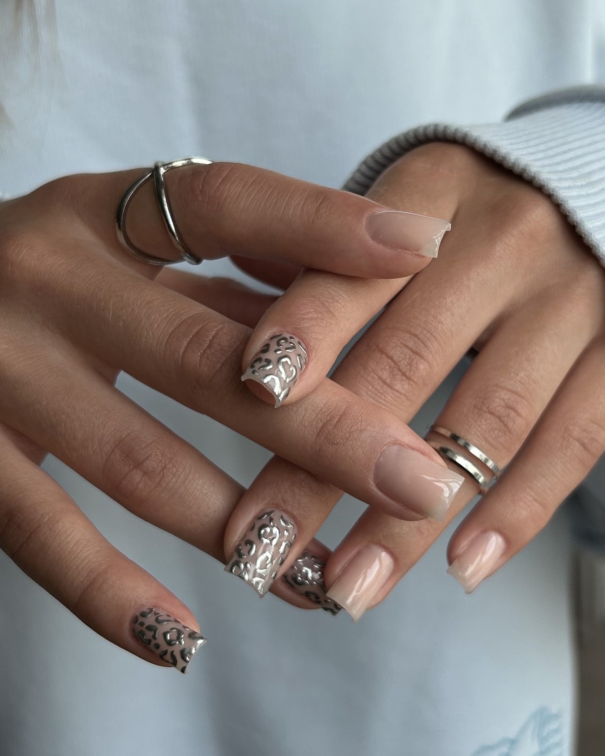 Металевий градієнт — це свіжий погляд на омбре, яке поєднує ніжність переходу та дзеркальний блиск. Сучасні техніки дозволяють створити плавний перехід між різними металевими відтінками — від платинових до золотистих. Такий манікюр виглядає футуристично, але водночас елегантно, що робить його чудовим вибором для зими.