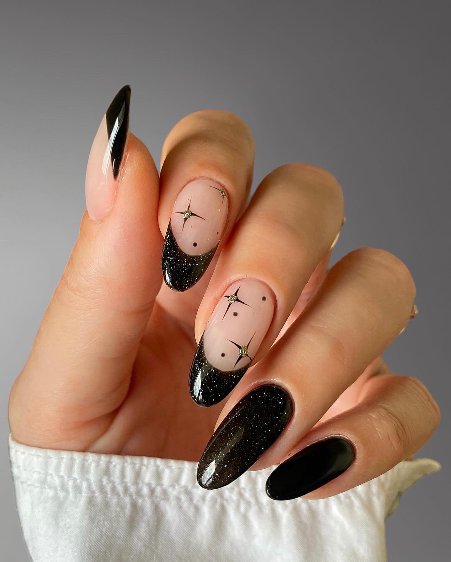Чорний френч стає одним з найефектніших трендів лютого 2026 року. Сяючий чорний край нігтя поєднується з нюдовою основою, прикрашеною мініатюрними зірками або точковими акцентами.