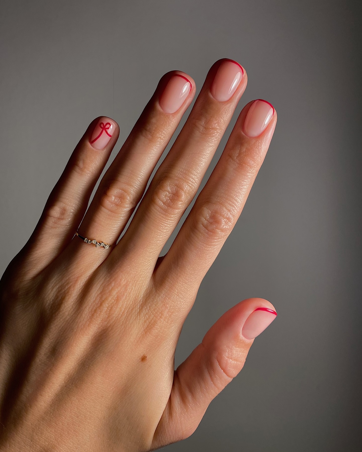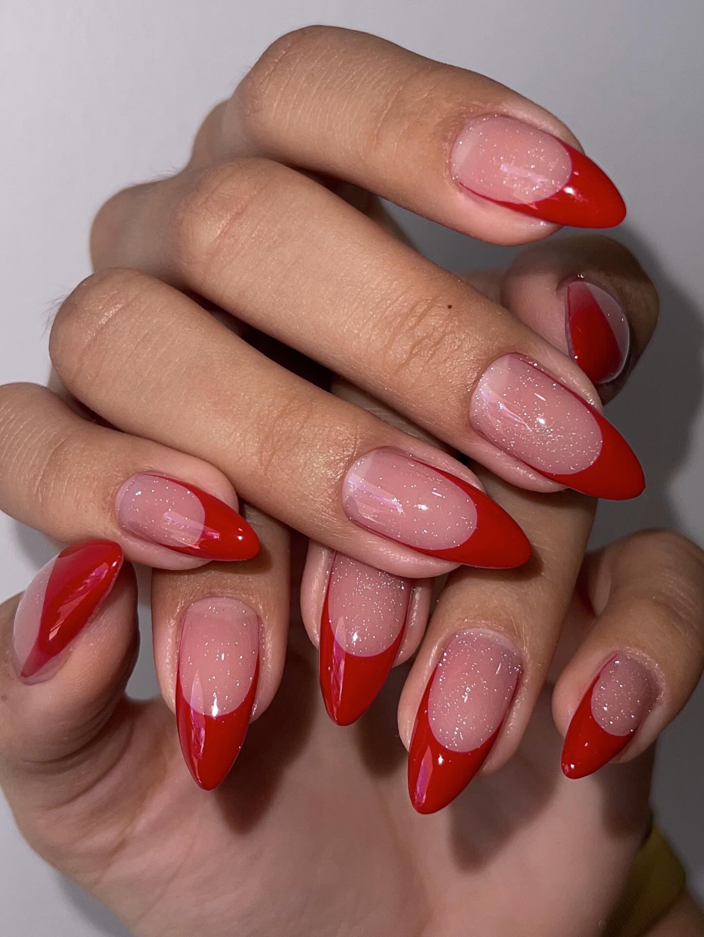 Класичний червоний френч в лютому 2026 року отримує нове прочитання. Замість щільної бази використовується нюд з мікросяйвом, а лінія посмішки виконується в насиченому червоному відтінку.