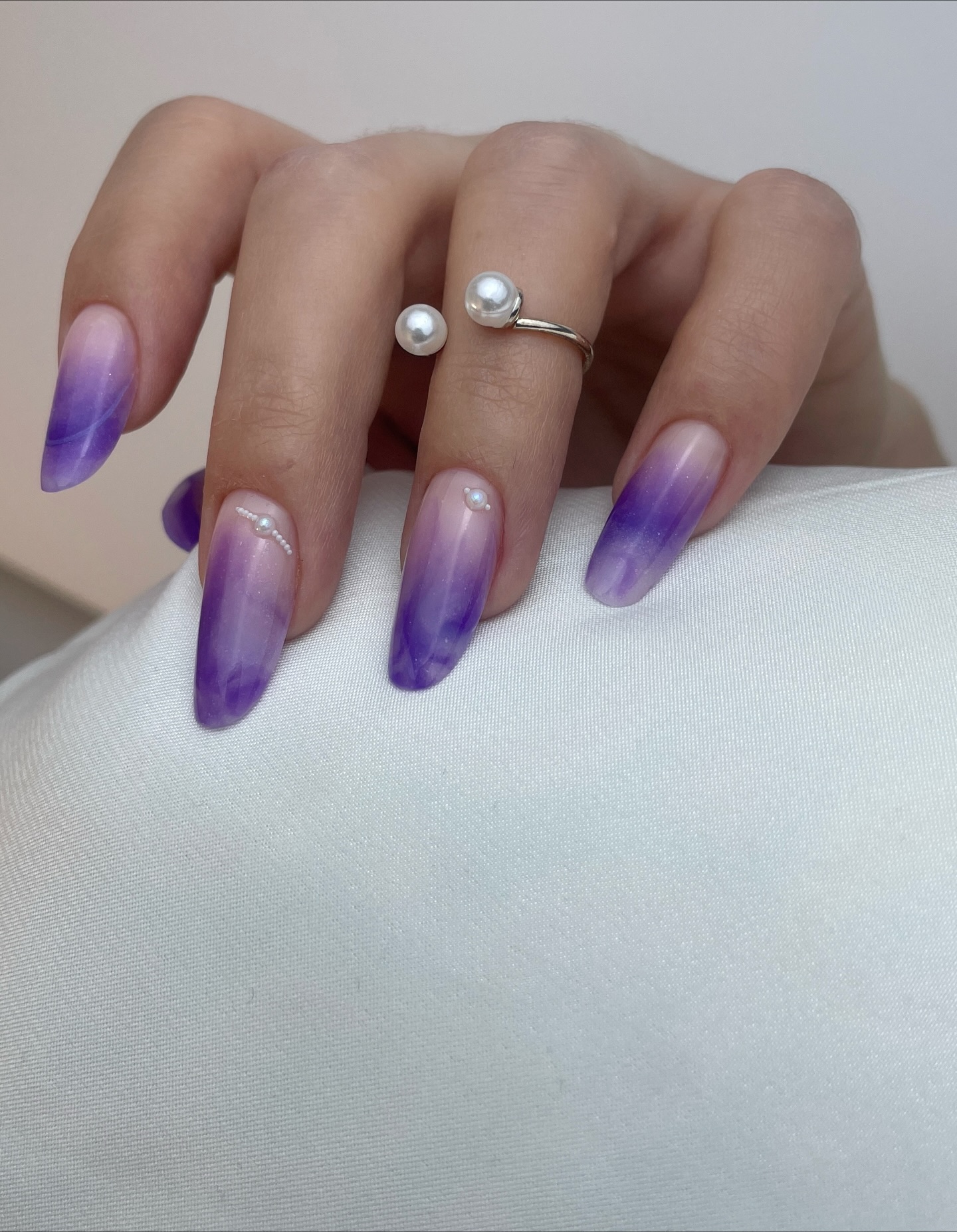 Градієнт в лютому 2026 року стає більш делікатним і повітряним. Плавні переходи відтінків доповнюються мікроперлами, які додають дизайну глибину і м’яке сяйво. Найчастіше перли розміщують біля кутикули або по лінії градієнта, створюючи ефект витонченої прикраси.