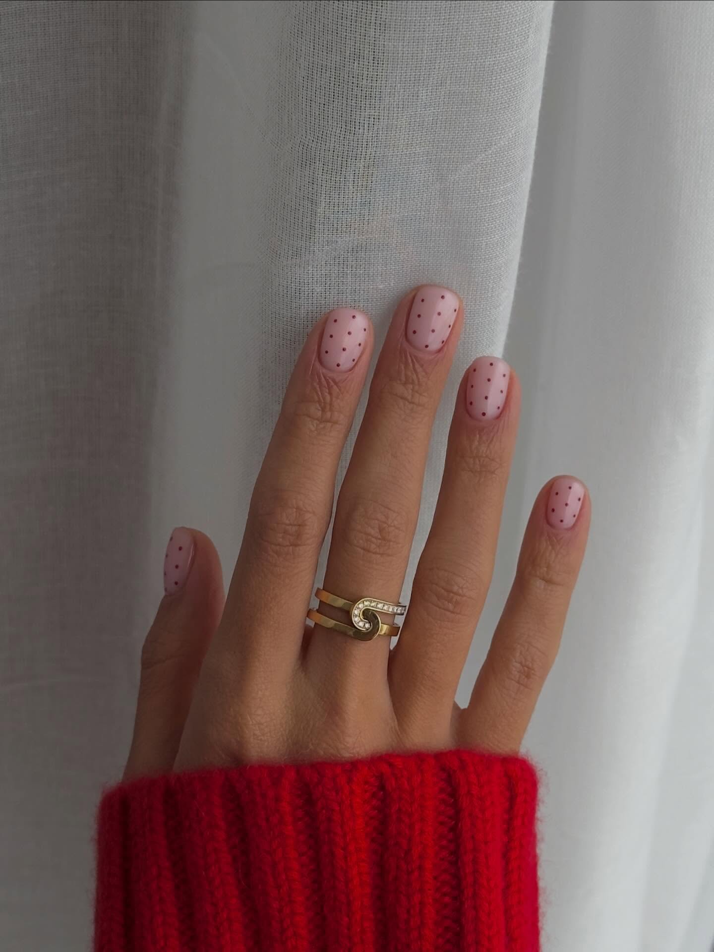 Мікрогорох стає справжнім фаворитом лютого 2026 року. Дрібні крапки виглядають ніжно і ненав’язливо, створюючи ефект ретро в сучасній інтерпретації. Найчастіше використовують контрастний, але м’який колір крапок на нюдовій або молочній основі.