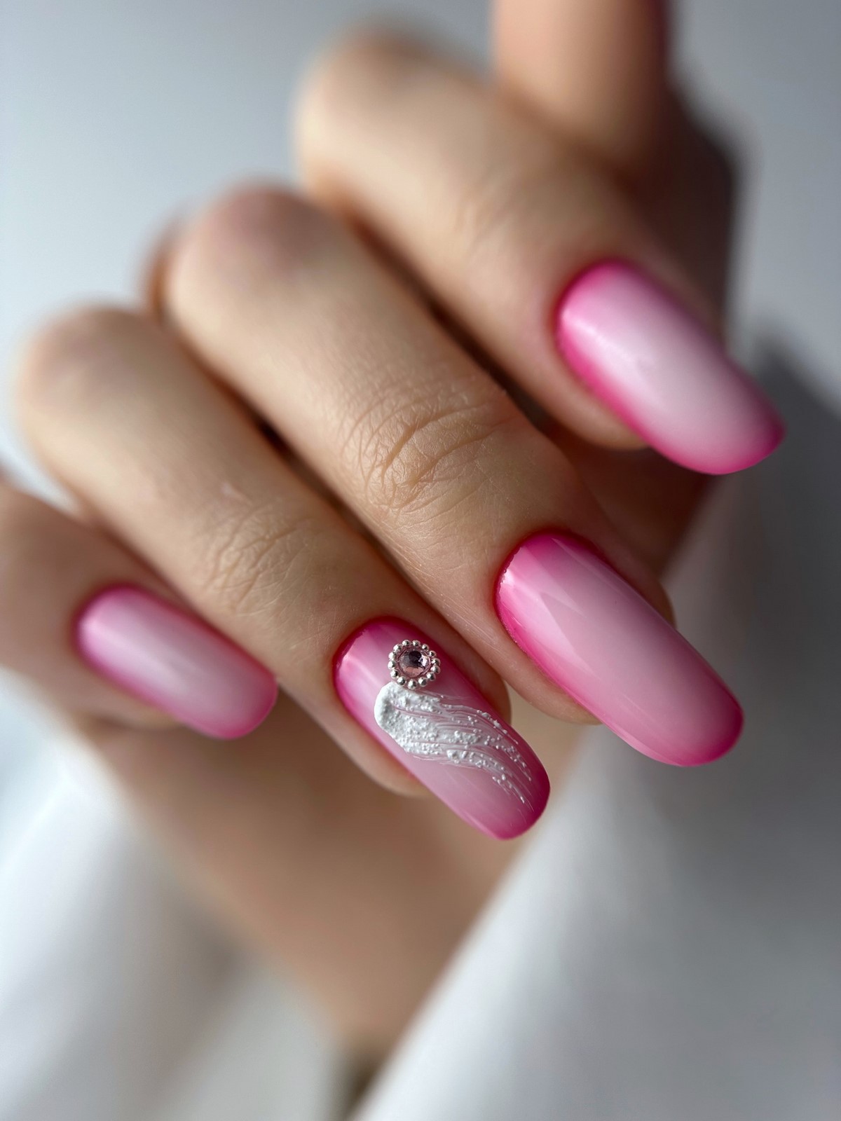 Аура і градієнт використовуються для створення плавних переходів кольору. У тренді м’які, розтушовані межі і спокійні відтінки. Такий манікюр виглядає сучасно і добре поєднується з мінімалістичним стилем.