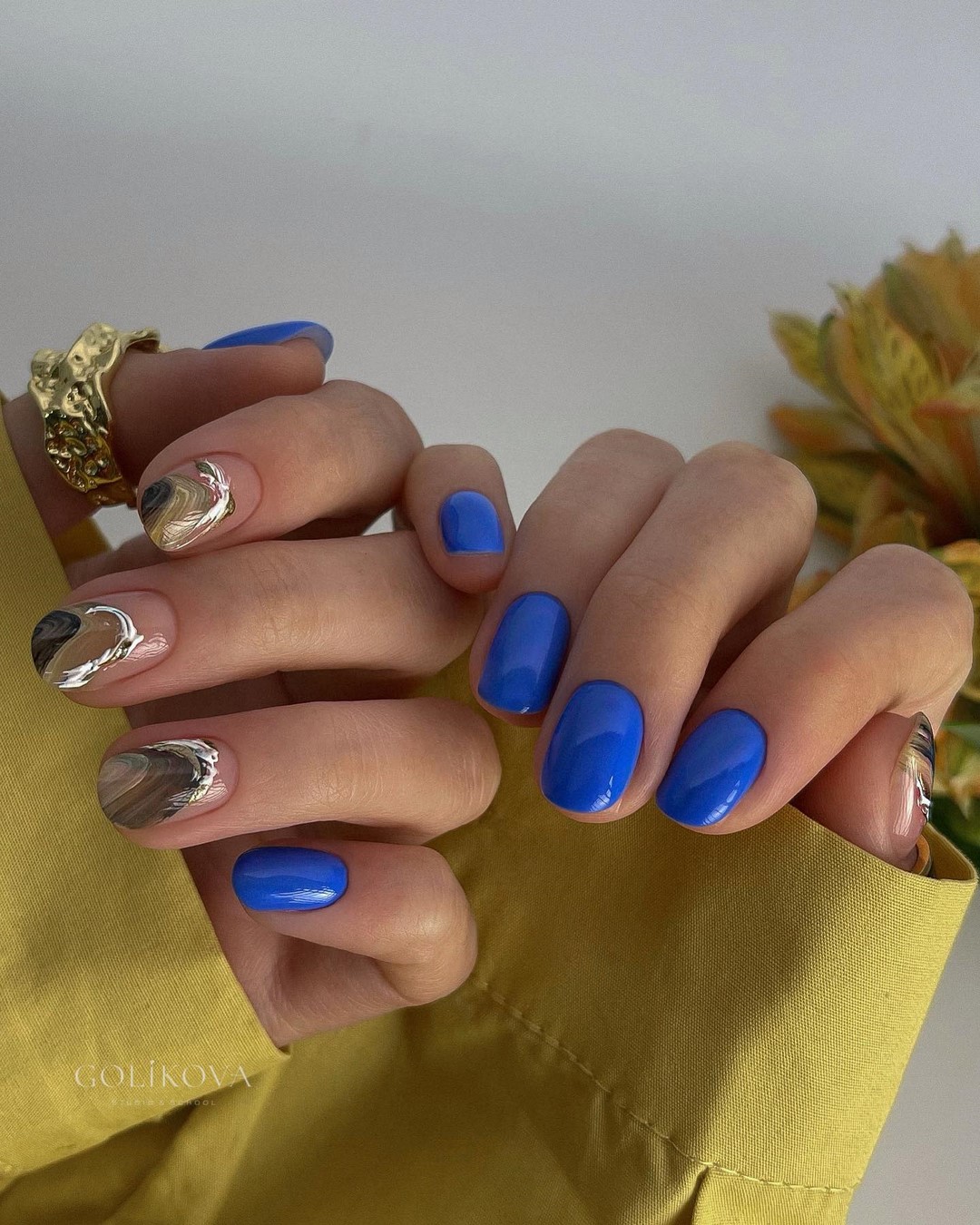 Золоті акценти або блискітки додають нотку розкоші, особливо в поєднанні з темними відтінками. Геометричні малюнки або мінімалістичні дизайни з використанням цих кольорів підкреслять вишуканість осіннього манікюру.