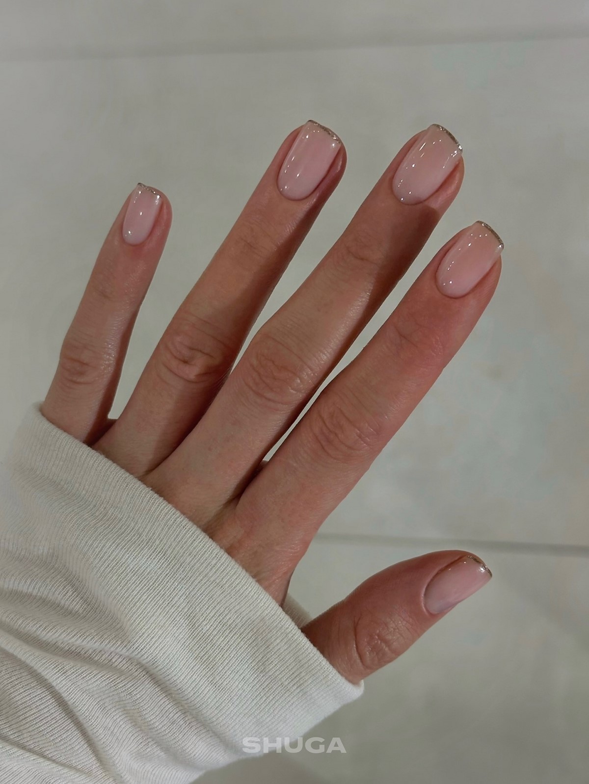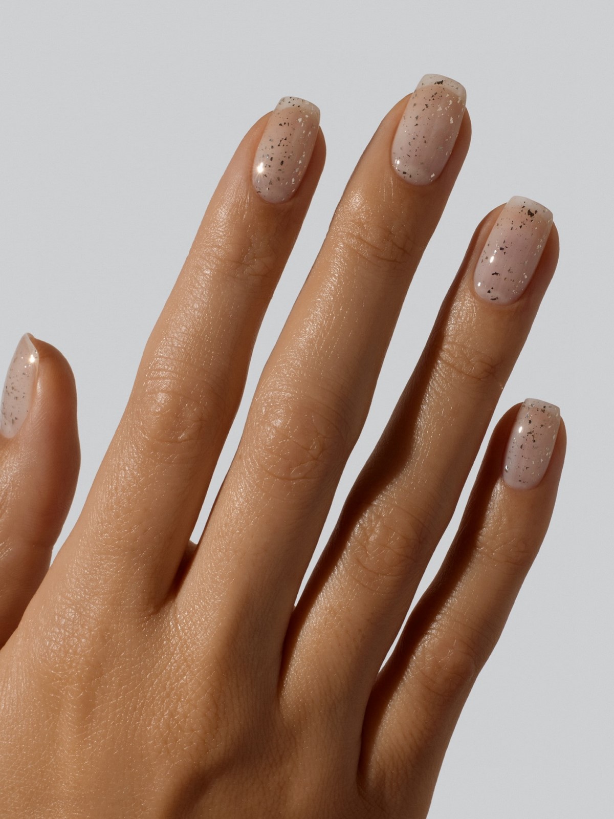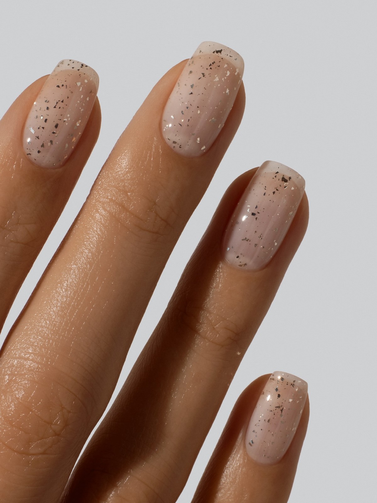 Напівпрозора база з мікроблискітками виглядає ніжно і делікатно. Блискітки можуть бути ледь помітними, створюючи ефект снігового сяйва. Такий манікюр відмінно підходить для зимових свят і при цьому залишається стриманим і стильним.