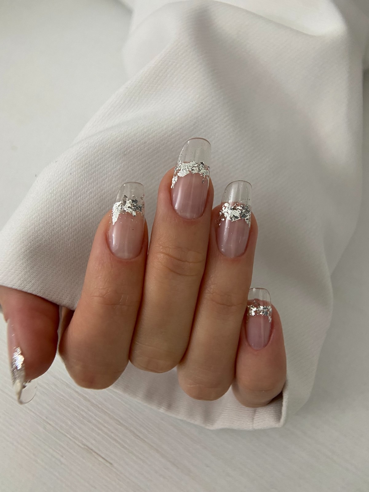 Зимовий френч на напівпрозорій основі набуває нового звучання. Замість класичної білої лінії використовуються молочні, сріблясті або ледь помітні блискучі відтінки. Такий френч виглядає сучасно і легко вписується в зимовий гардероб.