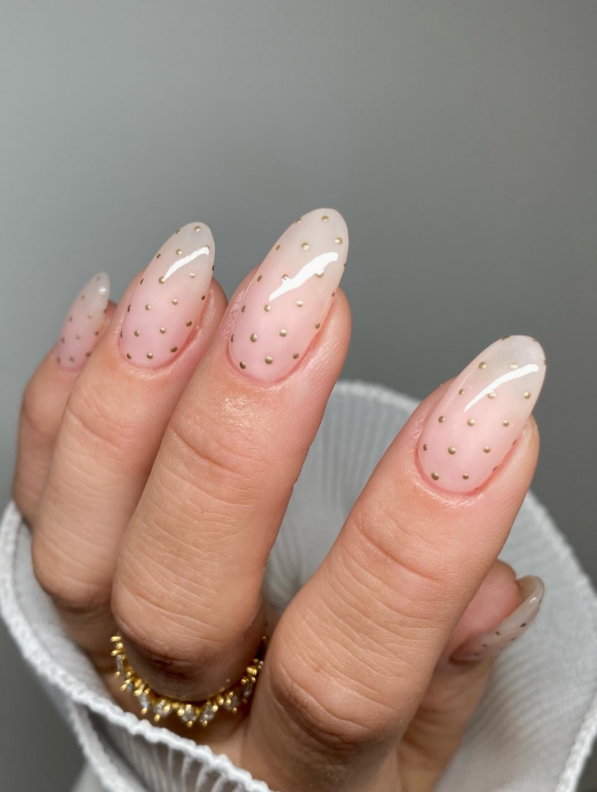 Ніжна прозора або молочна основа в поєднанні з мініатюрним золотим горошком виглядає витончено і святково. Такий дизайн додає легке сяйво, не перевантажуючи образ і не порушуючи баланс мінімалізму. Золоті крапки можуть розташовуватися хаотично або акуратно по лінії росту нігтя, створюючи ефект ювелірної роботи.