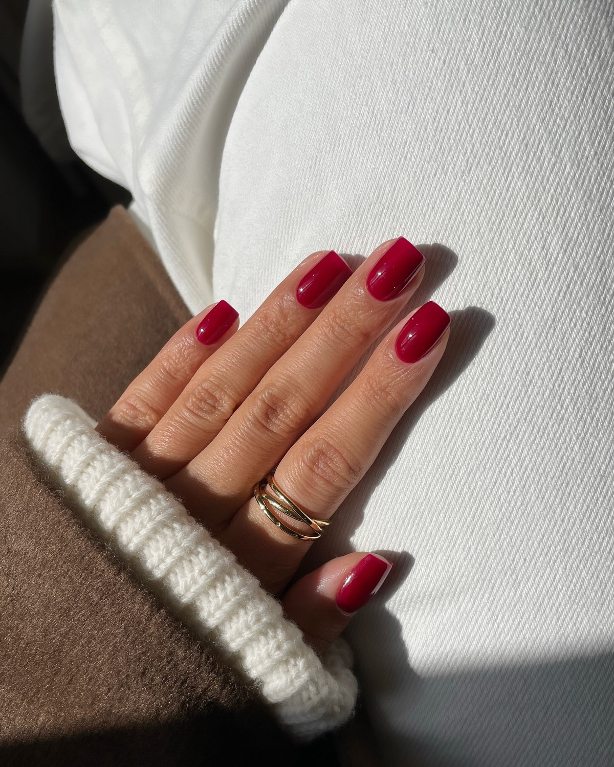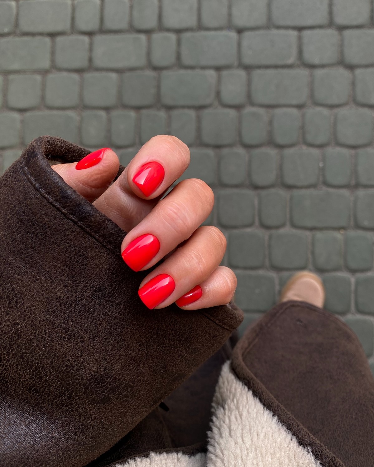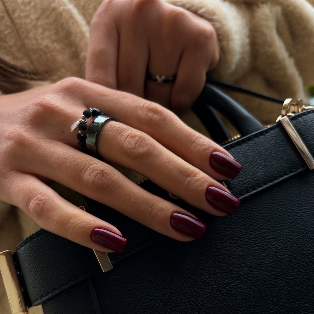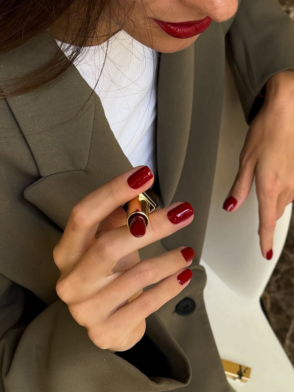Червоний — незмінна класика, але в сезоні 2025-2026 він набуває нової інтерпретації. Це не просто насичений червоний, а багаті винні, ягодні та рубінові варіації, які виглядають об’ємно та дорого. Взимку він стає символом енергії, пристрасті й святкового настрою, створюючи сильний акцент у будь-якому образі. Особливо ефектно червоний виглядає в глянцевому блиску або з мікро-бірюзовим гліттером, який додає холодного сяйва. Це відтінок для сміливих, стильних і впевнених у собі.