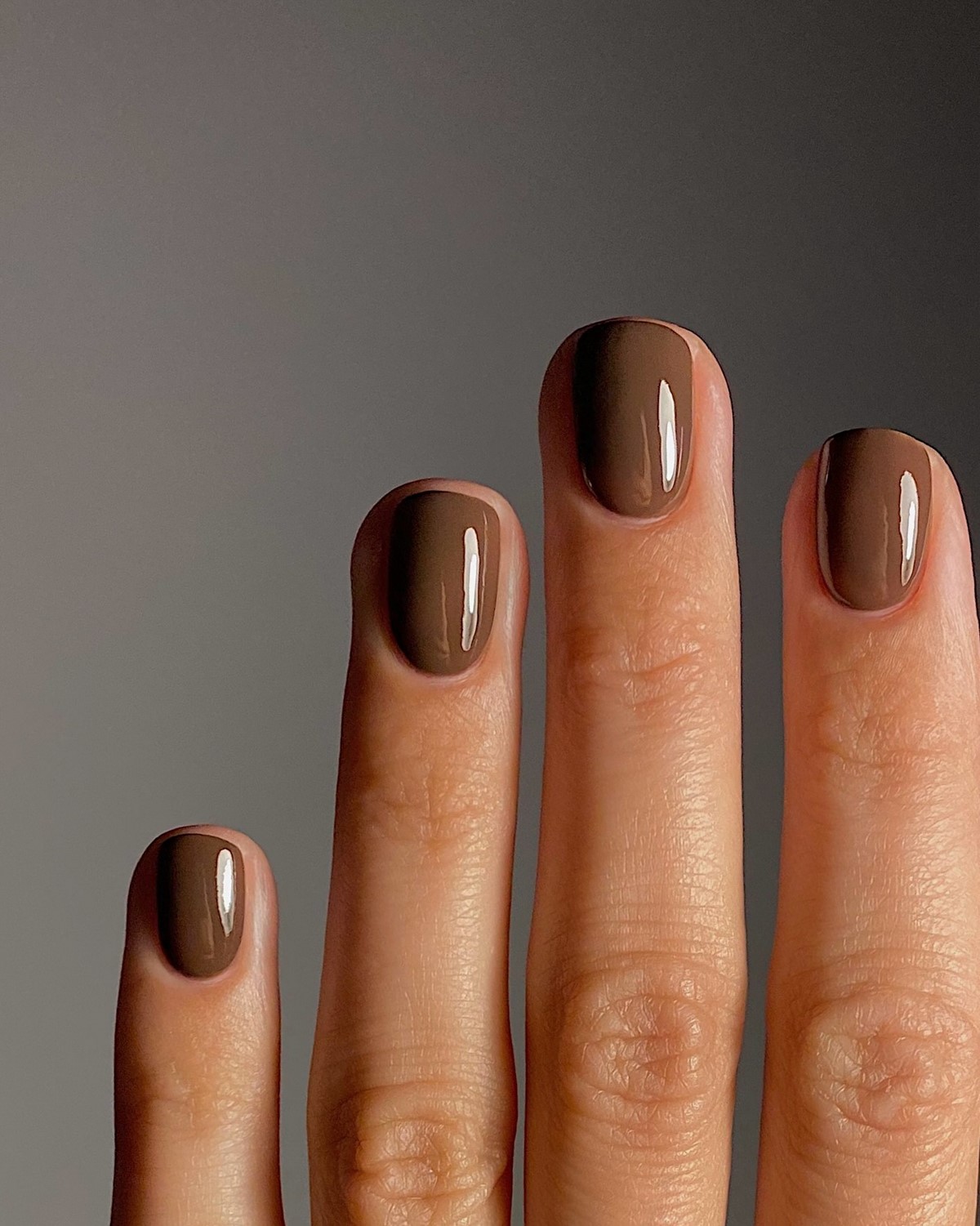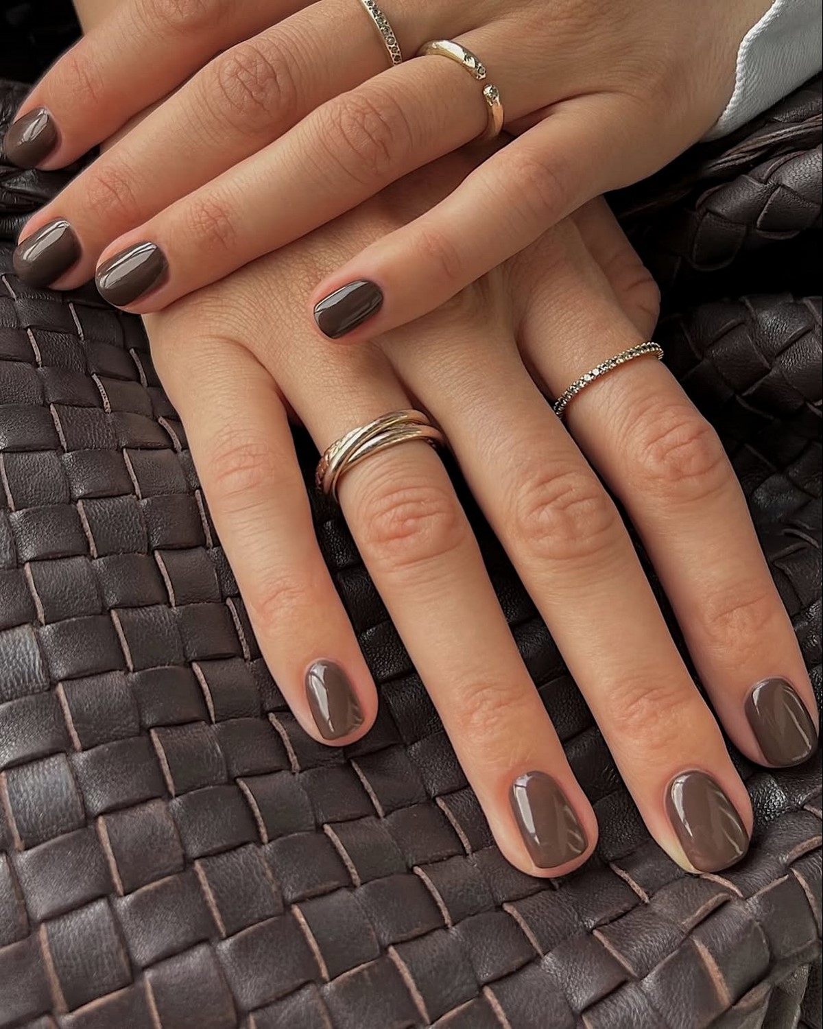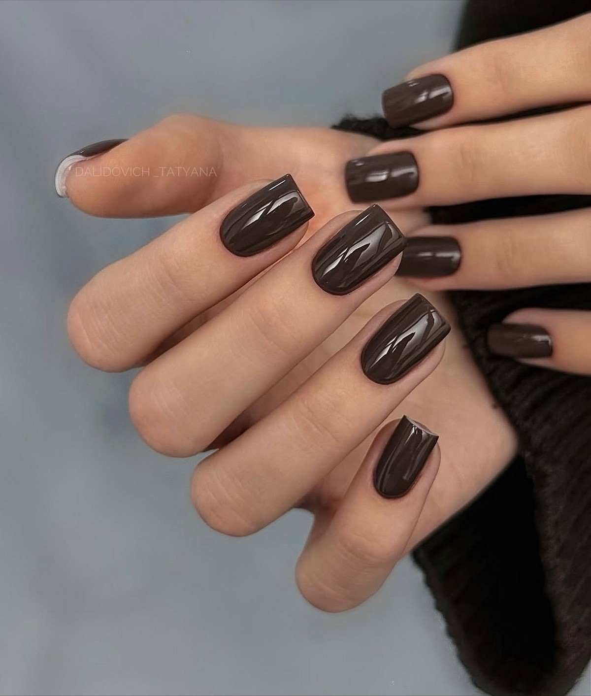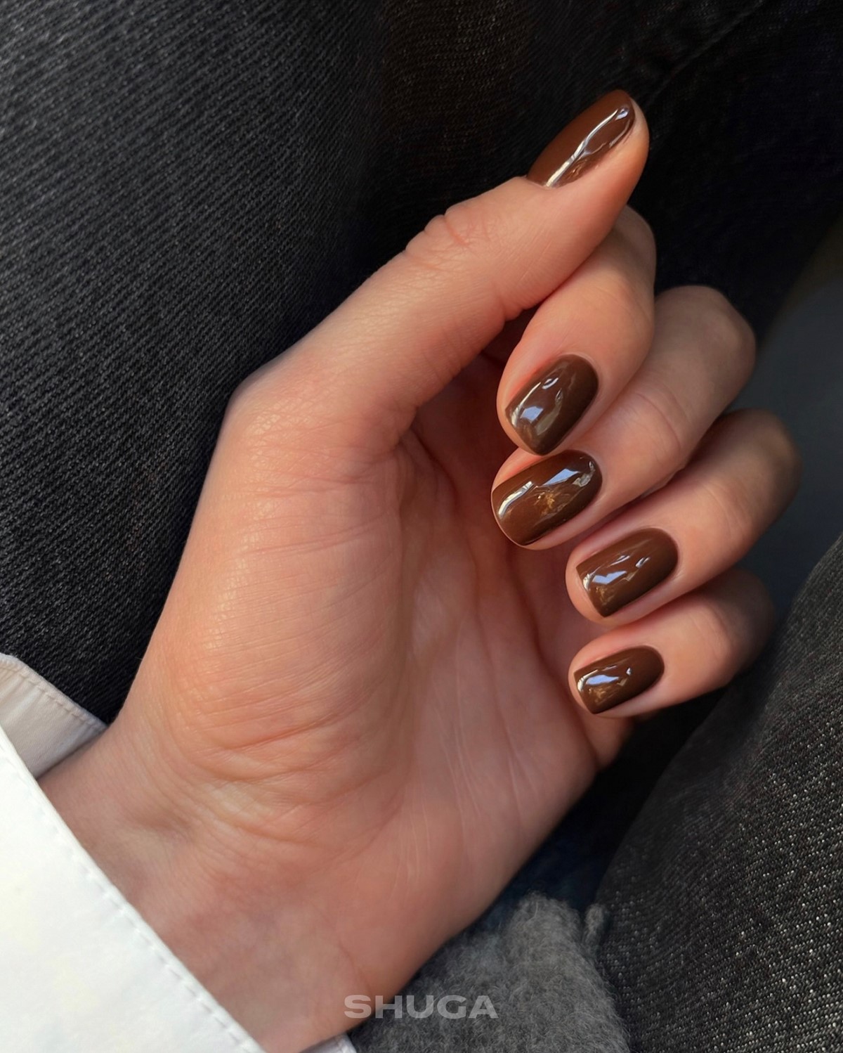 Шоколадний відтінок — це втілення тепла та зимового комфорту. Він виглядає благородно й стримано, роблячи манікюр модним, але не надто кричущим. У 2025-2026 популярними стають різні варіації шоколаду: молочний, гіркий, карамельний або насичений темний. Цей колір гарно пасує до будь-якої довжини й чудово виглядає в поєднанні з нюдовими основами, мікро-глітером або золотими акцентами. Шоколадний манікюр — універсальний вибір, який легко інтегрується у повсякденний і святковий образ.