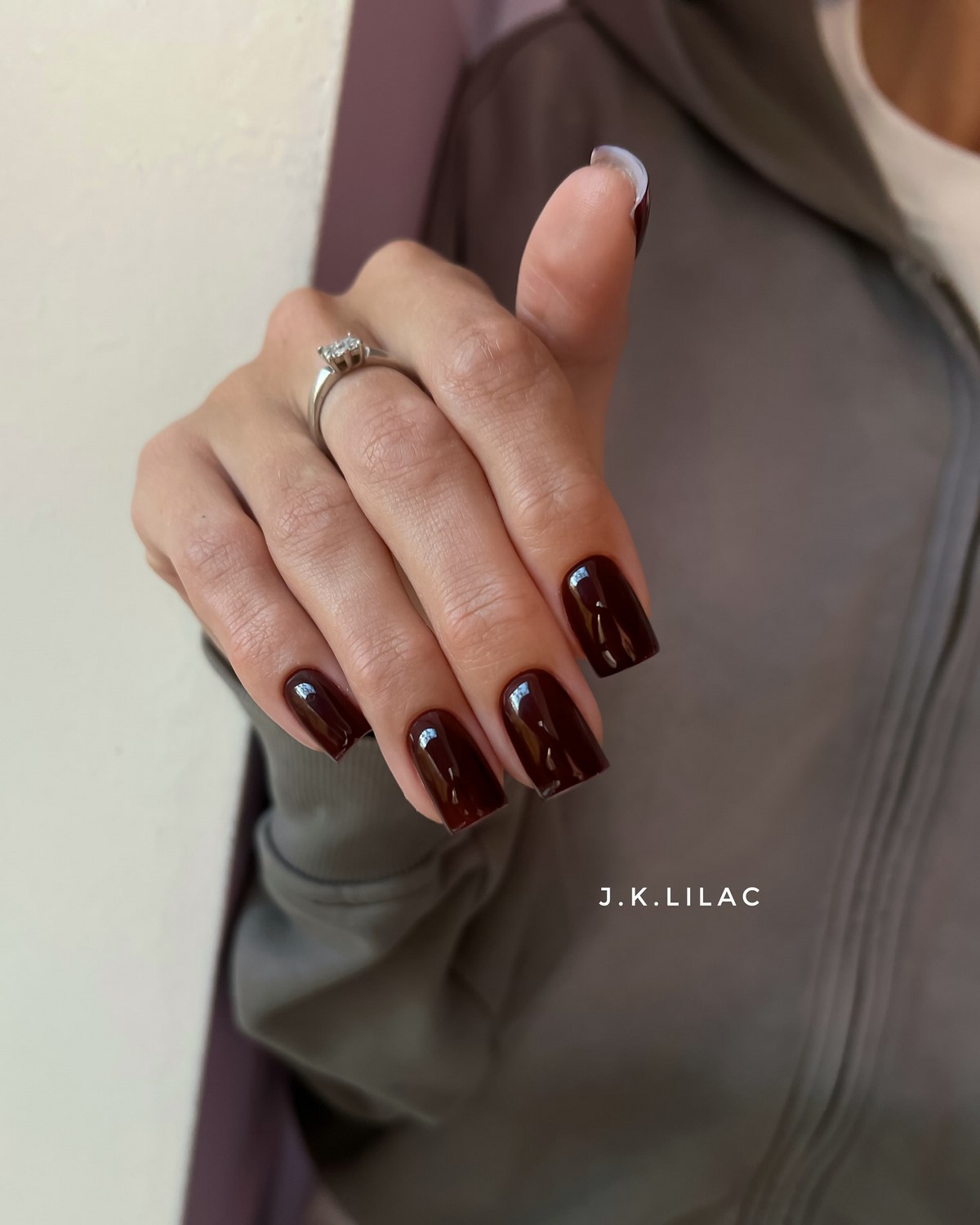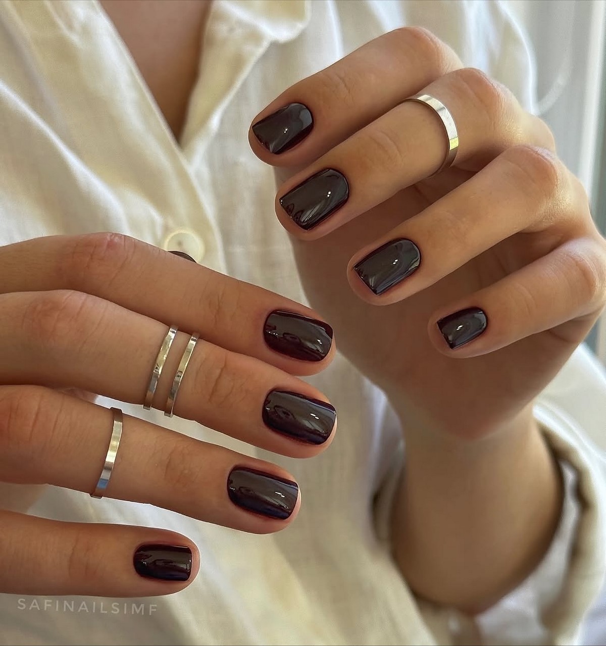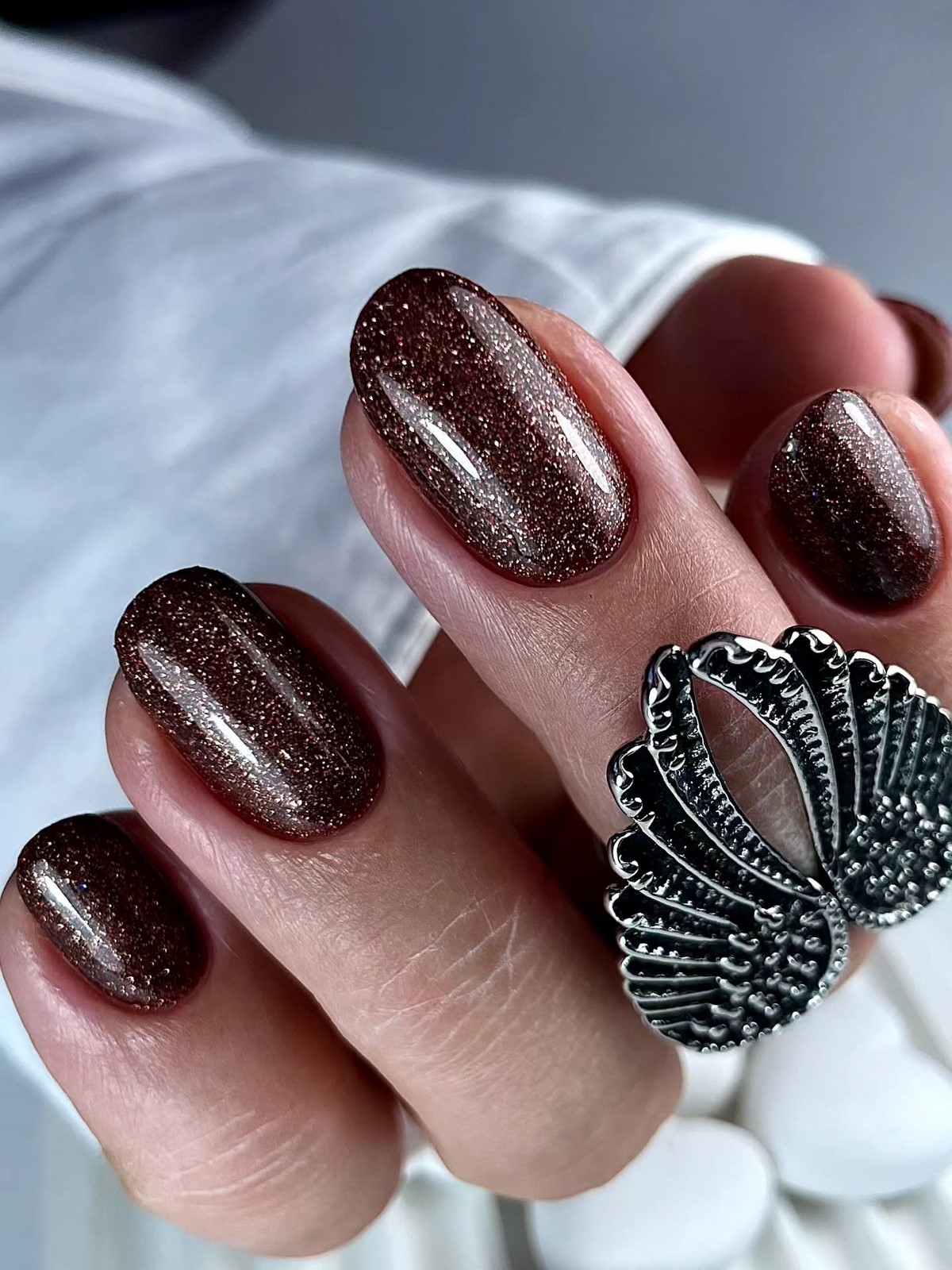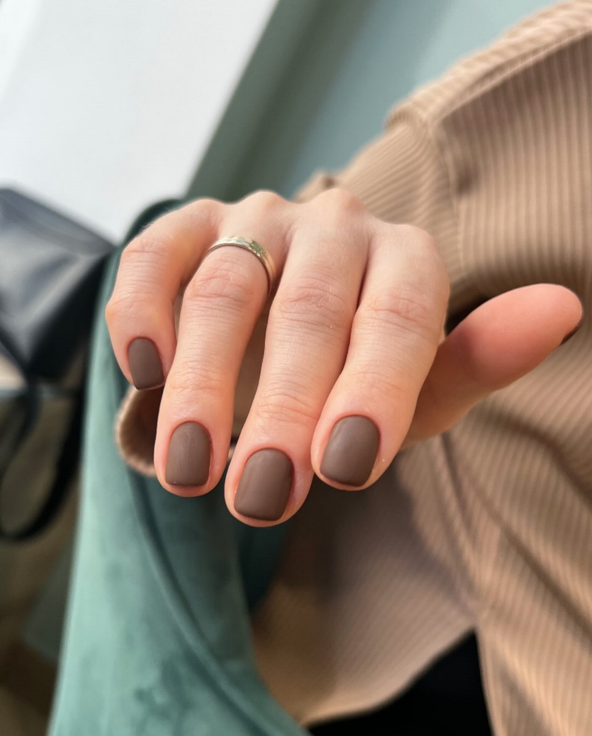 Шоколадний відтінок — це втілення тепла та зимового комфорту. Він виглядає благородно й стримано, роблячи манікюр модним, але не надто кричущим. У 2025-2026 популярними стають різні варіації шоколаду: молочний, гіркий, карамельний або насичений темний. Цей колір гарно пасує до будь-якої довжини й чудово виглядає в поєднанні з нюдовими основами, мікро-глітером або золотими акцентами. Шоколадний манікюр — універсальний вибір, який легко інтегрується у повсякденний і святковий образ.
