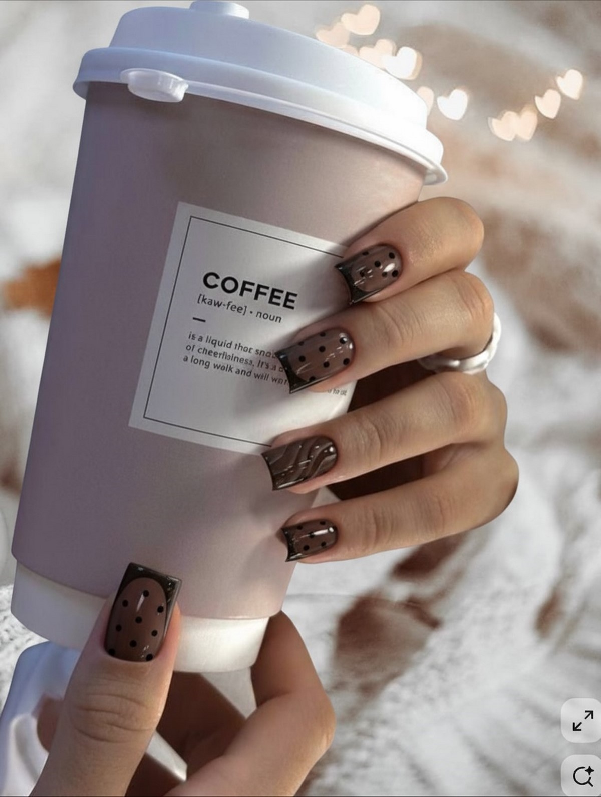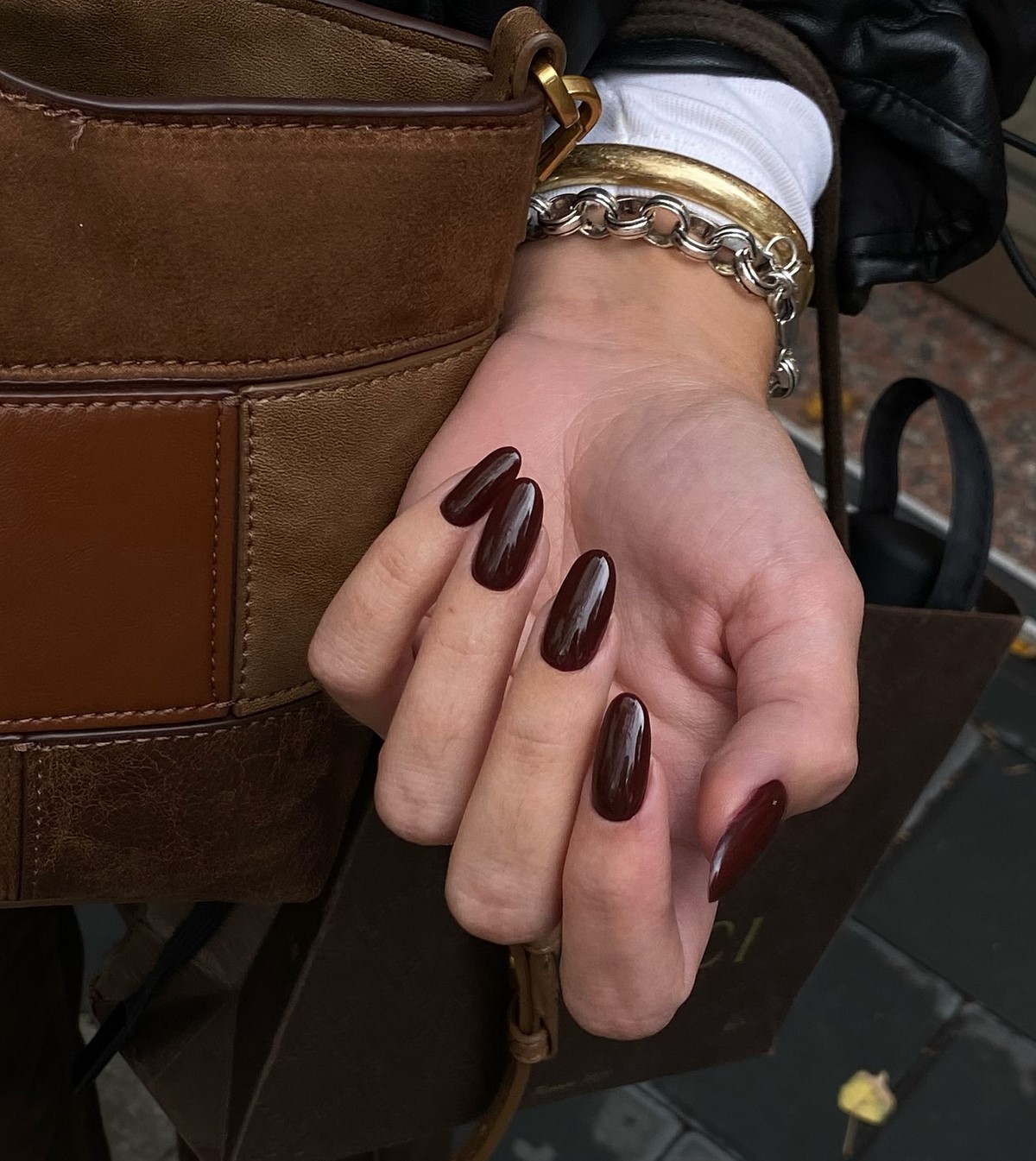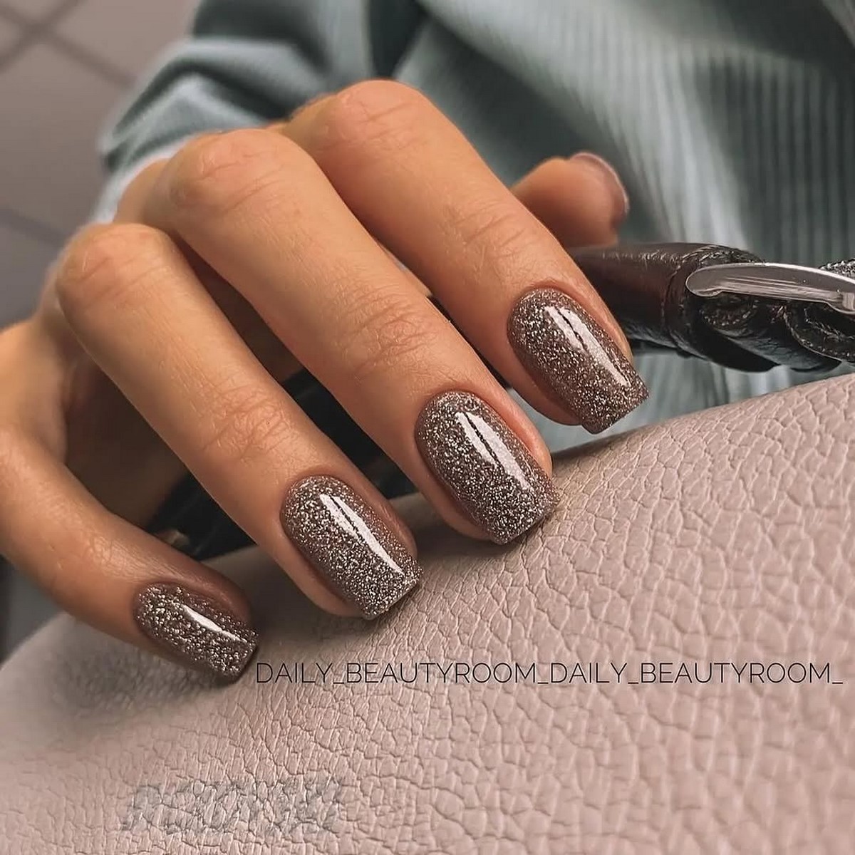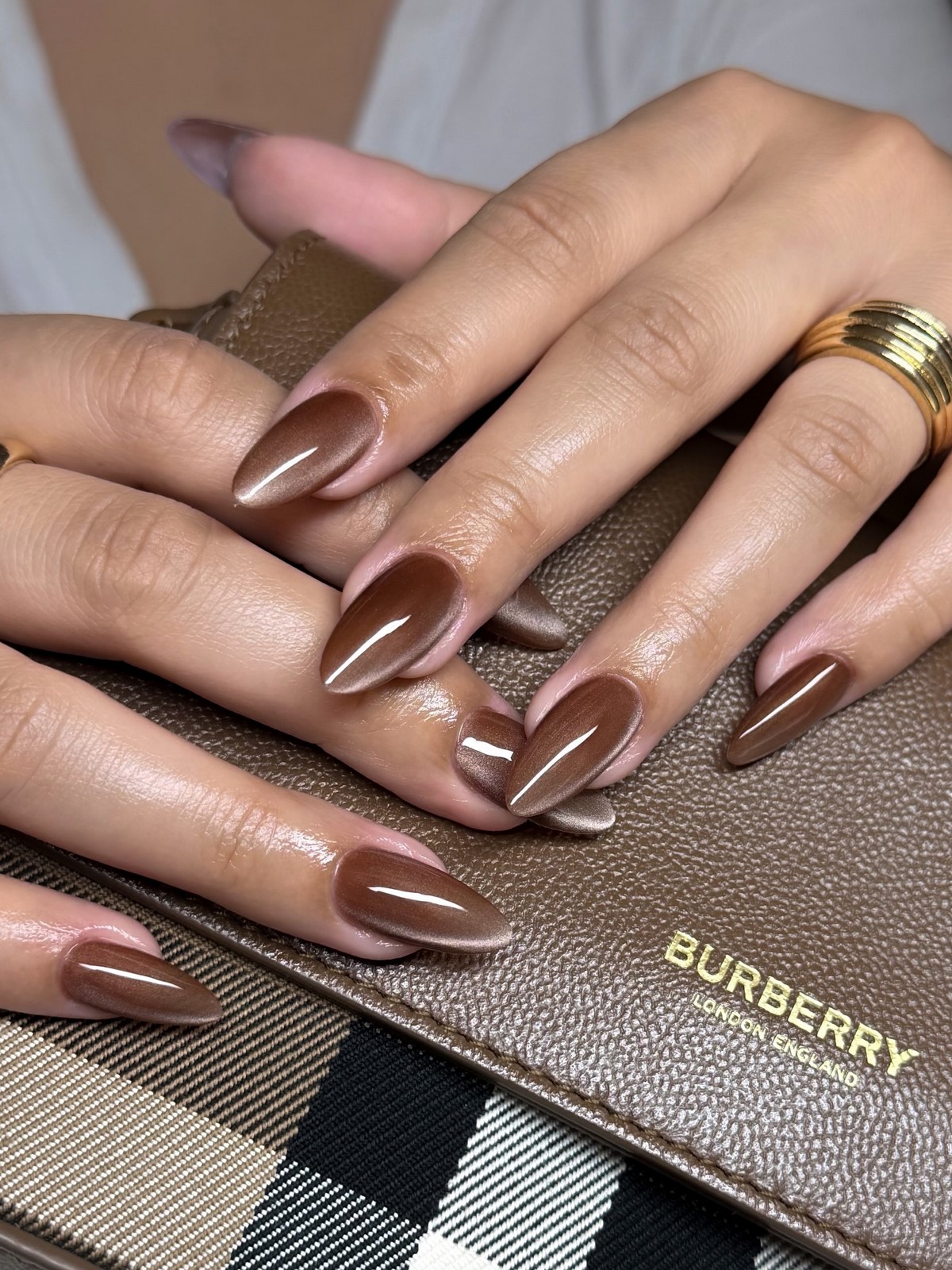 Шоколадний відтінок — це втілення тепла та зимового комфорту. Він виглядає благородно й стримано, роблячи манікюр модним, але не надто кричущим. У 2025-2026 популярними стають різні варіації шоколаду: молочний, гіркий, карамельний або насичений темний. Цей колір гарно пасує до будь-якої довжини й чудово виглядає в поєднанні з нюдовими основами, мікро-глітером або золотими акцентами. Шоколадний манікюр — універсальний вибір, який легко інтегрується у повсякденний і святковий образ.