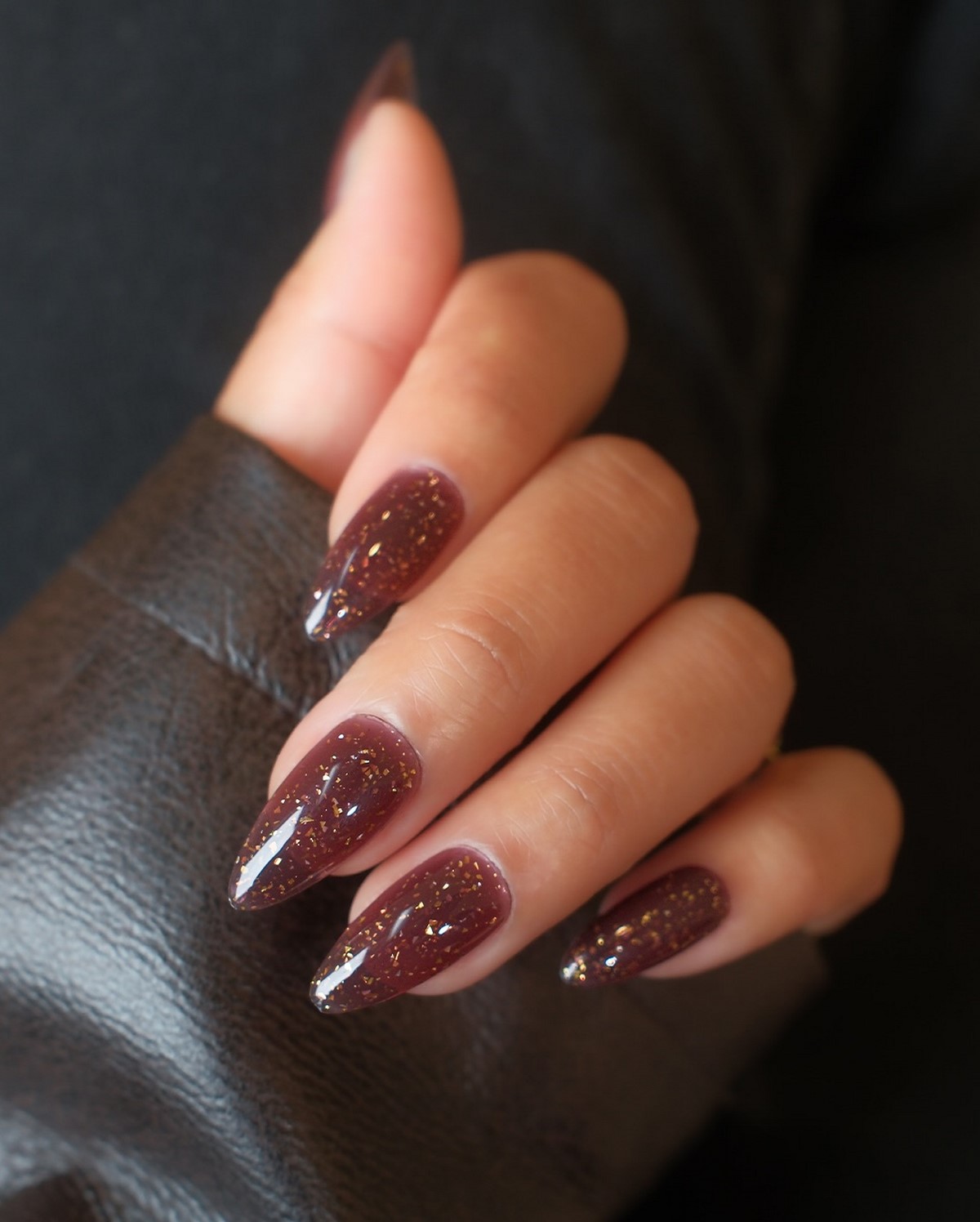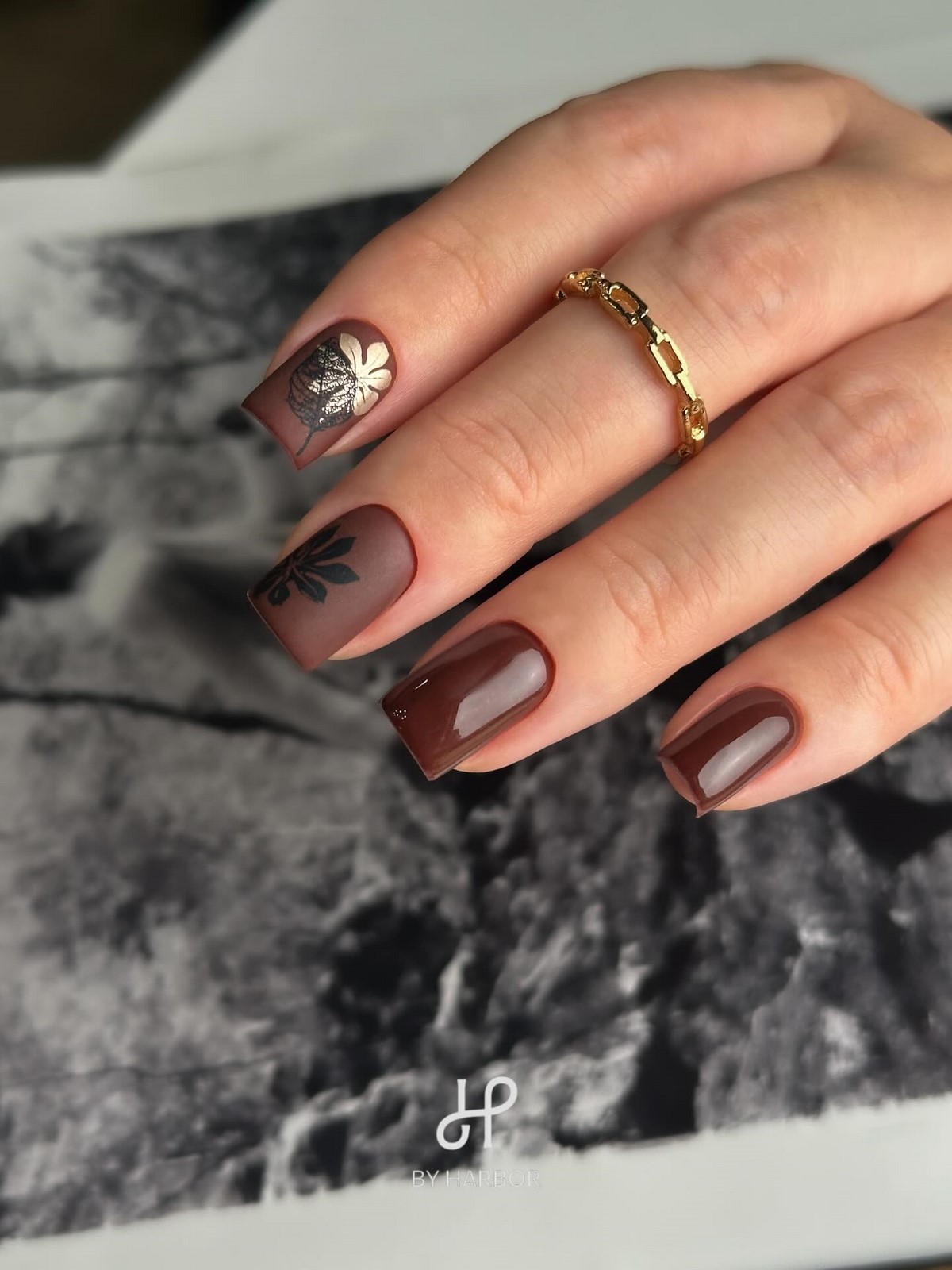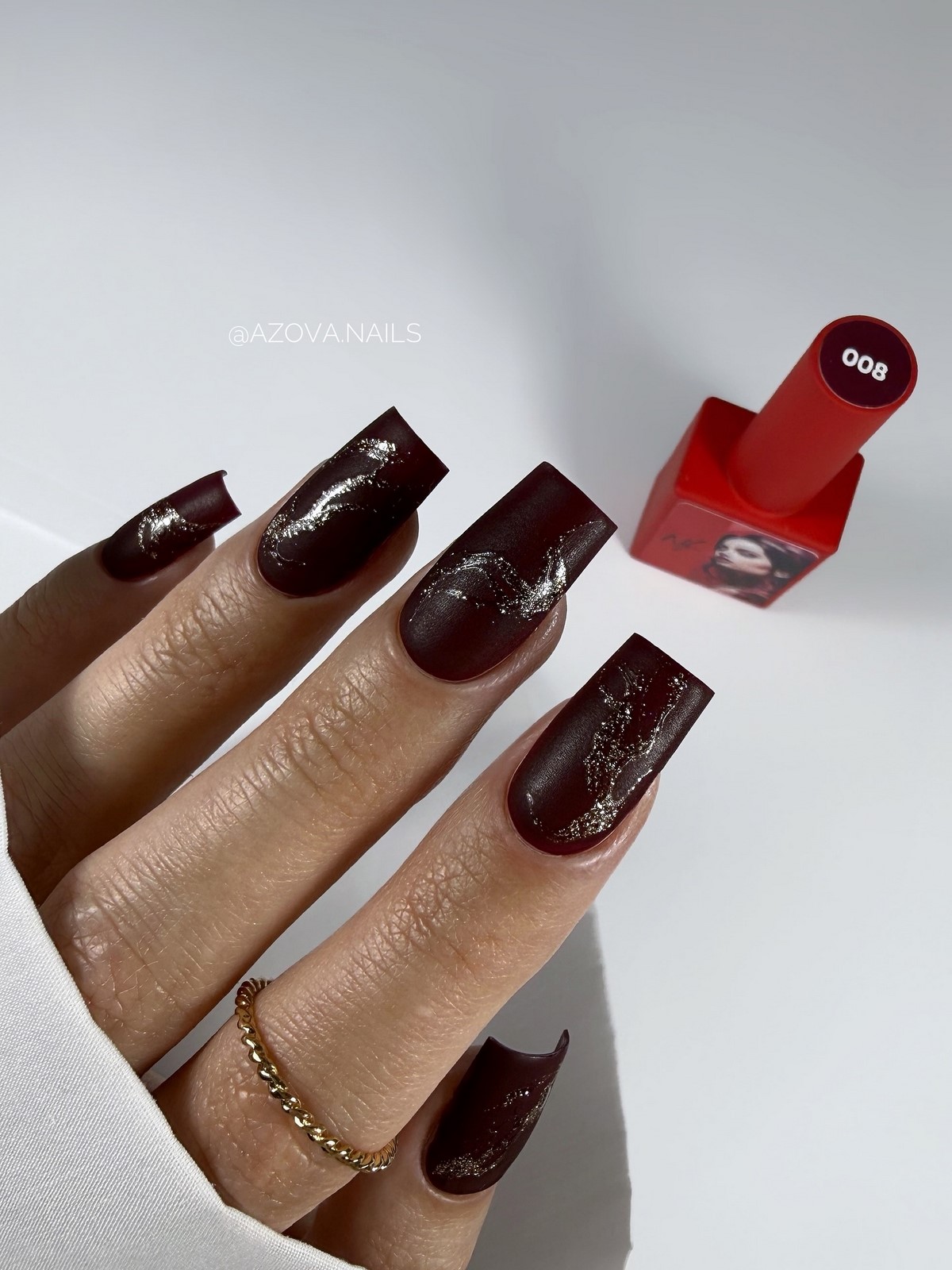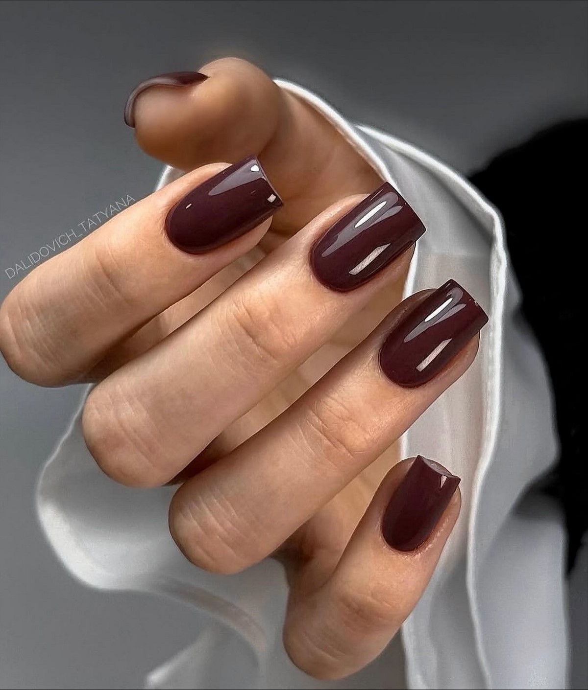 Шоколадний відтінок — це втілення тепла та зимового комфорту. Він виглядає благородно й стримано, роблячи манікюр модним, але не надто кричущим. У 2025-2026 популярними стають різні варіації шоколаду: молочний, гіркий, карамельний або насичений темний. Цей колір гарно пасує до будь-якої довжини й чудово виглядає в поєднанні з нюдовими основами, мікро-глітером або золотими акцентами. Шоколадний манікюр — універсальний вибір, який легко інтегрується у повсякденний і святковий образ.