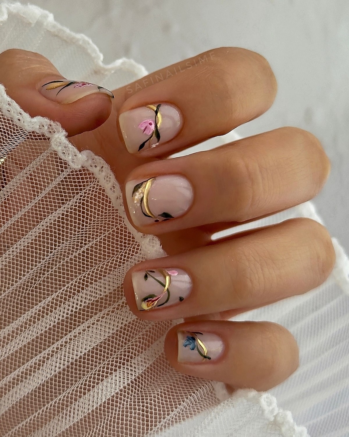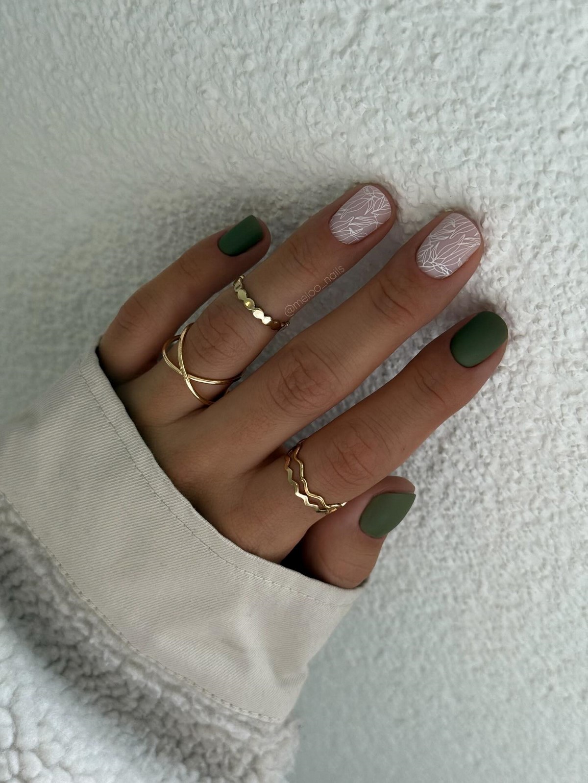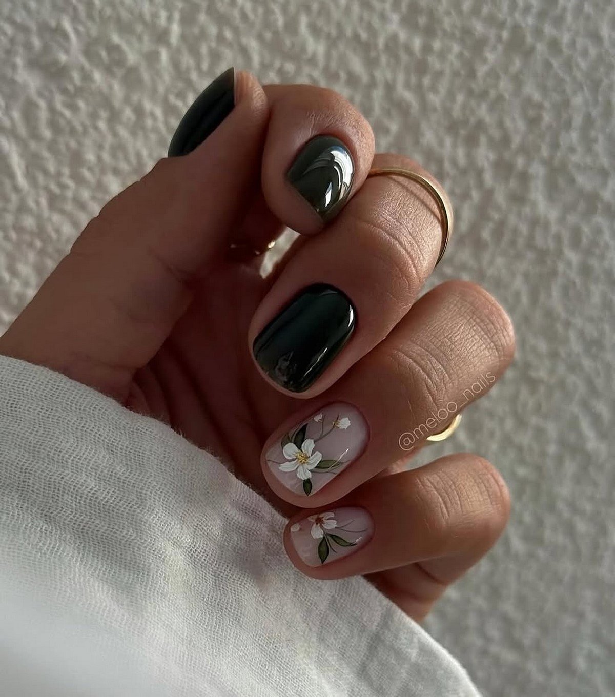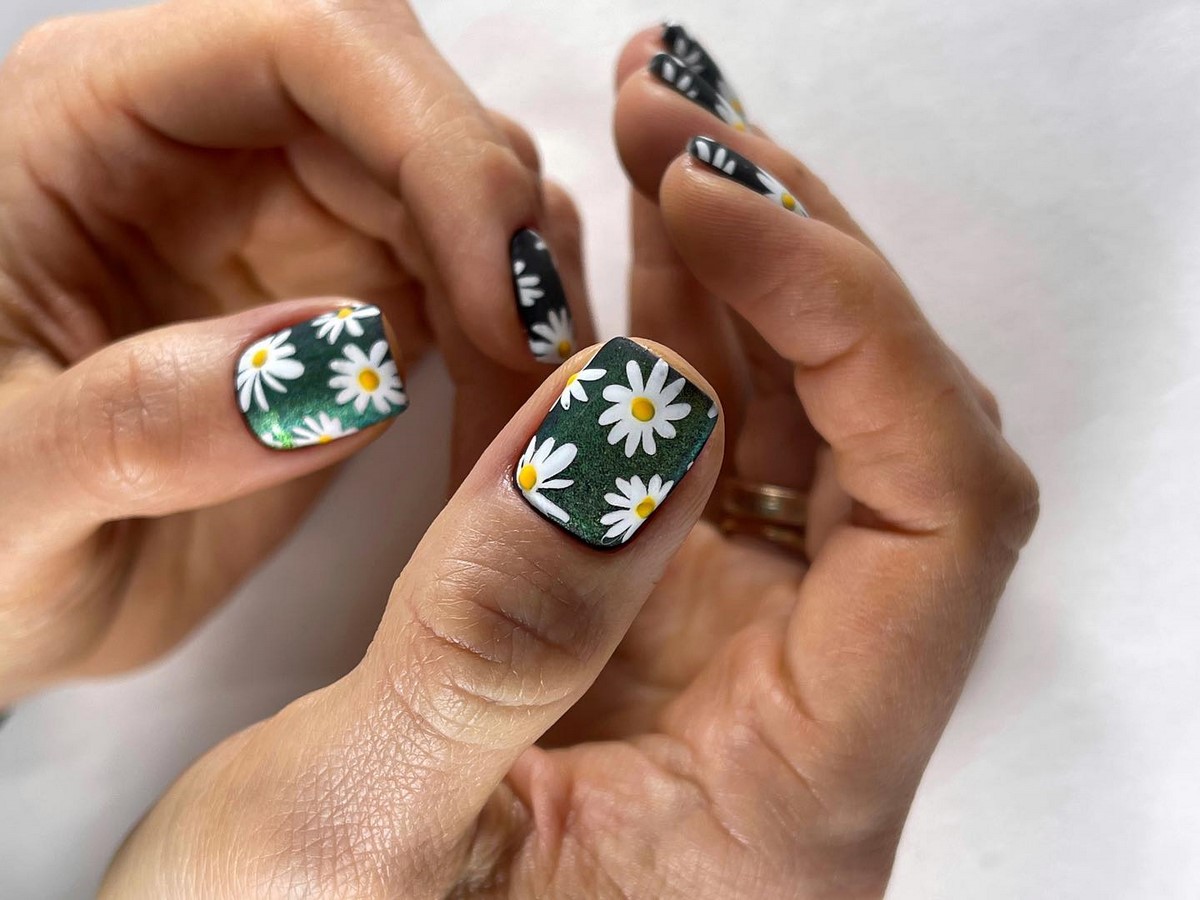 Квіткові мотиви не покидають модний Олімп, навіть взимку. Маленькі ромашки на коротких нігтях виглядають зворушливо і позитивно, особливо в поєднанні з прозорою або молочною базою. Такий дизайн додає легкості навіть найстриманішому образу.
