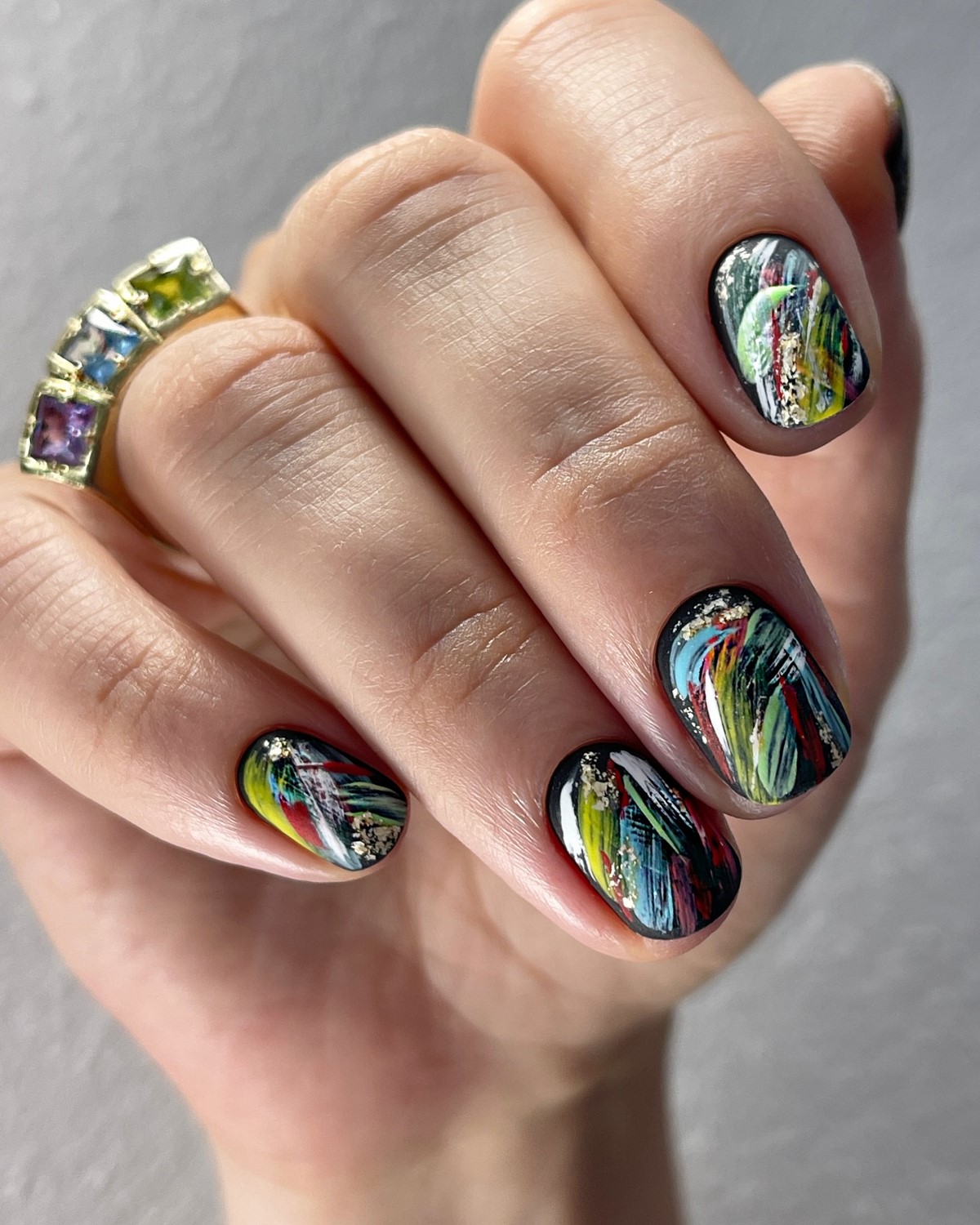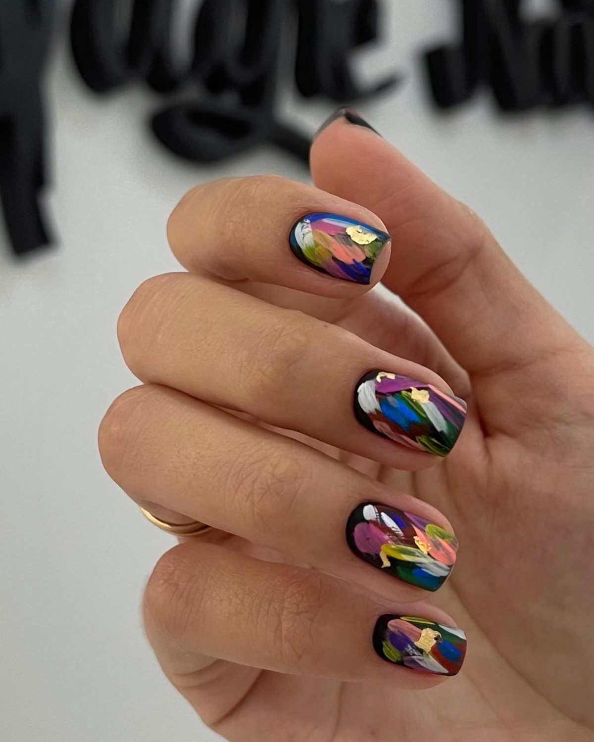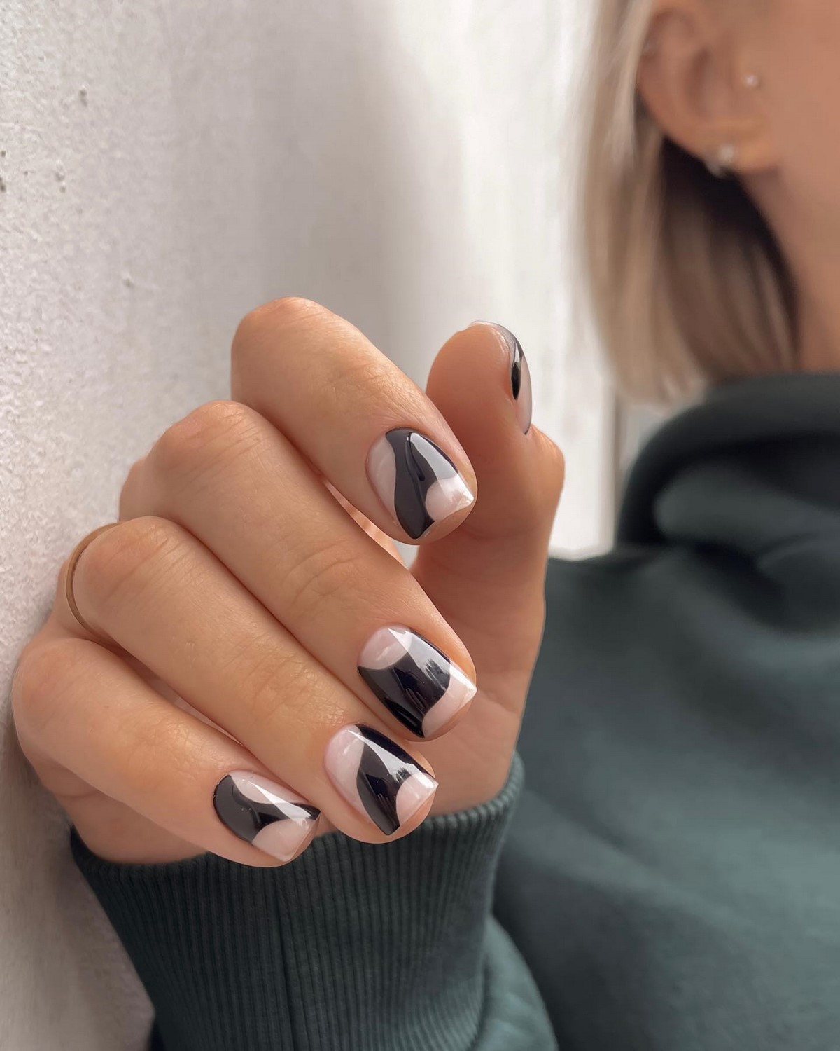 Нейл-арт в стилі абстракції — це завжди оригінальність. Незвичайні лінії, краплі, мазки пензля, плавні переходи відтінків — все це актуально взимку 2025-2026. На коротких нігтях абстракція виглядає як модна прикраса, що додає образу індивідуальності.