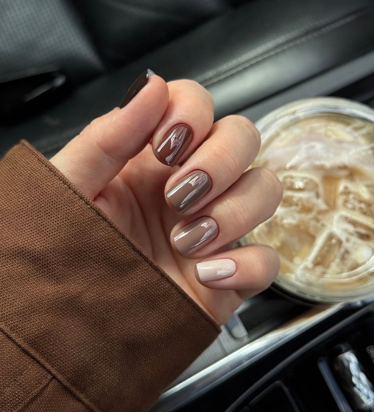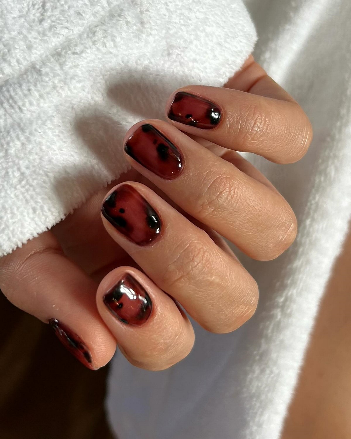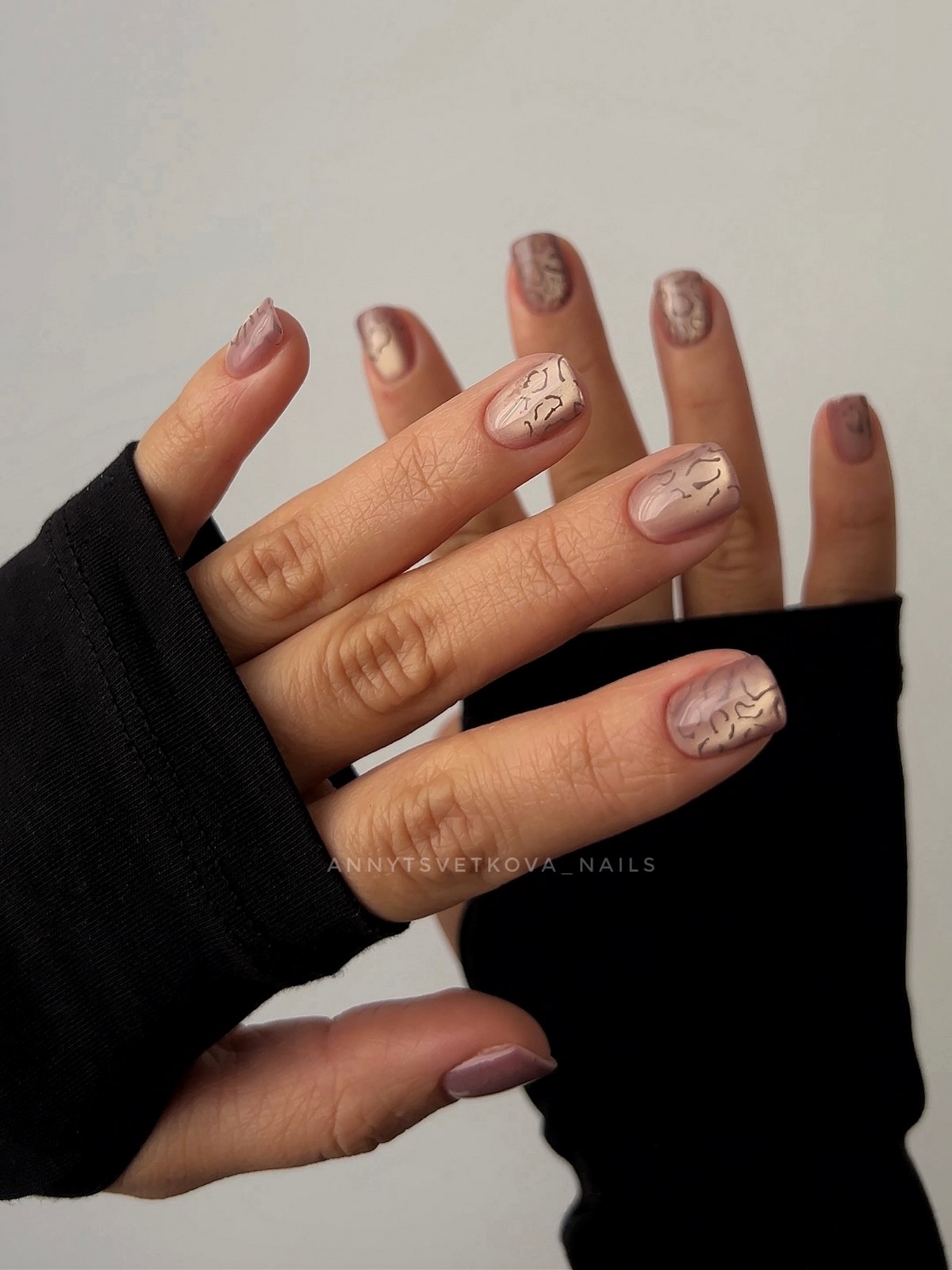 Цей дизайн впевнено тримає позиції серед зимових хітів. Він поєднує в собі теплі карамельні, бурштинові та шоколадні переливи, створюючи ефект благородної глибини. На коротких нігтях черепаховий принт виглядає особливо елегантно — не вигадливо, але дорого.