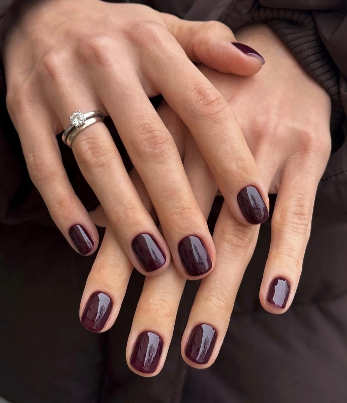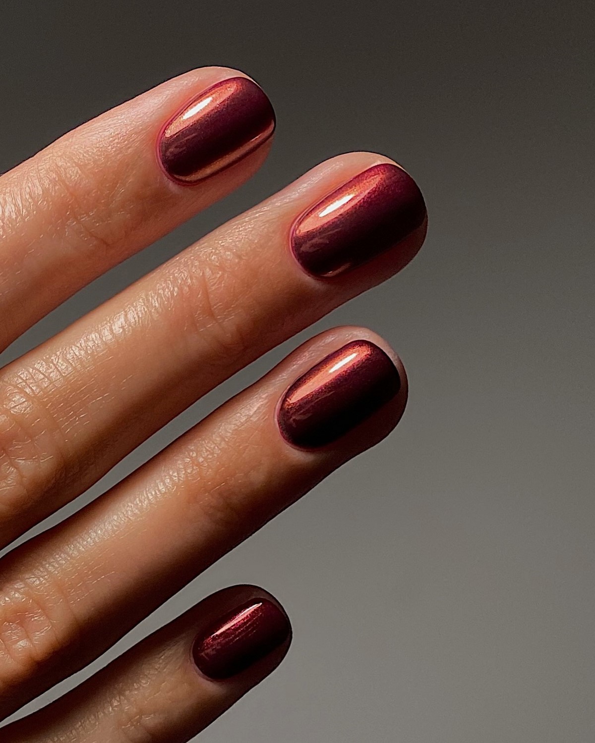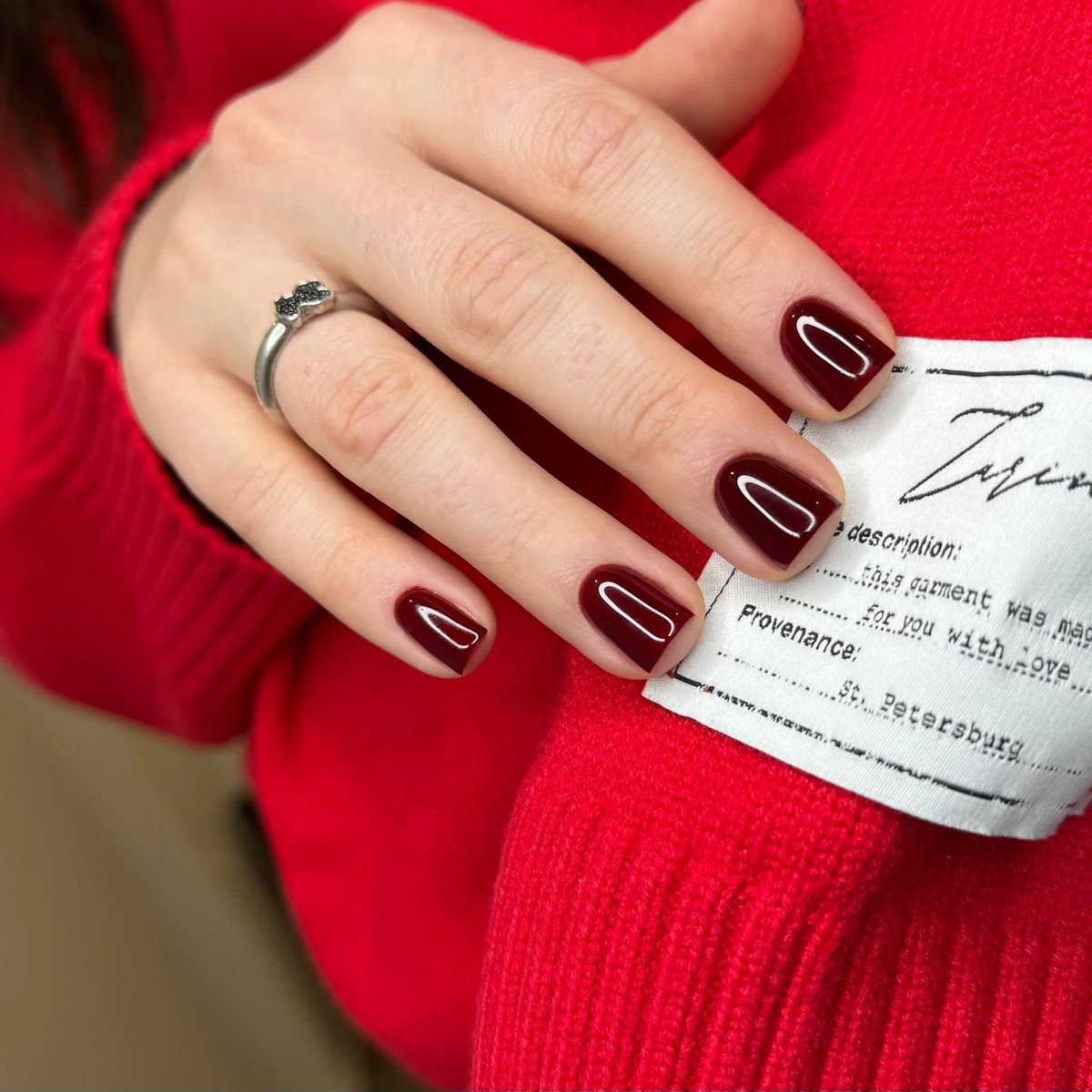 Глибокі тони, такі як бордо, сапфіровий, смарагдовий або темно-сливовий, стають символом зимової елегантності. Вони візуально подовжують нігтьову пластину, а в поєднанні з матовим топом надають образу витонченості.