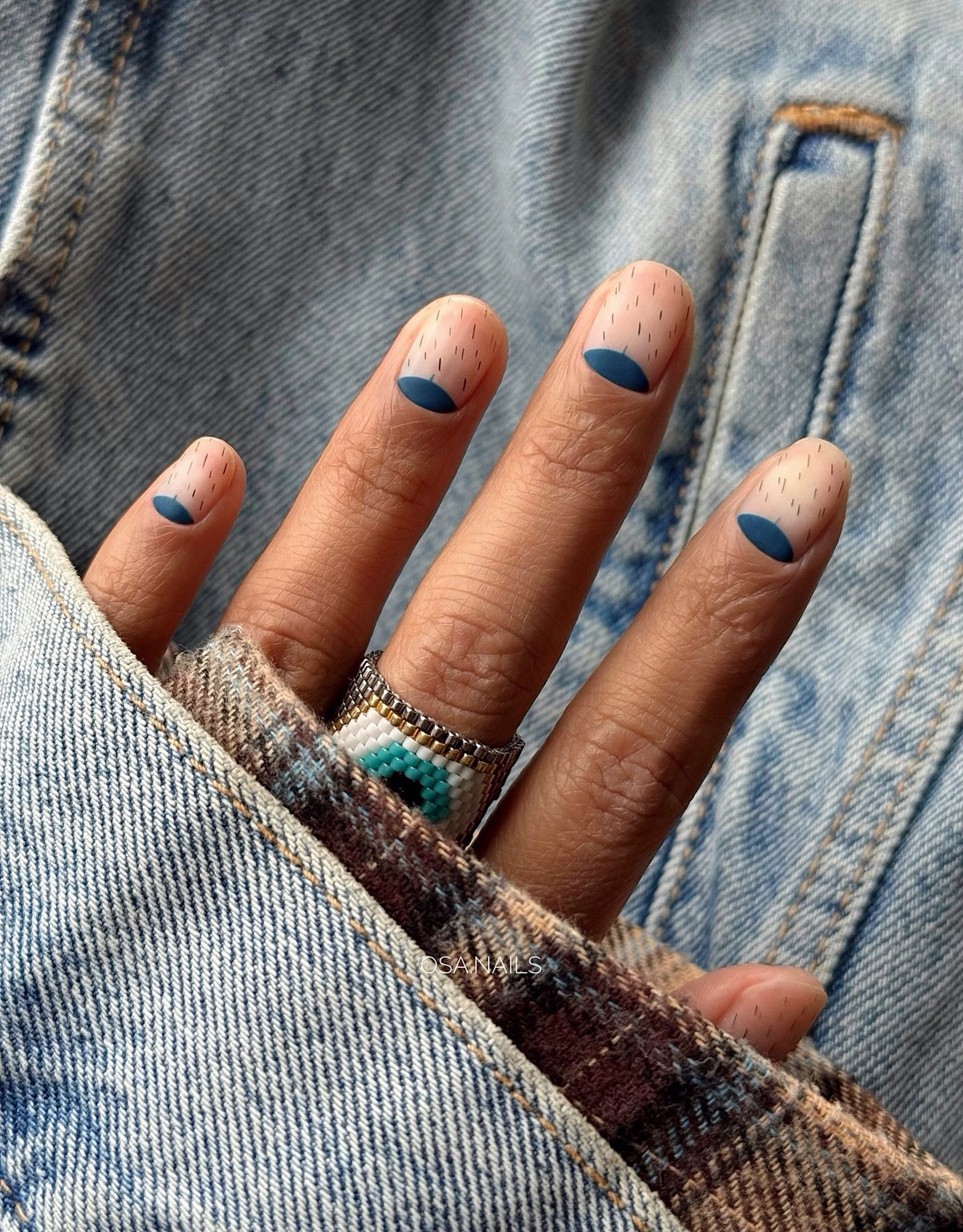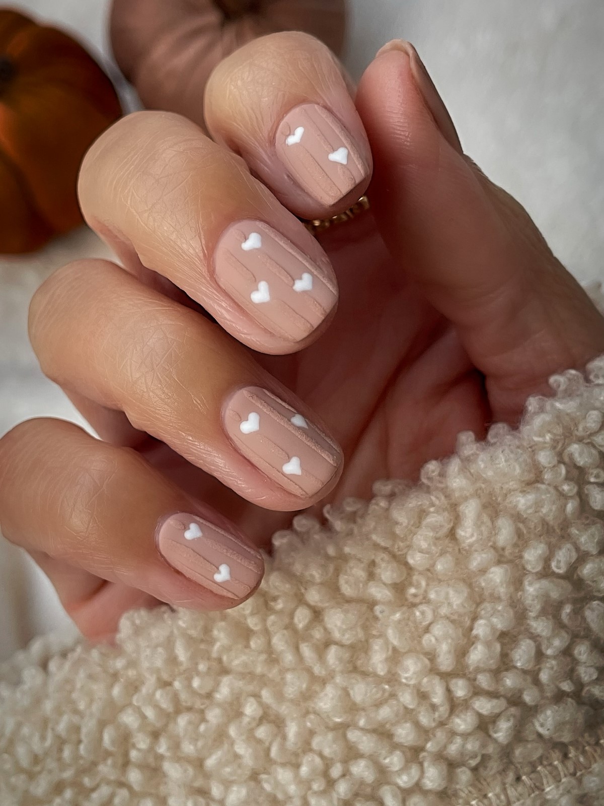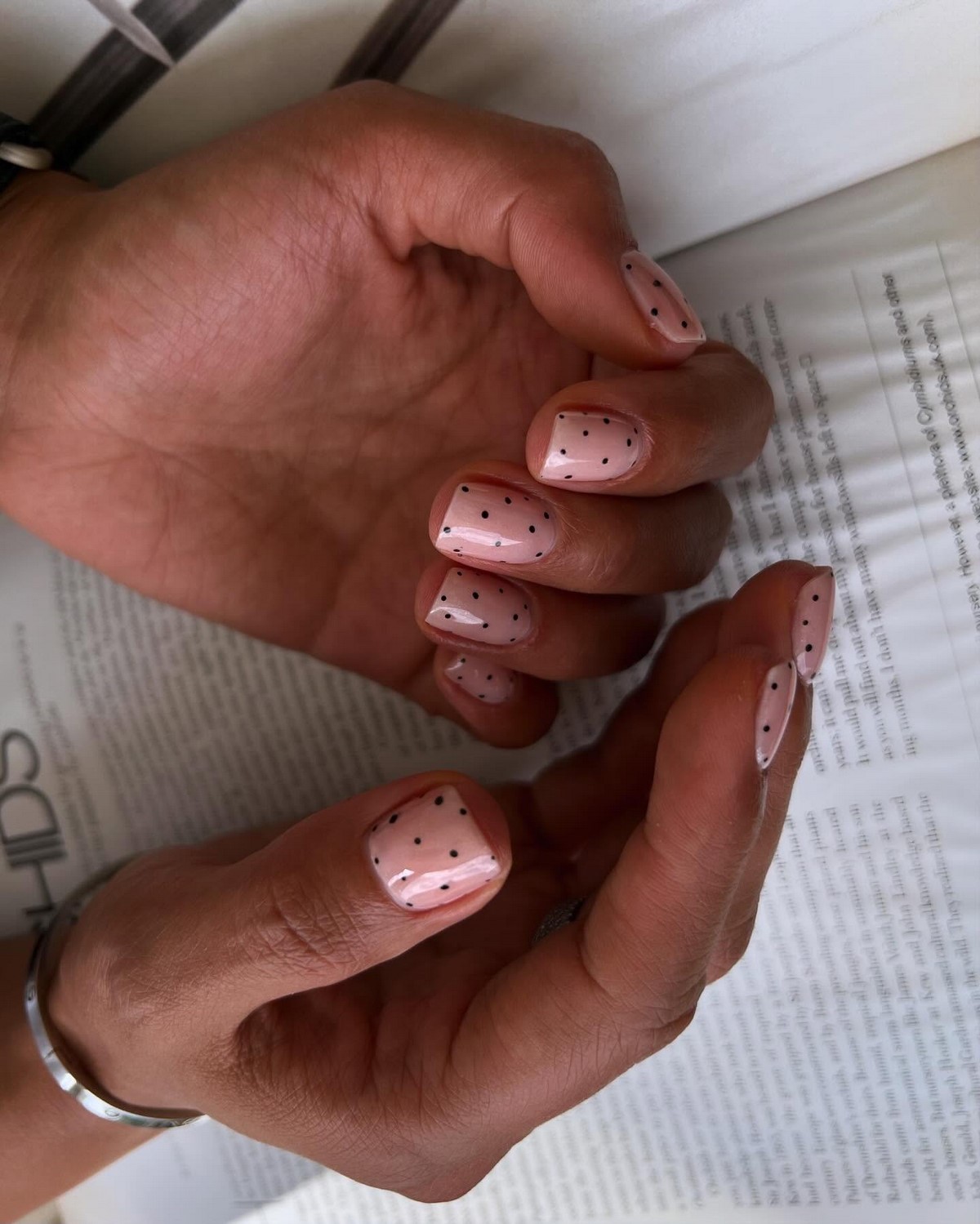 Мінімалістичні крапки на нюдовій або пастельній основі — один з найграйливіших трендів зими. Цей манікюр нагадує про ретро-стиль, але в сучасному виконанні виглядає свіжо і лаконічно. Можна використовувати контрастні кольори або металеві акценти.