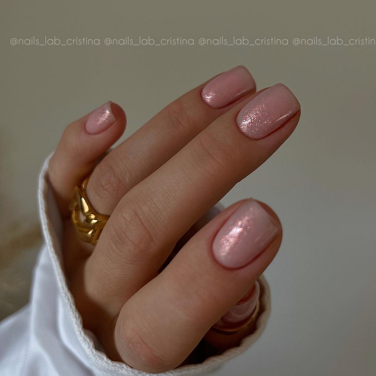 Рожевий в зимовому сезоні 2025-2026 представлений у вигляді «цукрової пудри» або «фруктової води» — з м’яким мерехтінням, глітером або оксамитовим фінішем. Такий манікюр надає рукам свіжості та легкості, ідеально підходить для зимових буднів і святкових днів.