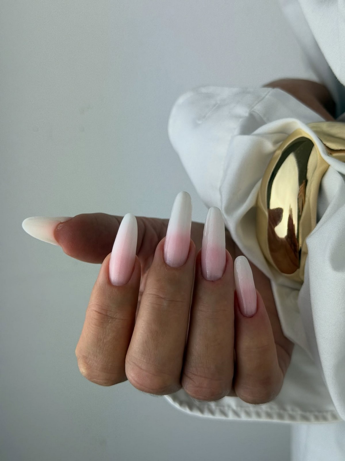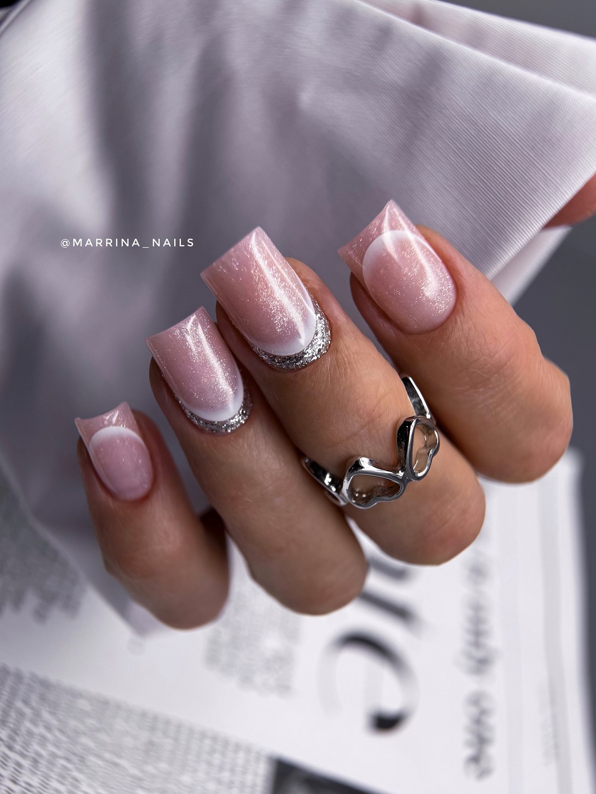 «Аура» — це м’який перехід кольору від центру нігтя до країв, що створює ефект світіння. У тренді — поєднання рожевого і білого, сірого і блакитного, а також теплого персика з кремовим. Цей манікюр виглядає ніжно і жіночно, ніби підсвічуючи нігті зсередини. Він ідеально підходить для зимових весіль, вечірок і повсякденного стилю.