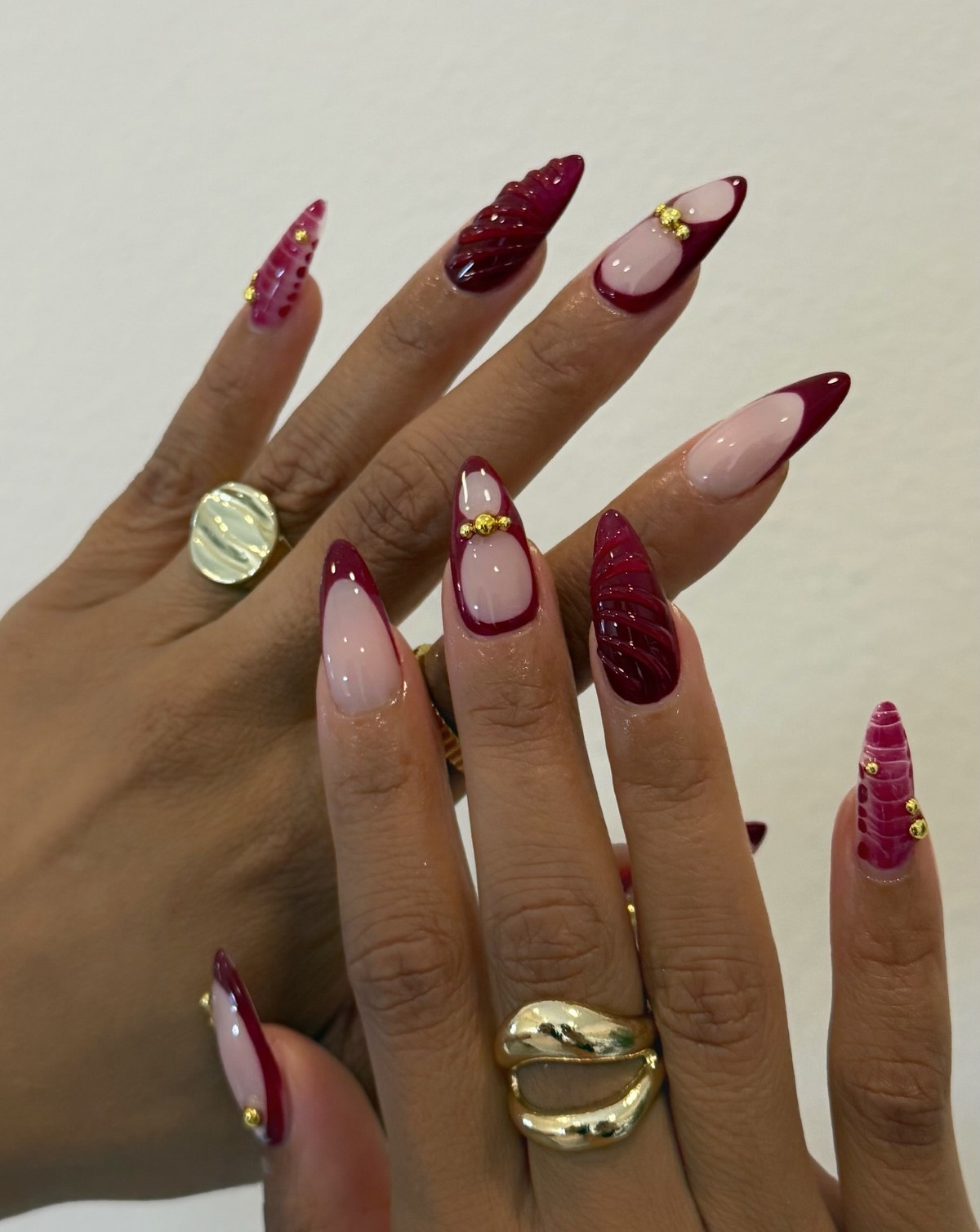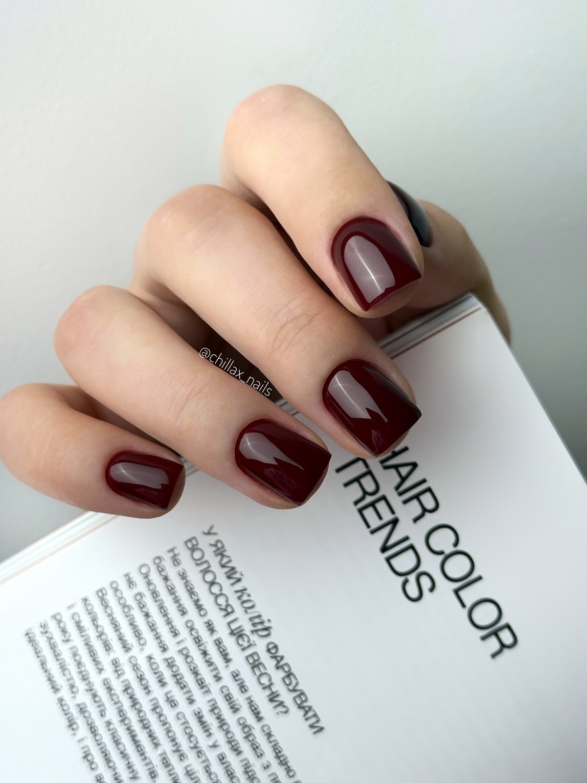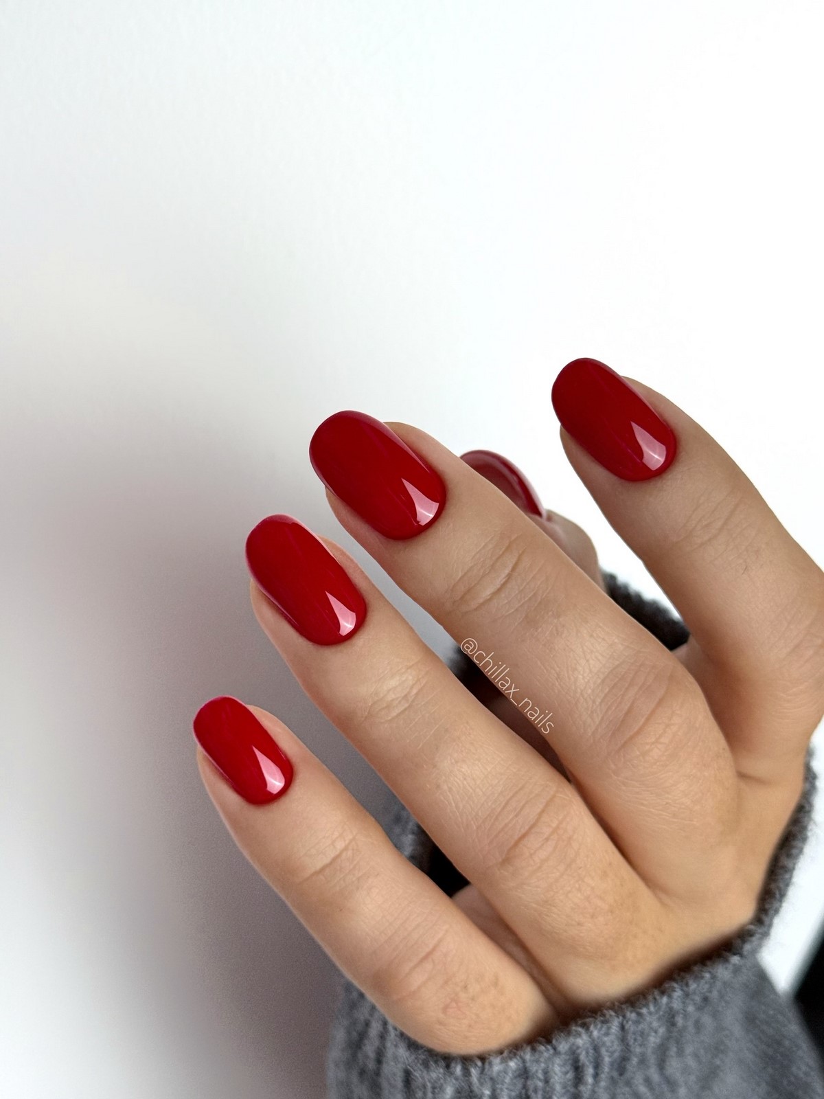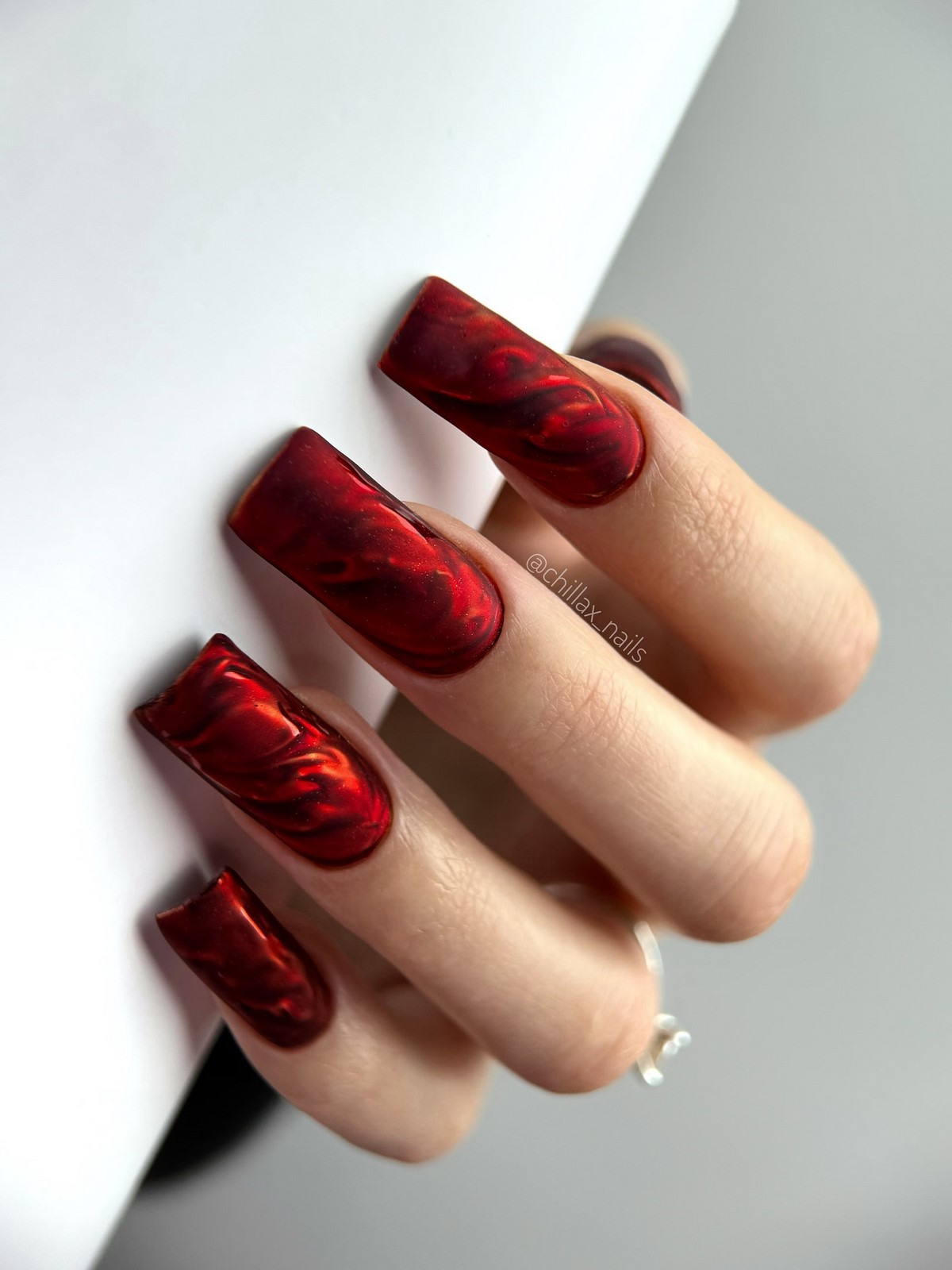 Червоний колір — класика зими. У сезоні 2025-2026 актуальні глибокі тони: вишневий, рубіновий, бордо, червоний з сатиновим фінішем. Особливо ефектно виглядають нігті з глянцевим покриттям і тонким металевим контуром. Такий дизайн створює настрій свята і впевненості, ідеально підходячи до новорічних вечірок.