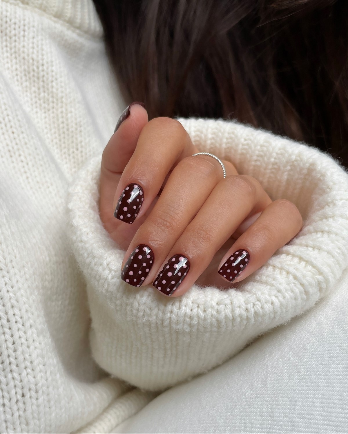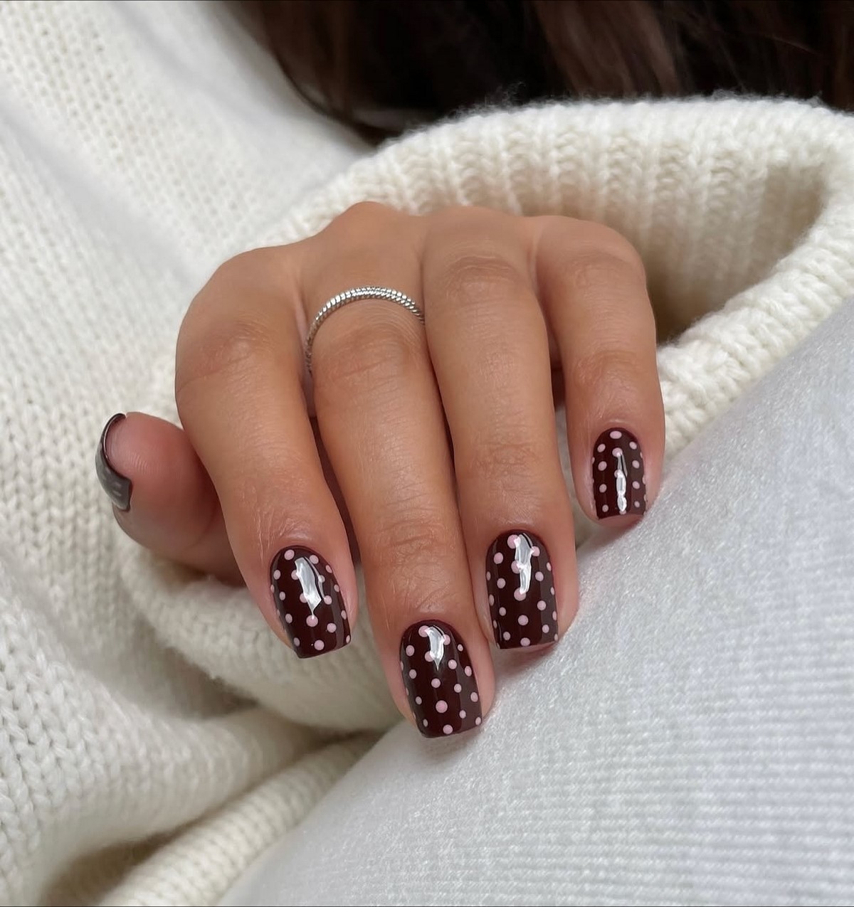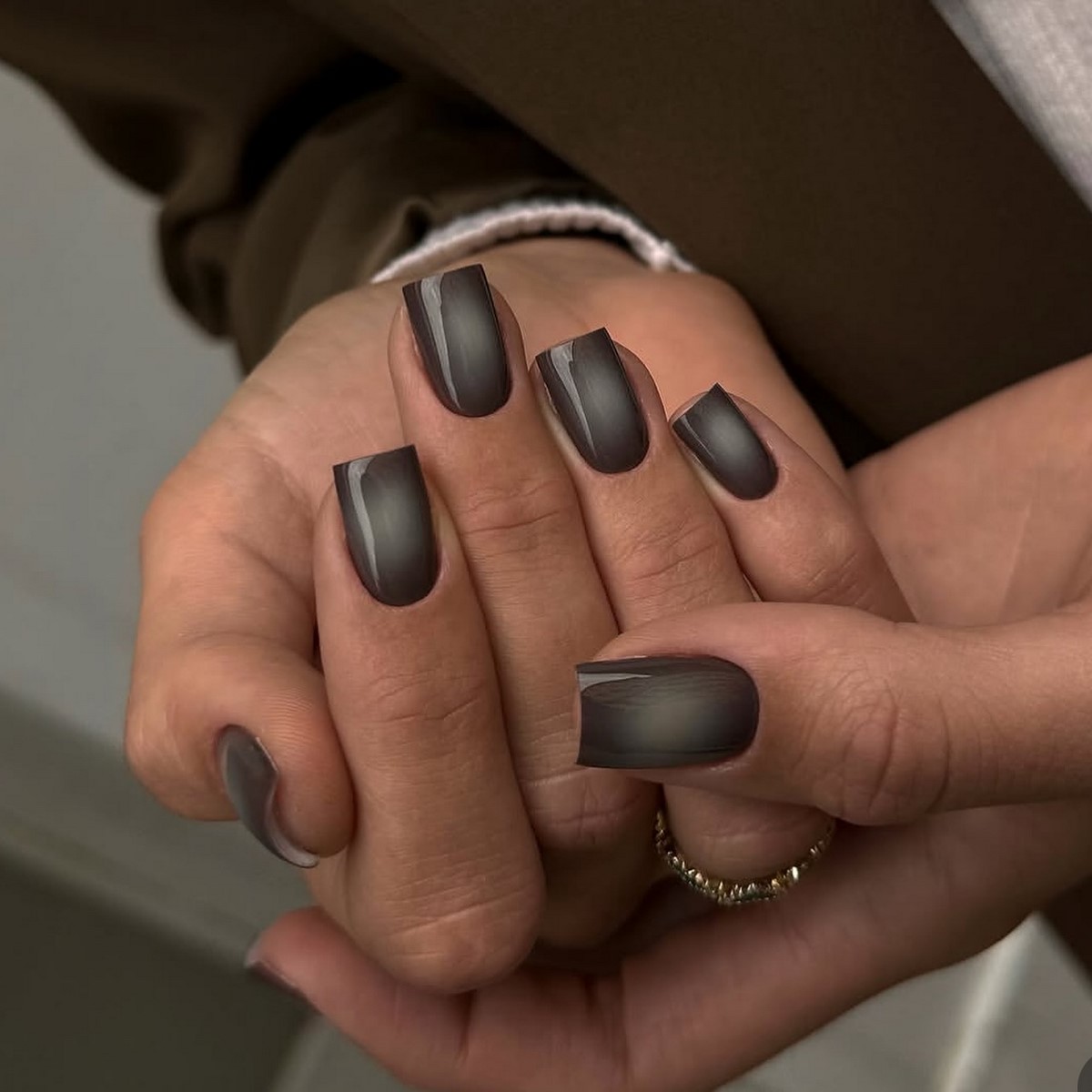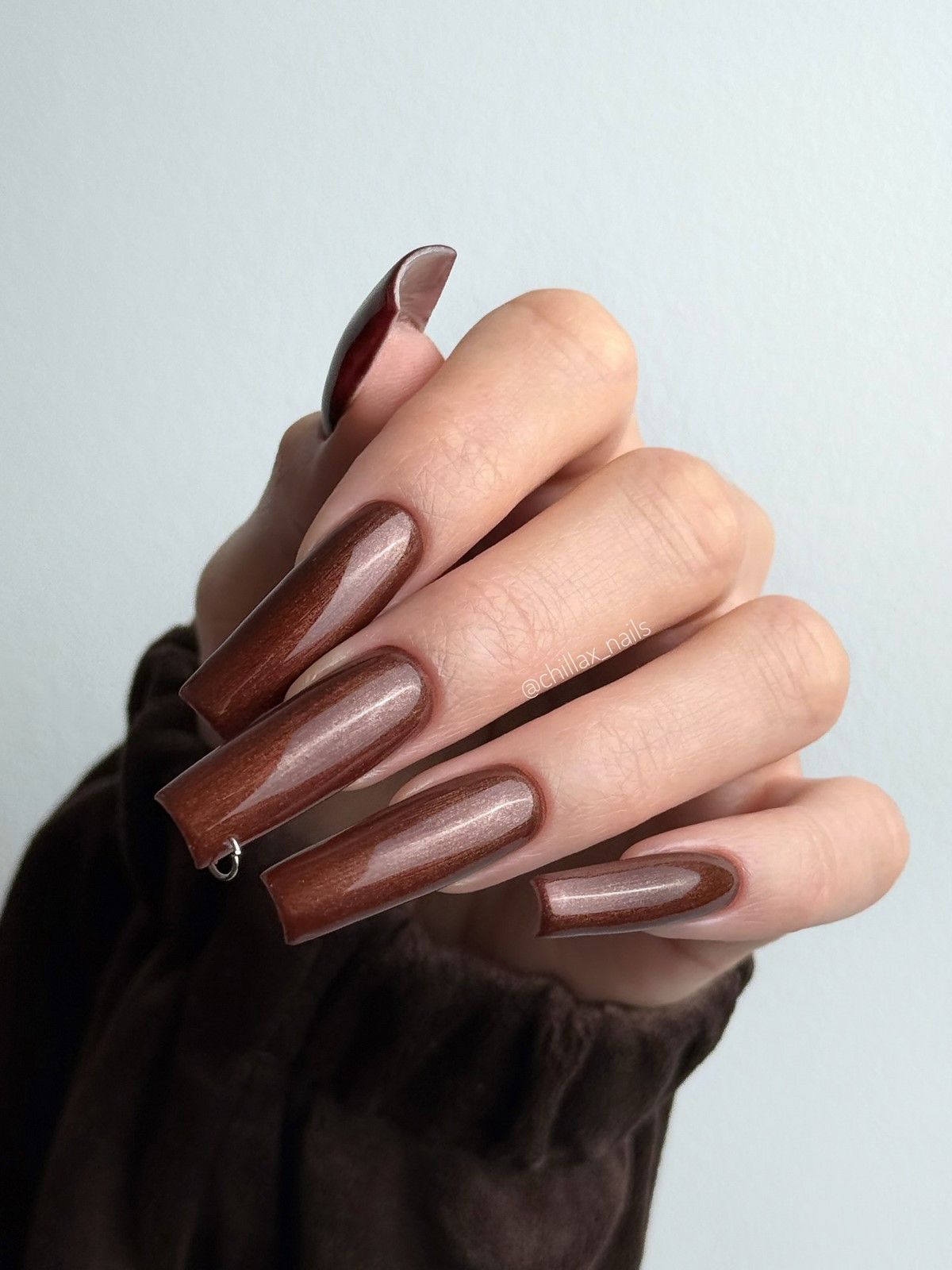 Темно-шоколадний відтінок — хіт зими 2025-2026. У поєднанні із золотим або срібним стемпінгом він виглядає розкішно і затишно одночасно. Такий дизайн можна доповнити матовим топом для ефекту оксамиту. Цей манікюр ідеально підійде для теплих в’язаних образів і вечірніх виходів.