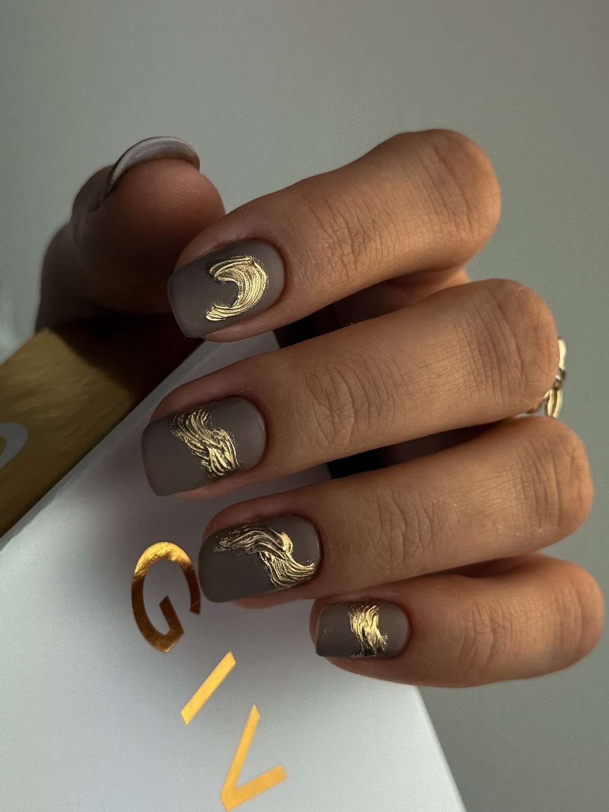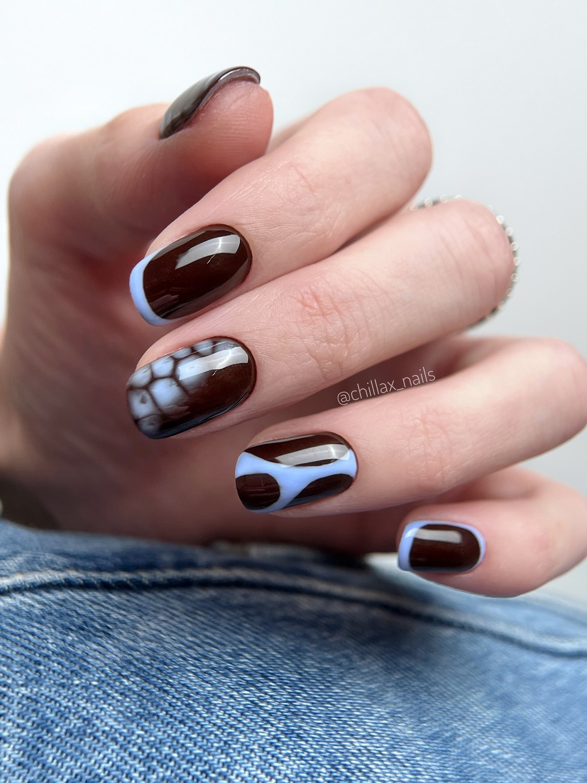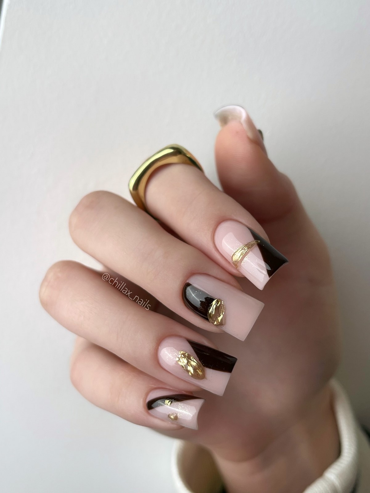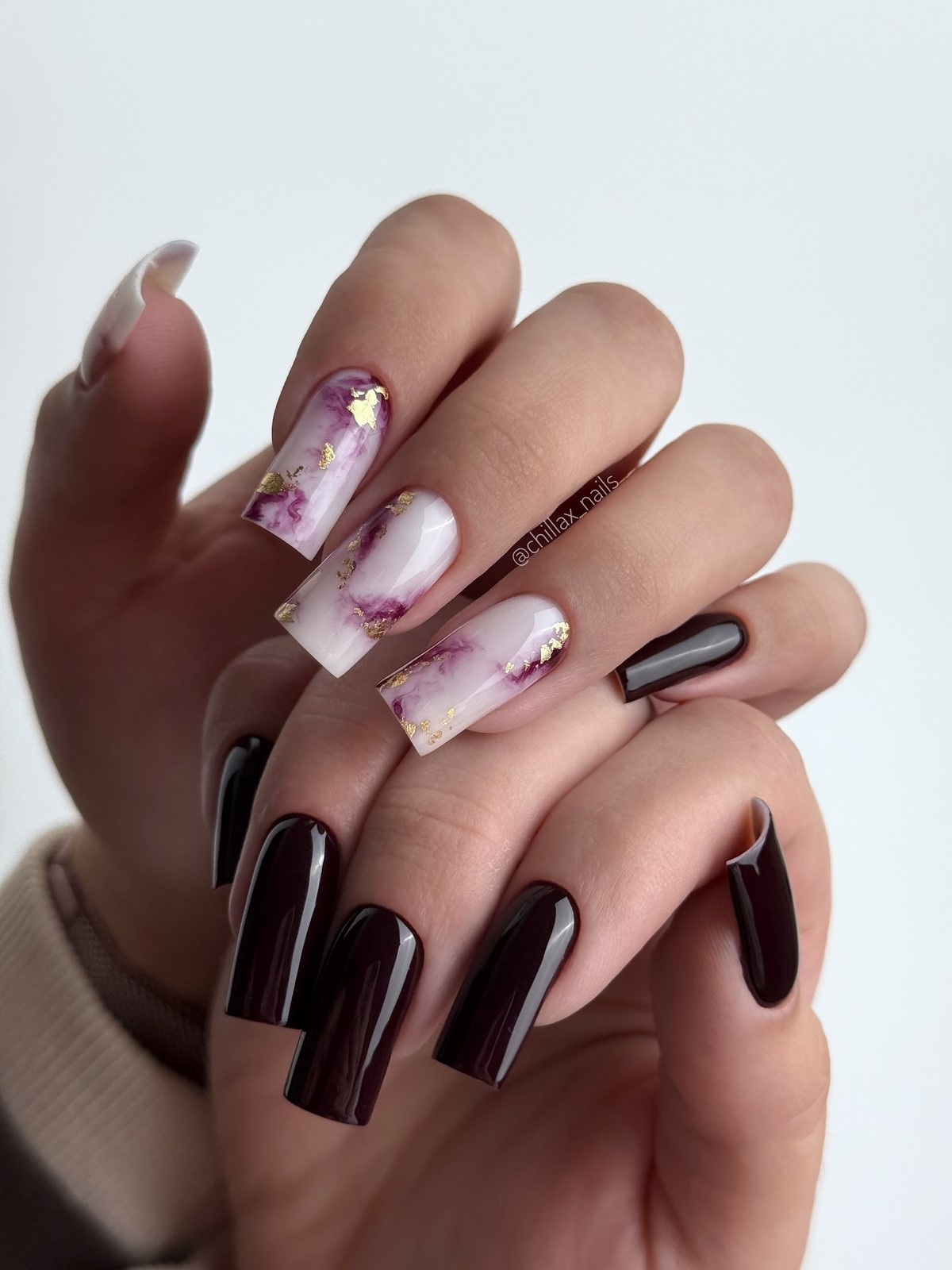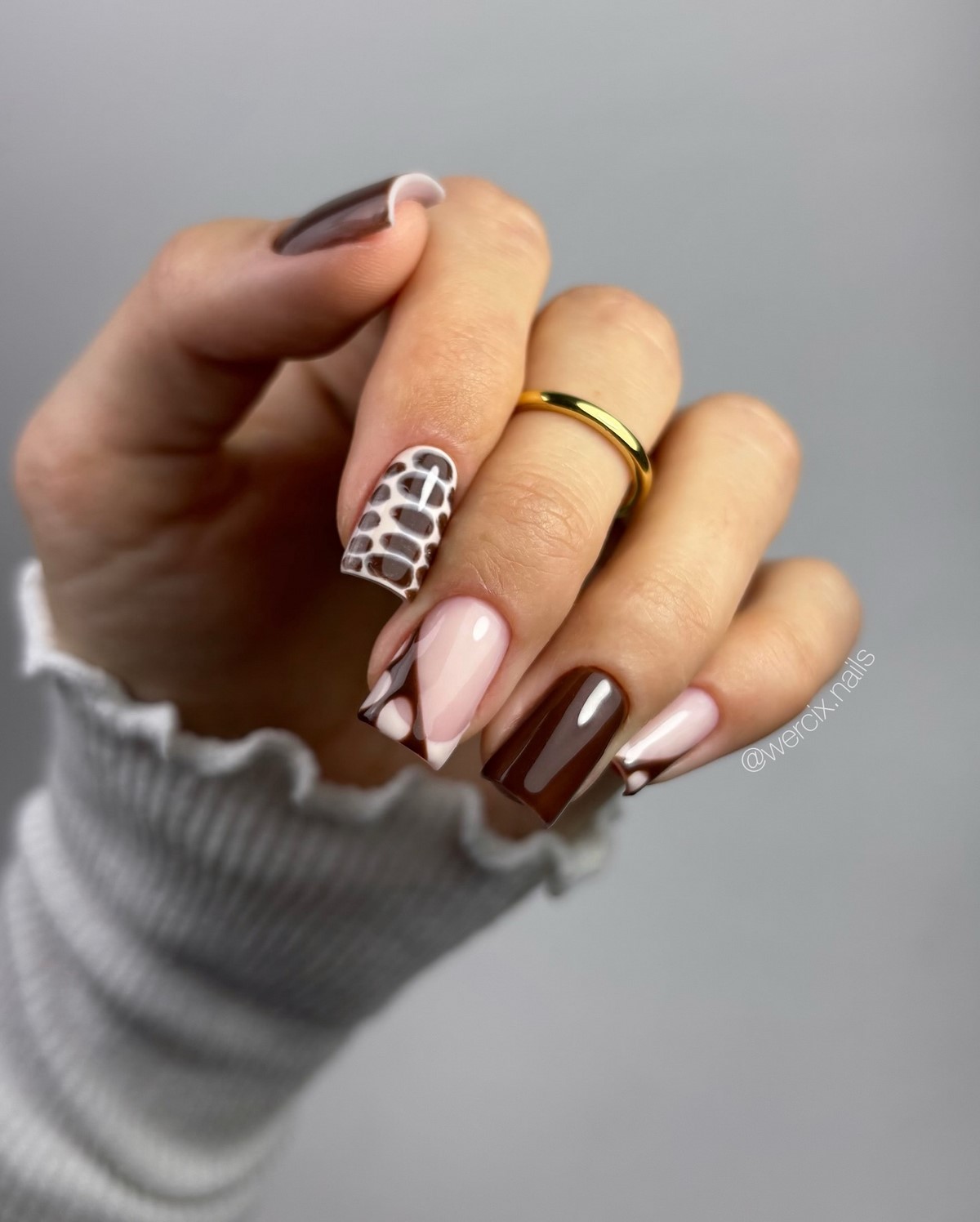 Темно-шоколадний відтінок — хіт зими 2025-2026. У поєднанні із золотим або срібним стемпінгом він виглядає розкішно і затишно одночасно. Такий дизайн можна доповнити матовим топом для ефекту оксамиту. Цей манікюр ідеально підійде для теплих в’язаних образів і вечірніх виходів.