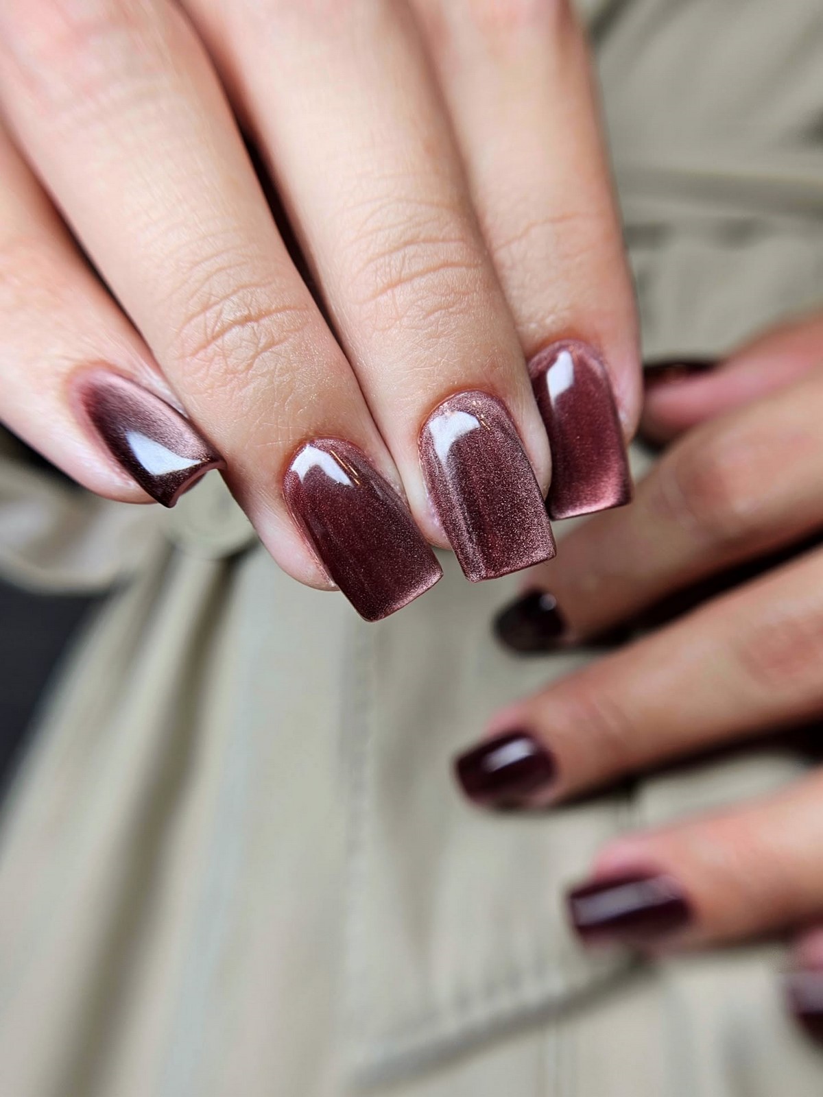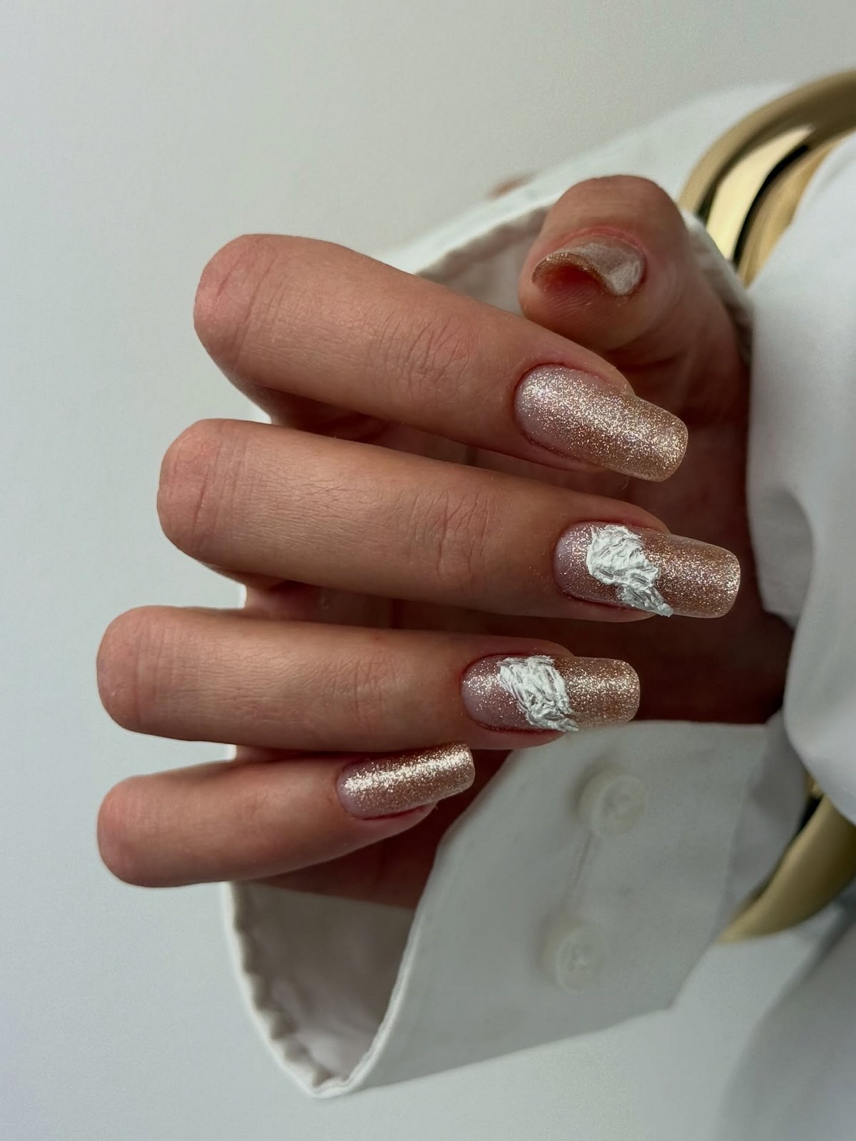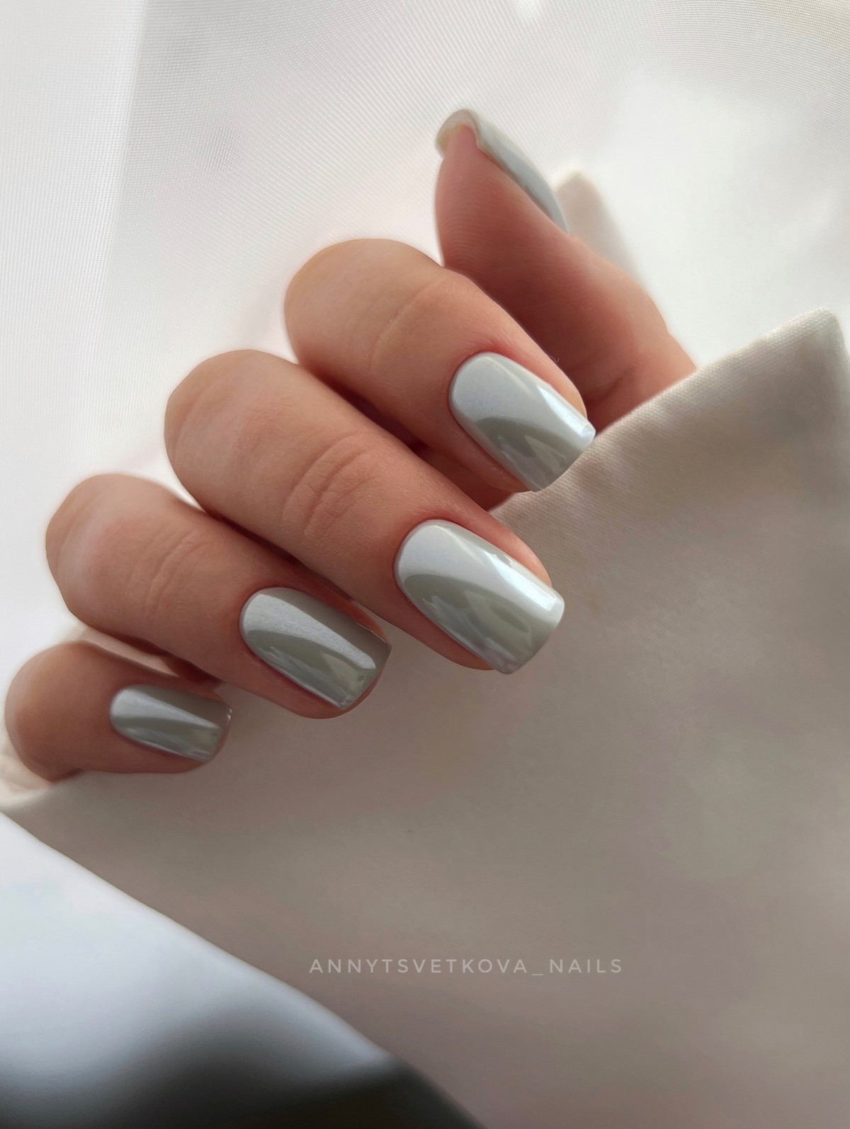 Перлова втирка надає нігтям м’яке сяйво і ефект глянцевої глазурі. Це продовження тренду «clean girl» — акуратний, сяючий, але природний образ. Особливо красиво він виглядає на овальних нігтях і в світлих відтінках: кремовому, молочному, персиковому. Такий манікюр ідеально підходить до зимового светру або вечірньої сукні.