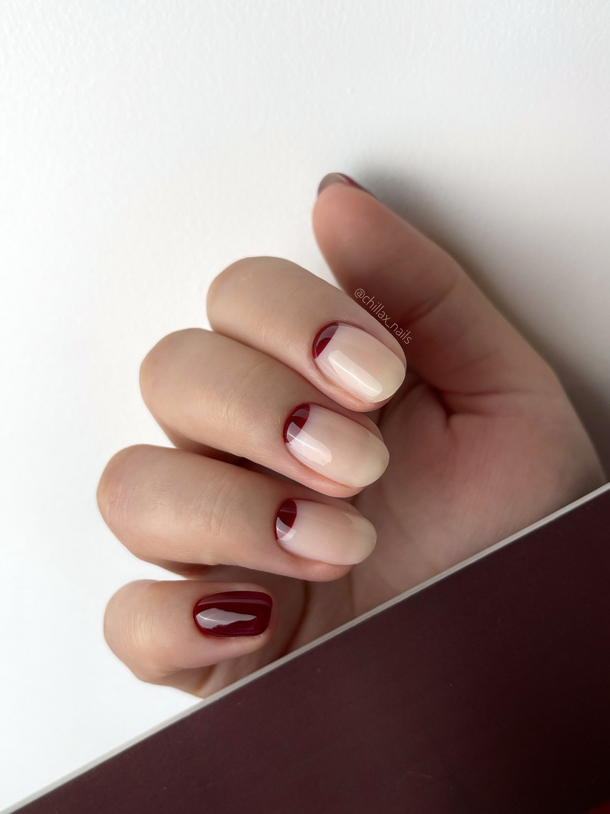Місячний дизайн знову в моді, але в мінімалістичному виконанні. Біла або прозора лунка на тлі нюдового або бордового покриття виглядає стримано, але стильно. Новинка сезону — зміщені лунки, що створюють ефект об’єму. Такий манікюр універсальний і підходить як для ділового, так і для святкового образу.