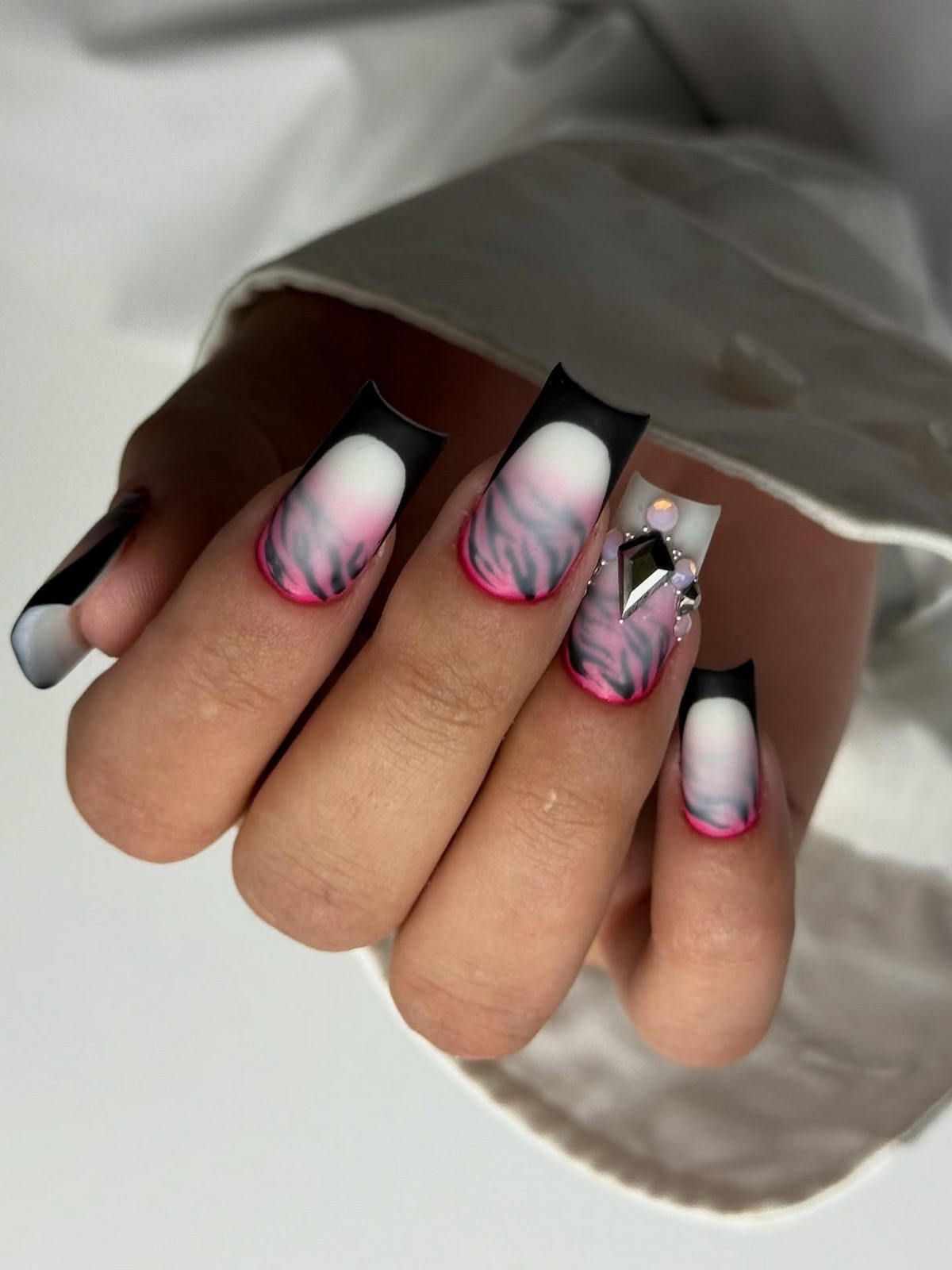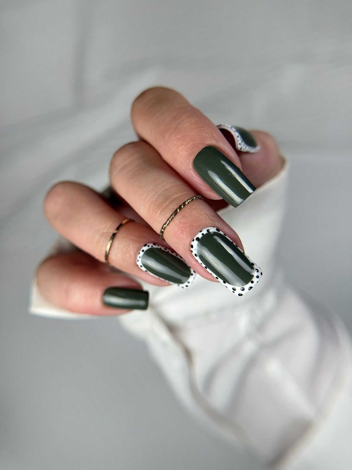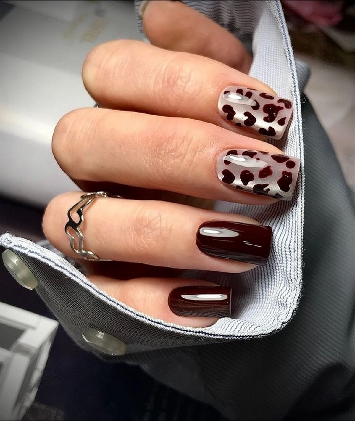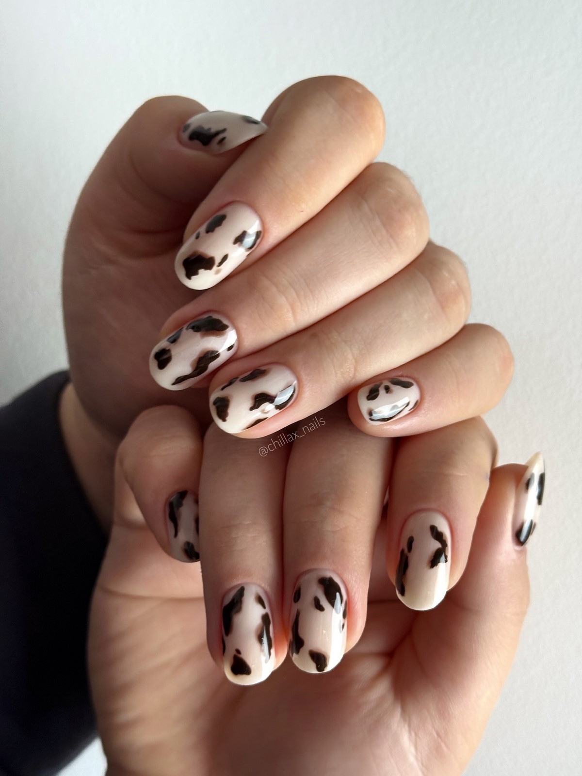 Тваринні мотиви знову в тренді, і коров’ячий принт зайняв особливе місце. Білий фон з чорними або коричневими плямами створює грайливий, але стильний ефект. Варіант для тих, хто любить оригінальні рішення без перебору. Такий манікюр можна доповнити золотим контуром або глянцевим топом.