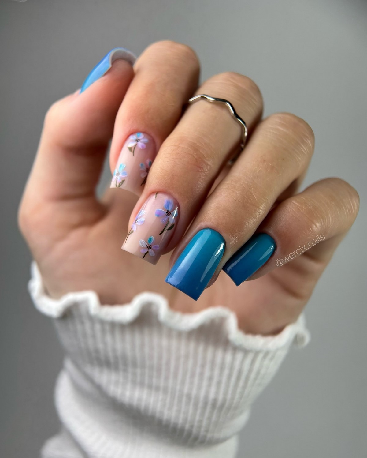 Квіткові візерунки не втрачають актуальності навіть взимку. На тлі холодних відтінків — блакитного, молочного, бузкового — тонкі гілочки і мініатюрні бутони створюють ефект морозних візерунків. Такий дизайн виглядає романтично і додає в зимовий образ ніжності та поетичності.