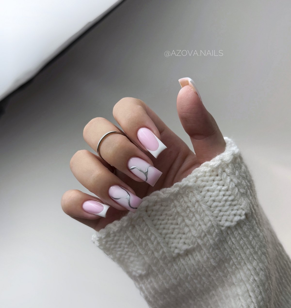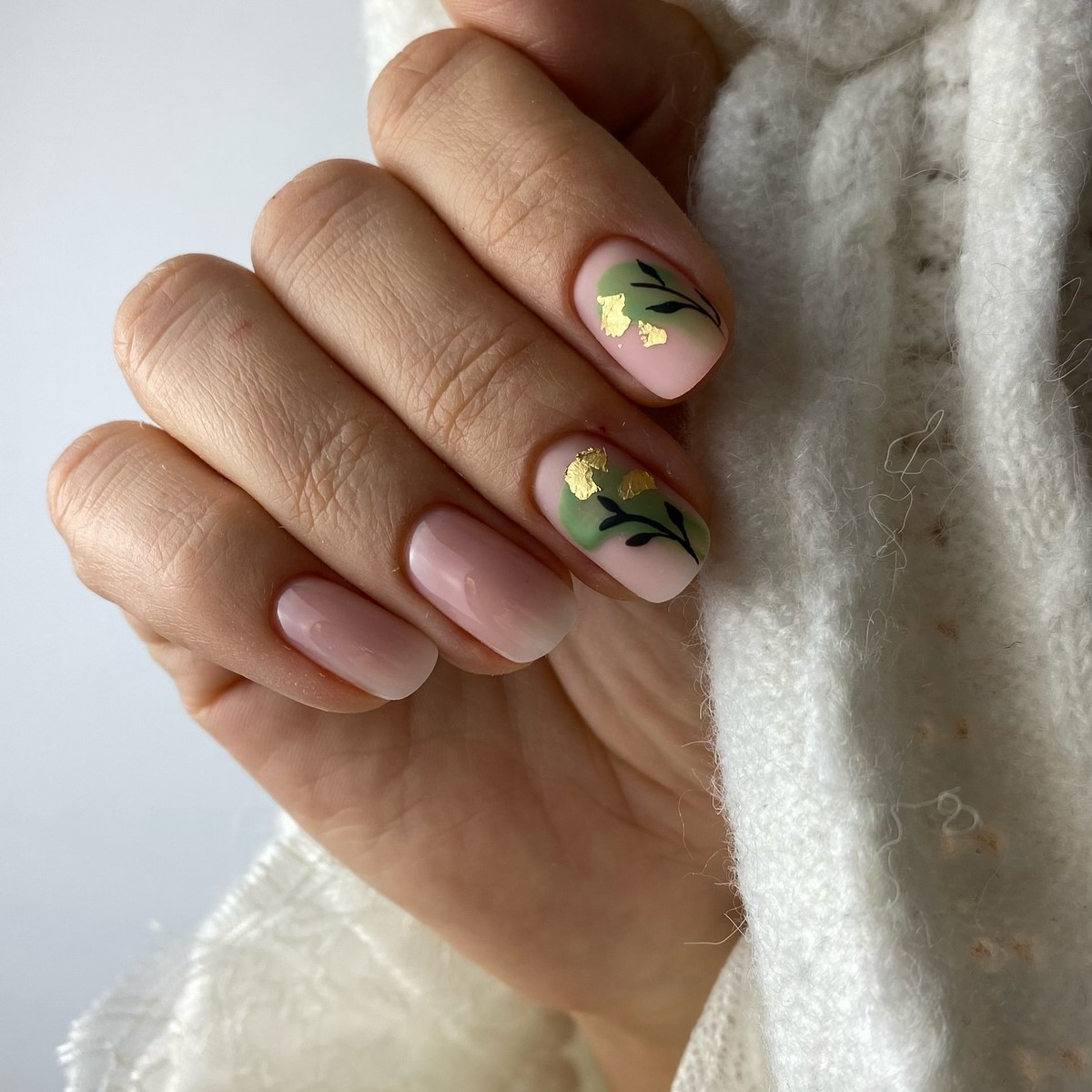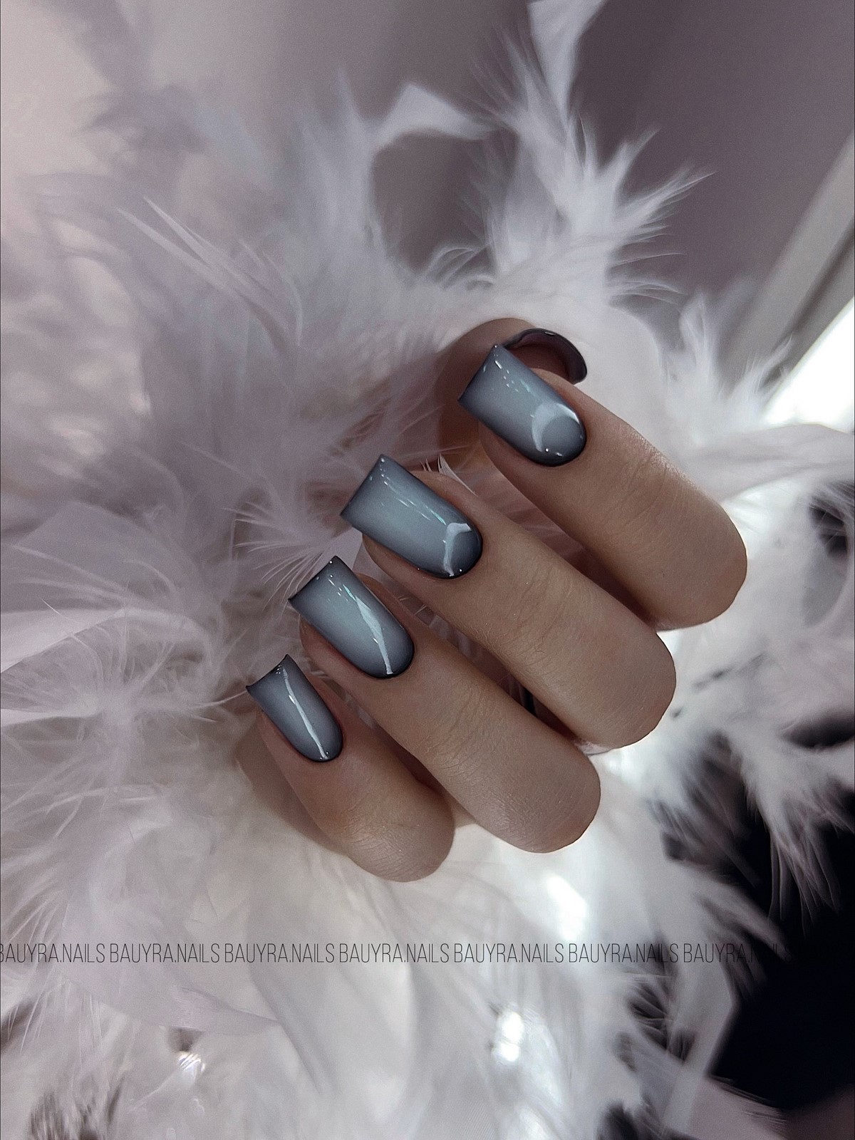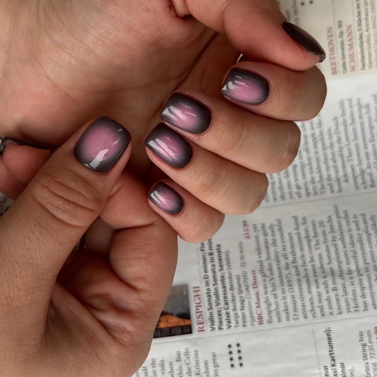 «Аура» — це м’який перехід кольору від центру нігтя до країв, що створює ефект світіння. У тренді — поєднання рожевого і білого, сірого і блакитного, а також теплого персика з кремовим. Цей манікюр виглядає ніжно і жіночно, ніби підсвічуючи нігті зсередини. Він ідеально підходить для зимових весіль, вечірок і повсякденного стилю.