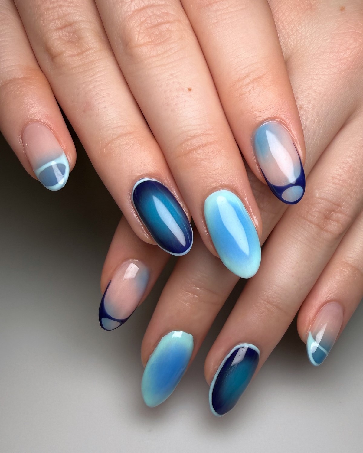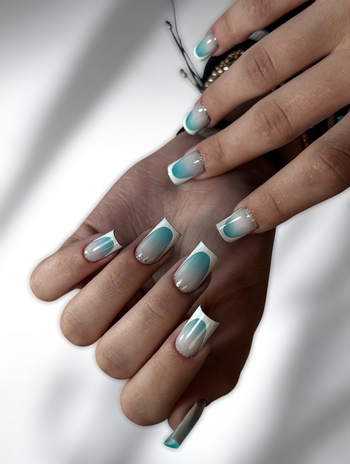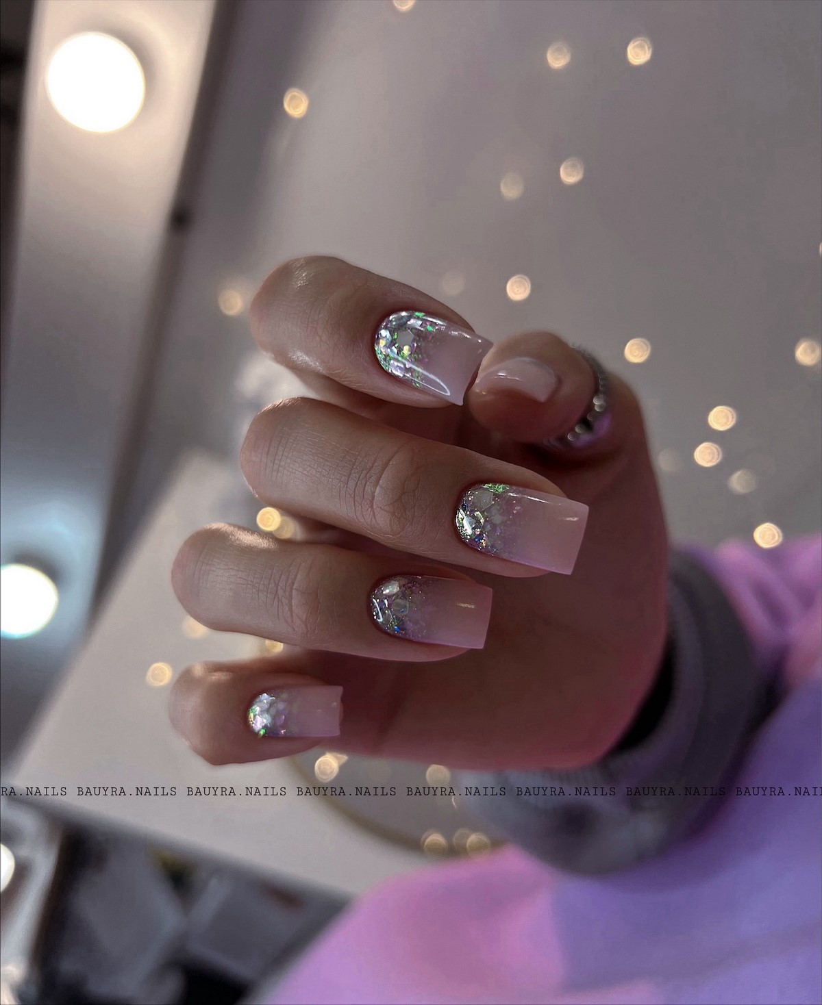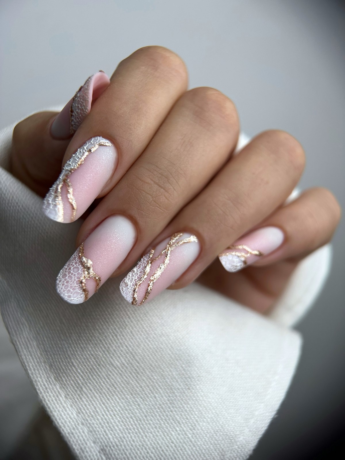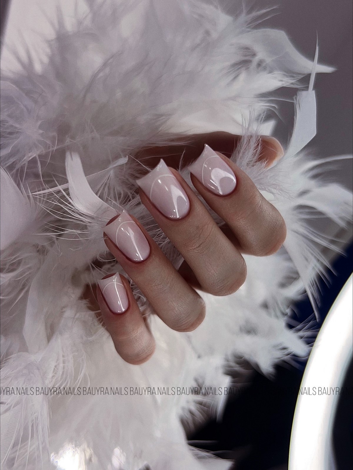 «Аура» — це м’який перехід кольору від центру нігтя до країв, що створює ефект світіння. У тренді — поєднання рожевого і білого, сірого і блакитного, а також теплого персика з кремовим. Цей манікюр виглядає ніжно і жіночно, ніби підсвічуючи нігті зсередини. Він ідеально підходить для зимових весіль, вечірок і повсякденного стилю.