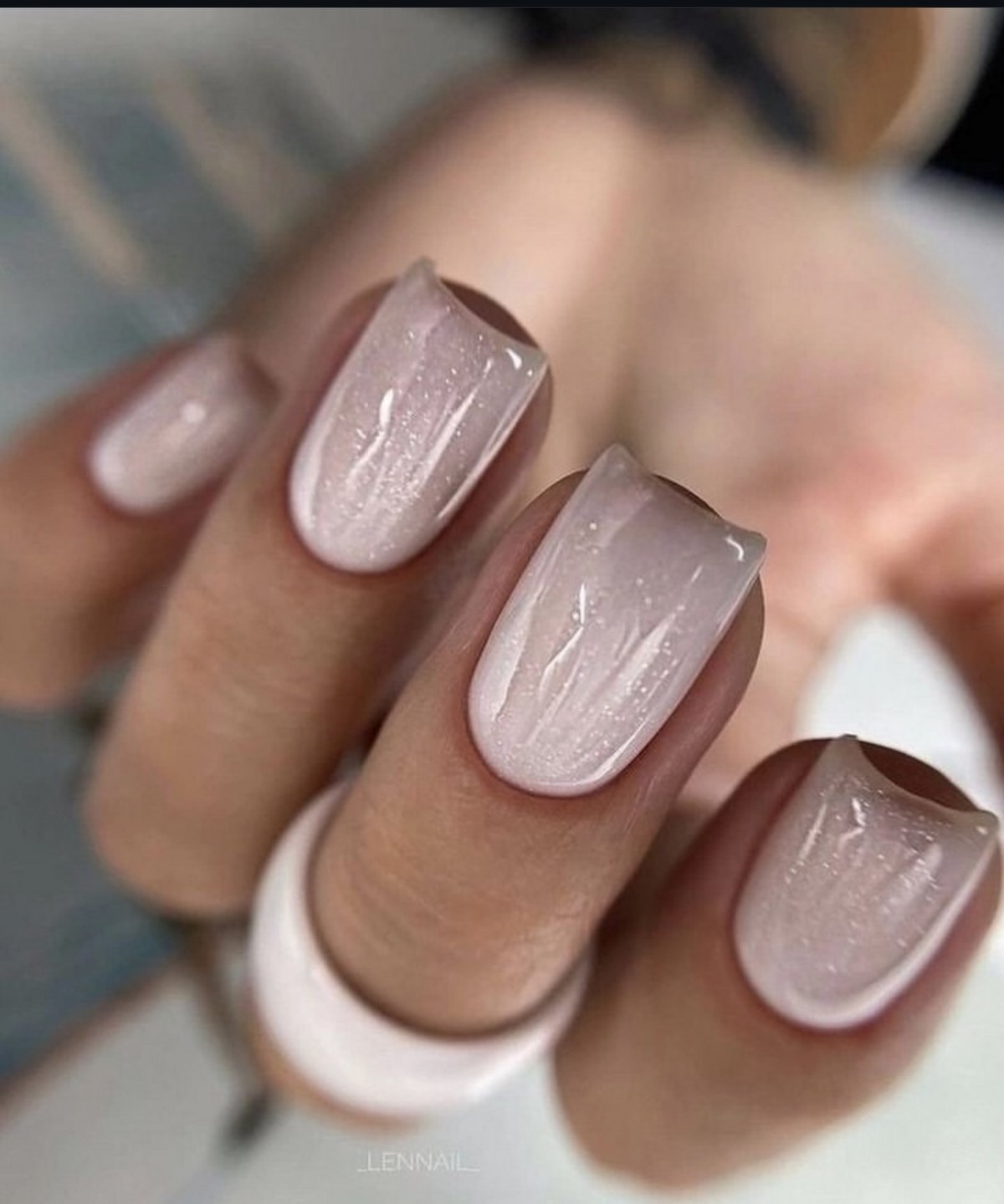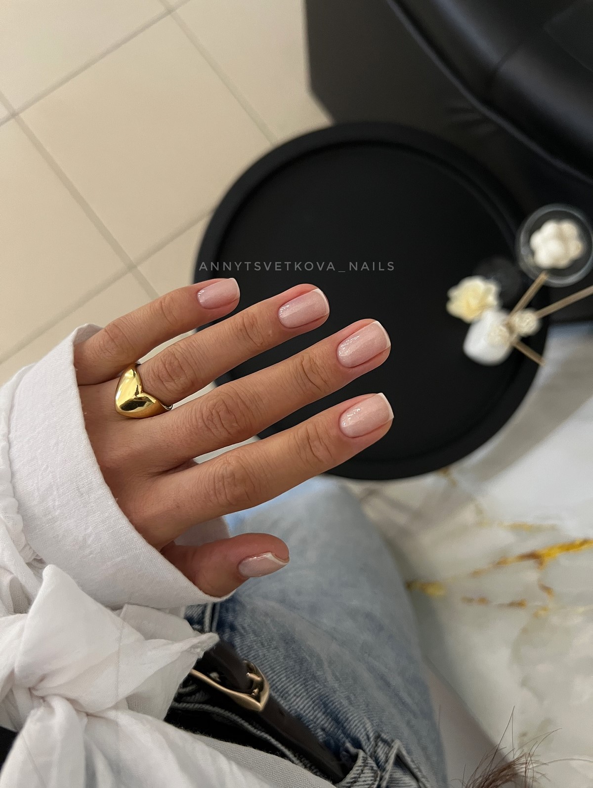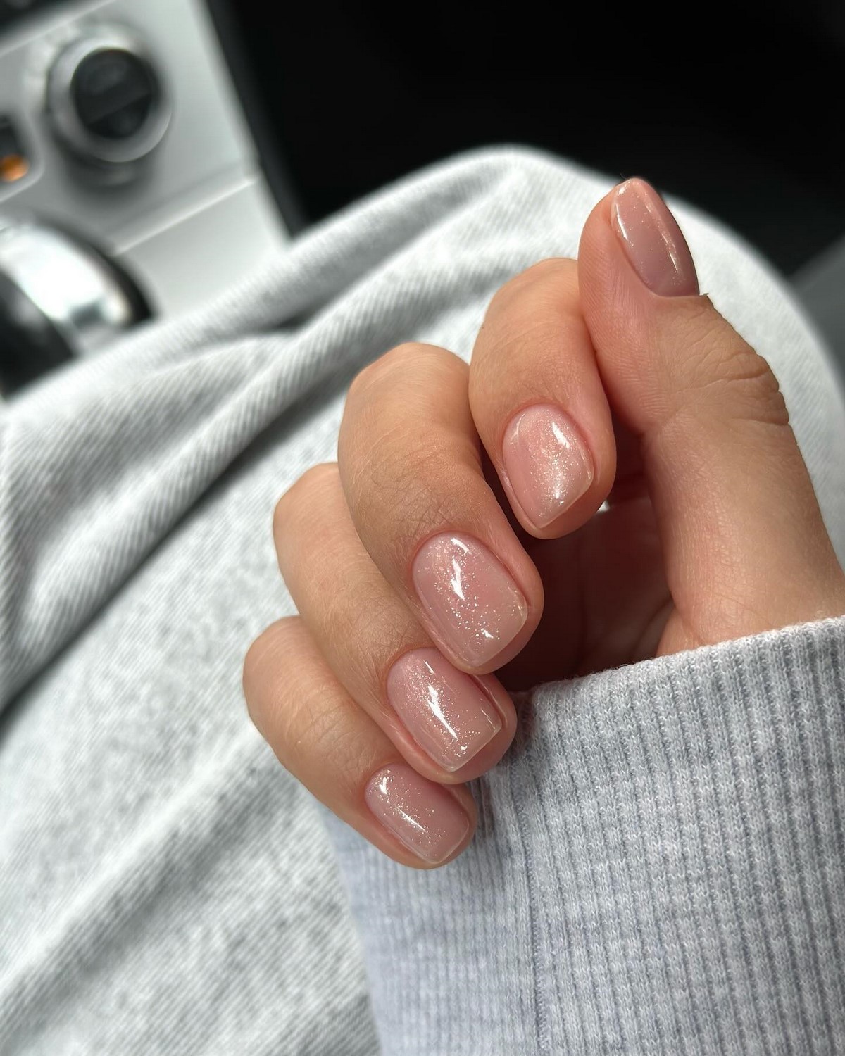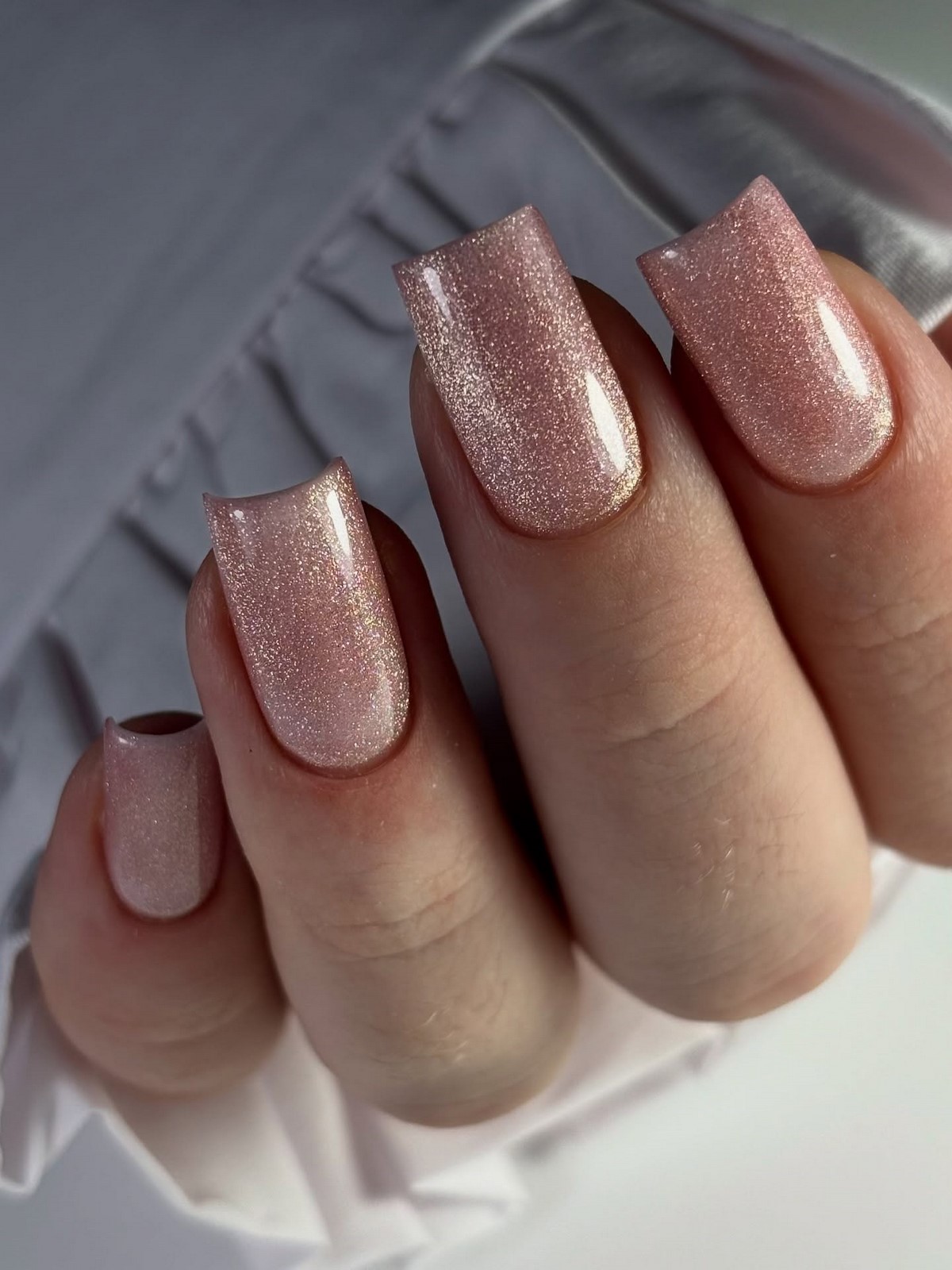Нюдова основа з делікатним мерехтінням ідеально підходить для вечірніх виходів і святкових заходів. Блискітки можуть бути розсипані по всій поверхні нігтя, створюючи ефект зоряного пилу, або сконцентровані біля основи або на кінчику. Особливо стильно виглядають золоті та срібні мікрошимери на теплих нюдових відтінках, а також голографічні частинки, що змінюють колір при різному освітленні.