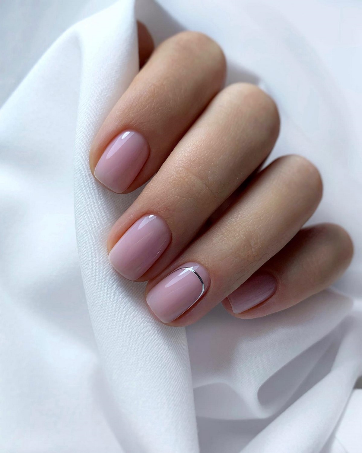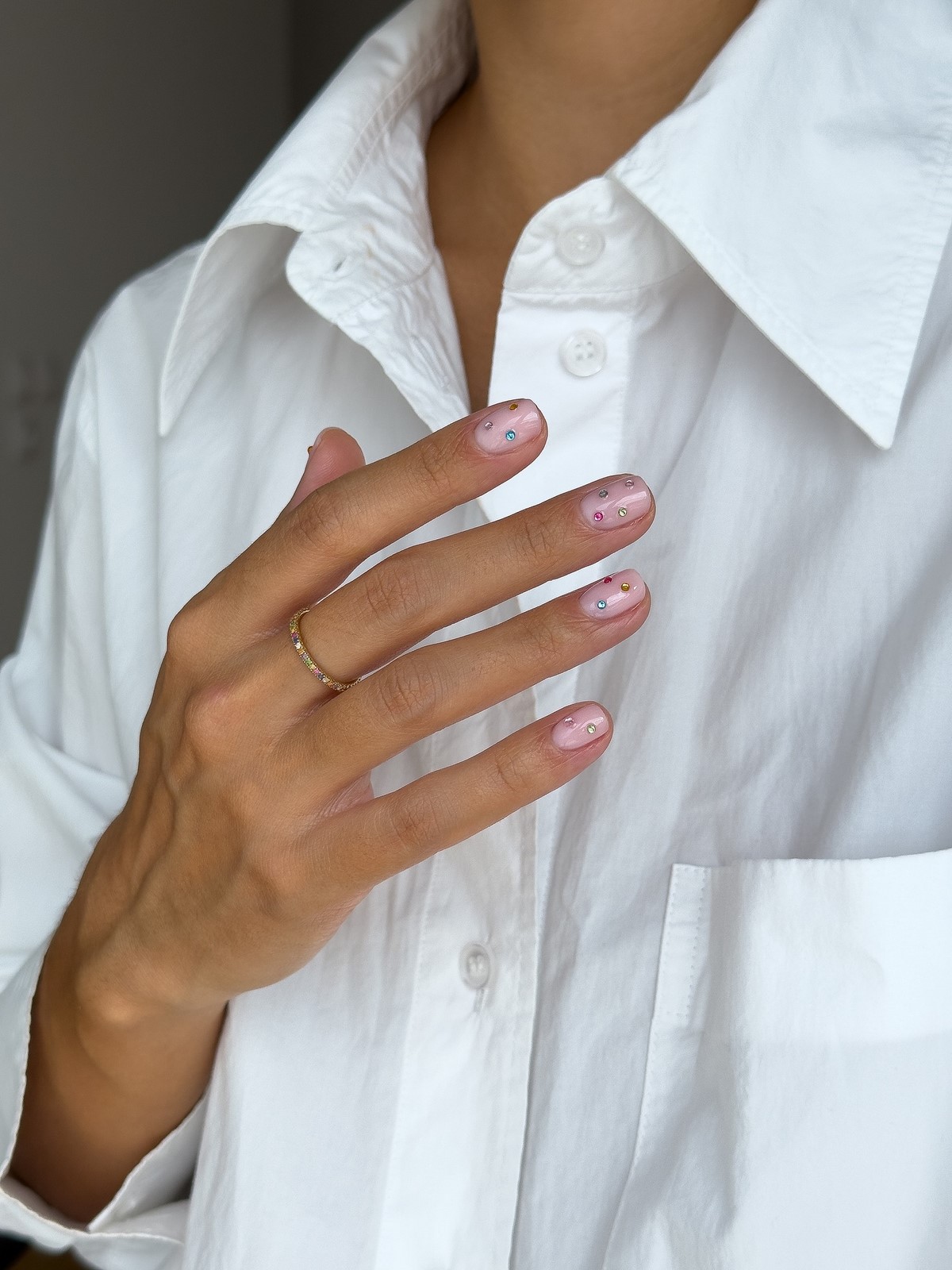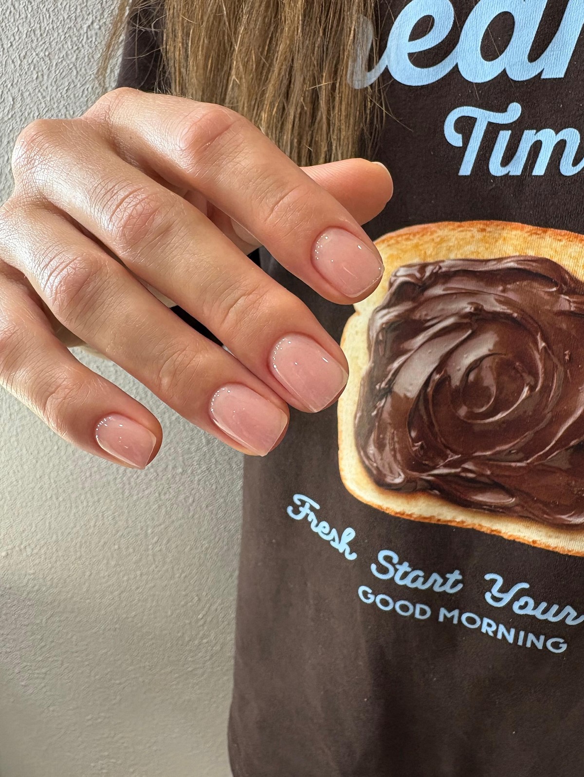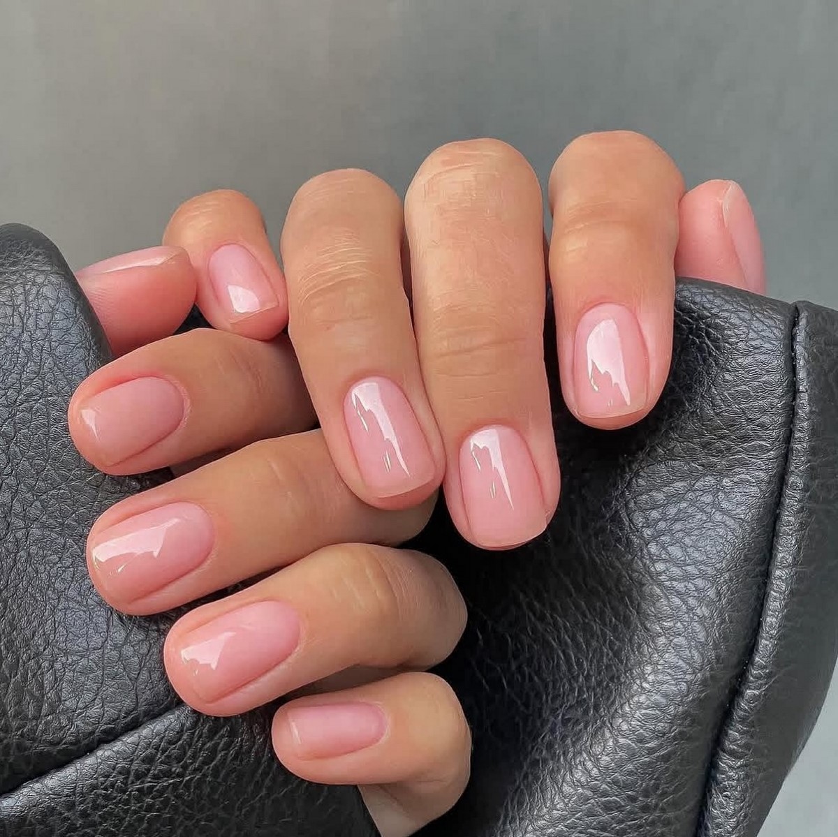 Нюдова основа з делікатним мерехтінням ідеально підходить для вечірніх виходів і святкових заходів. Блискітки можуть бути розсипані по всій поверхні нігтя, створюючи ефект зоряного пилу, або сконцентровані біля основи або на кінчику. Особливо стильно виглядають золоті та срібні мікрошимери на теплих нюдових відтінках, а також голографічні частинки, що змінюють колір при різному освітленні.