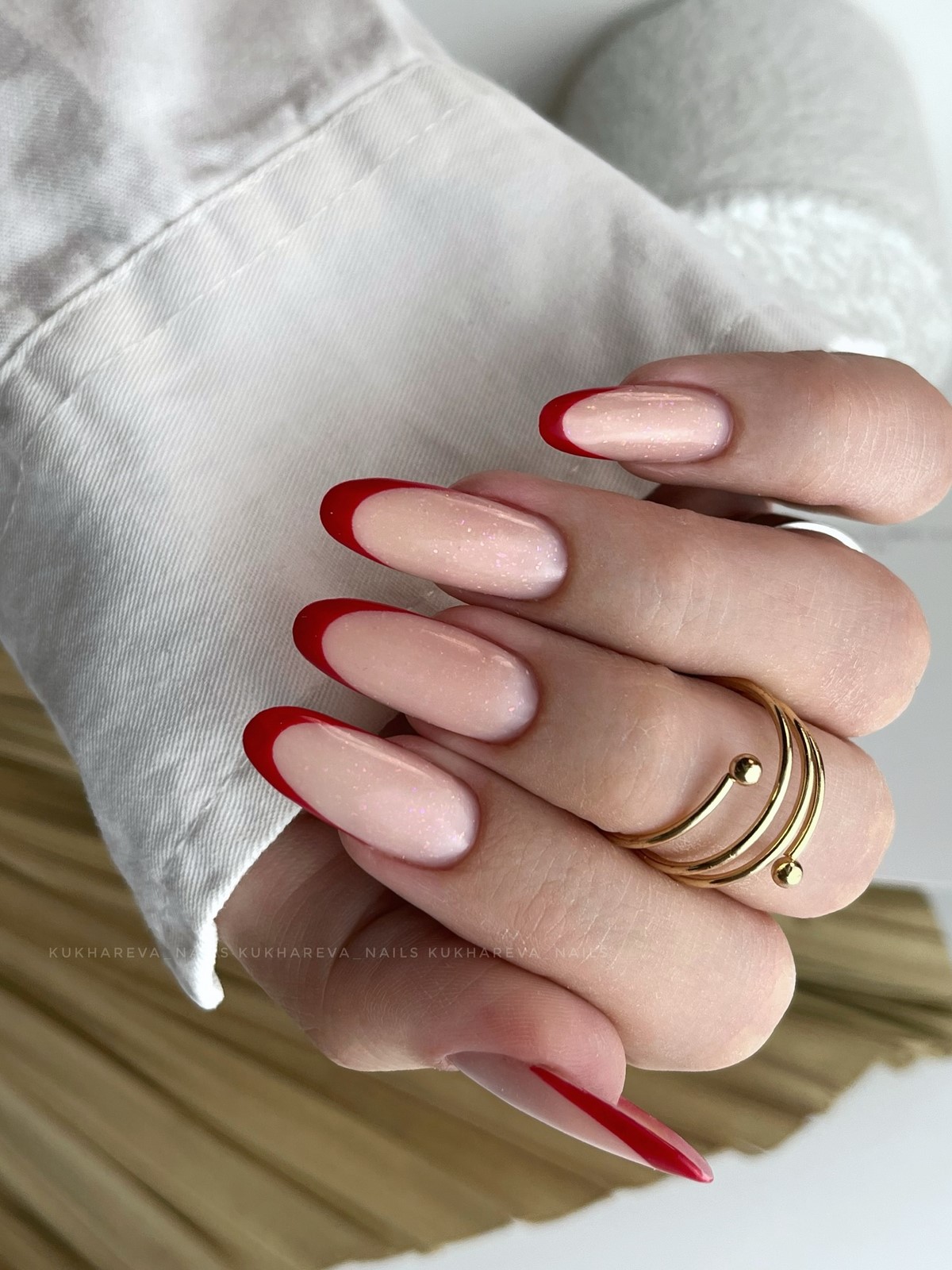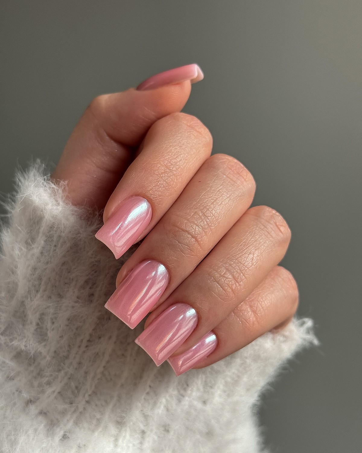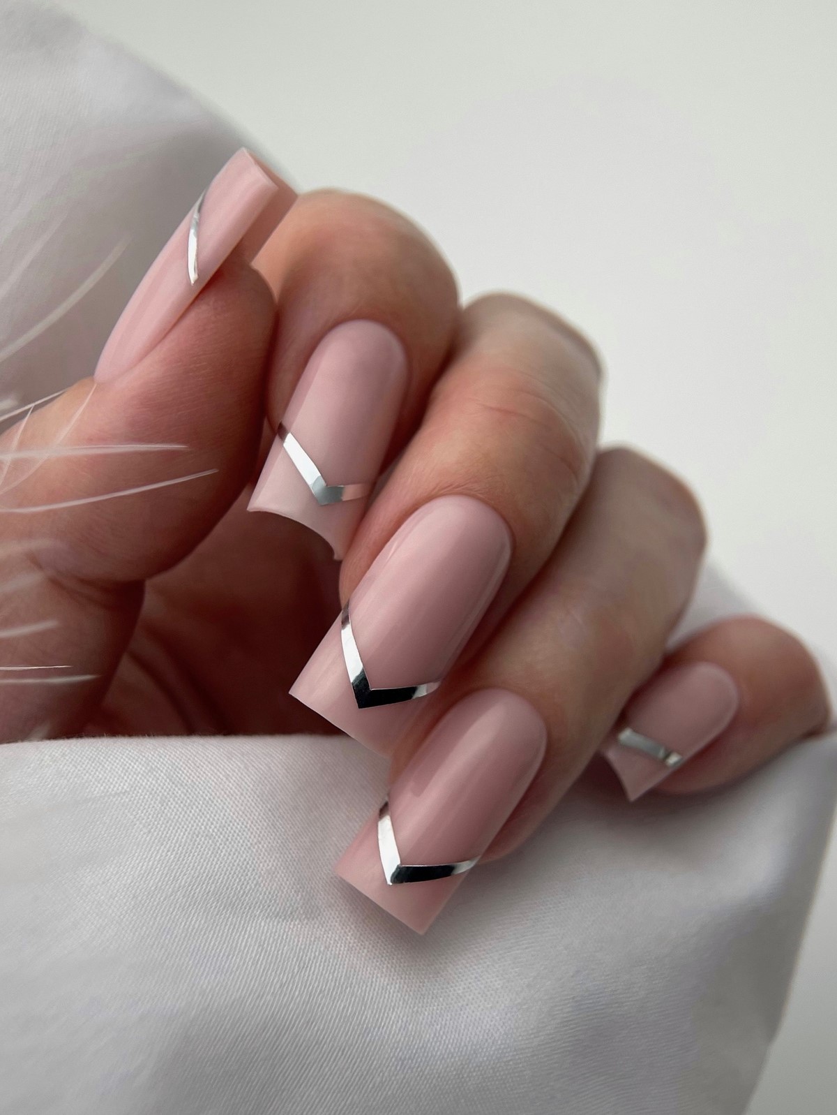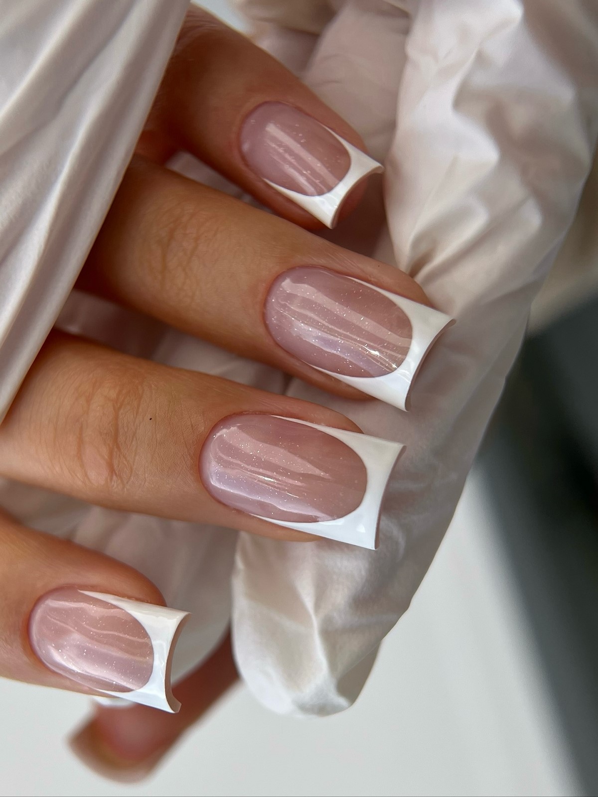 Нюдова основа з делікатним мерехтінням ідеально підходить для вечірніх виходів і святкових заходів. Блискітки можуть бути розсипані по всій поверхні нігтя, створюючи ефект зоряного пилу, або сконцентровані біля основи або на кінчику. Особливо стильно виглядають золоті та срібні мікрошимери на теплих нюдових відтінках, а також голографічні частинки, що змінюють колір при різному освітленні.