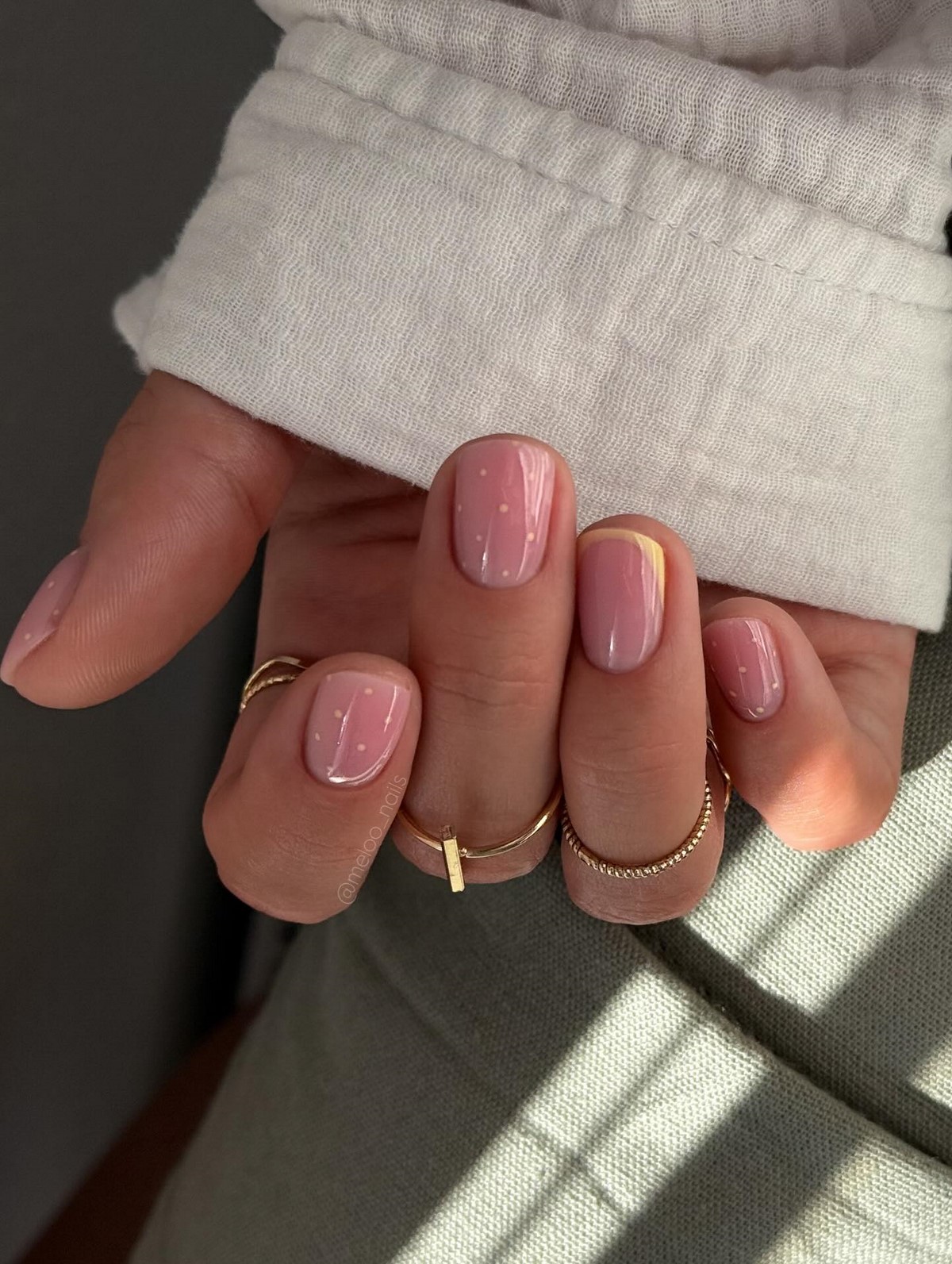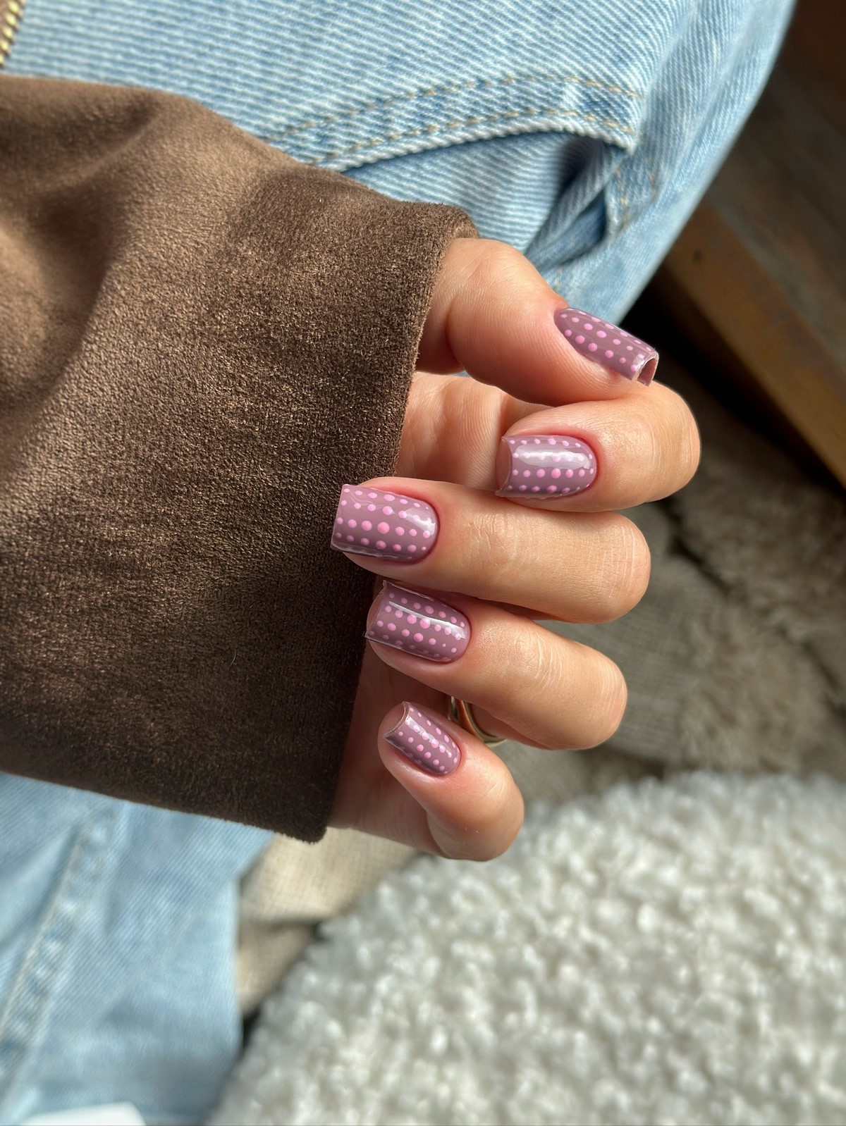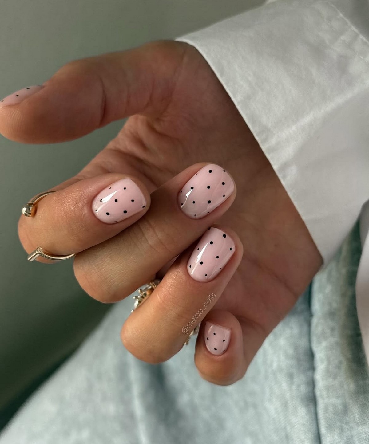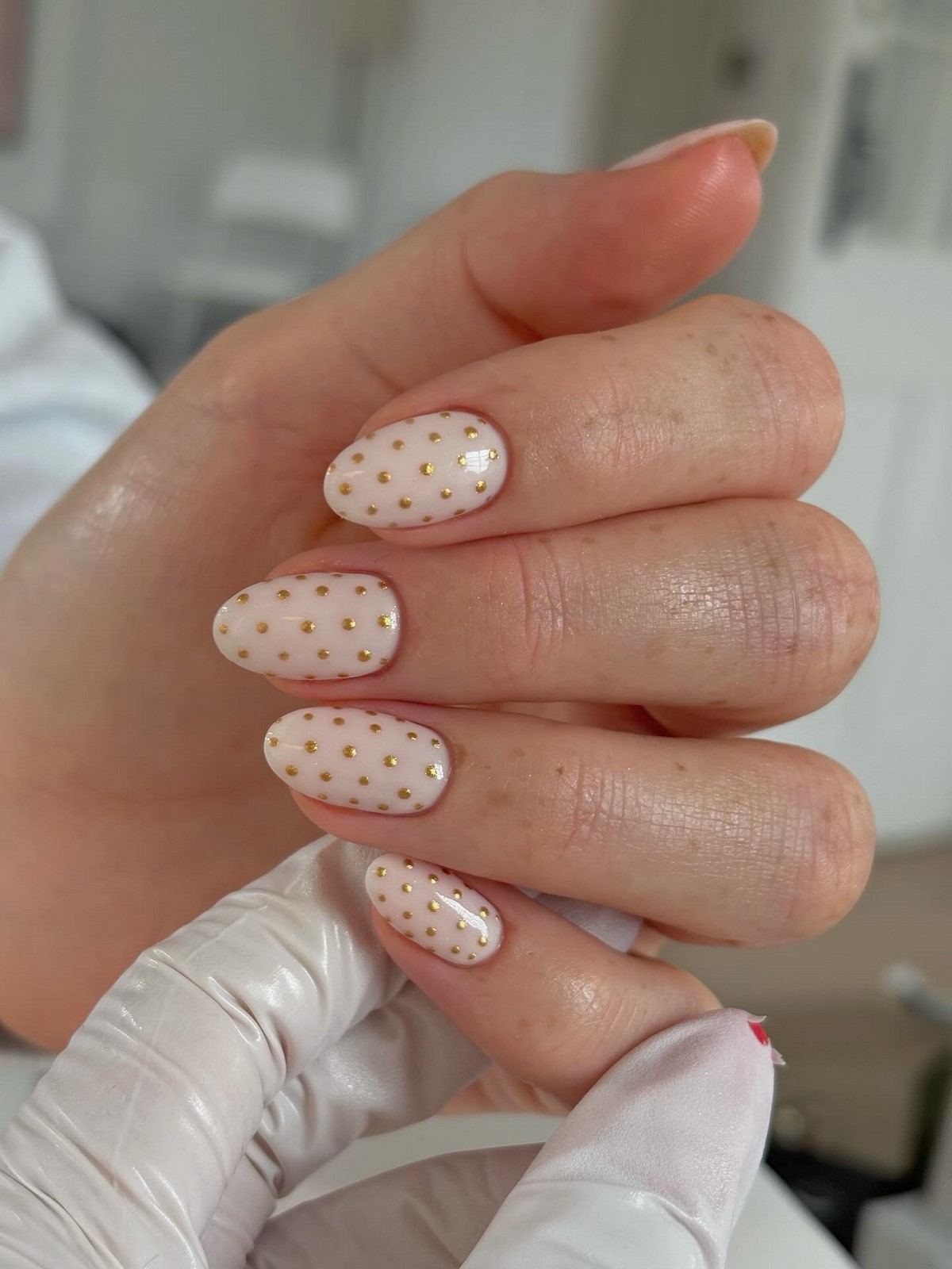 Грайливий горошок на нюдовій базі привносить нотку ретро-шарму в сучасний манікюр. Крапки можуть бути виконані в контрастних відтінках — білому, чорному, золотому — або в більш приглушеній гамі для створення ефекту тон-в-тон. Розташування горошку варіюється від хаотичного до впорядкованого, а розмір крапок — від мініатюрних до великих акцентних, що дозволяє створювати різноманітні композиції під будь-який стиль.