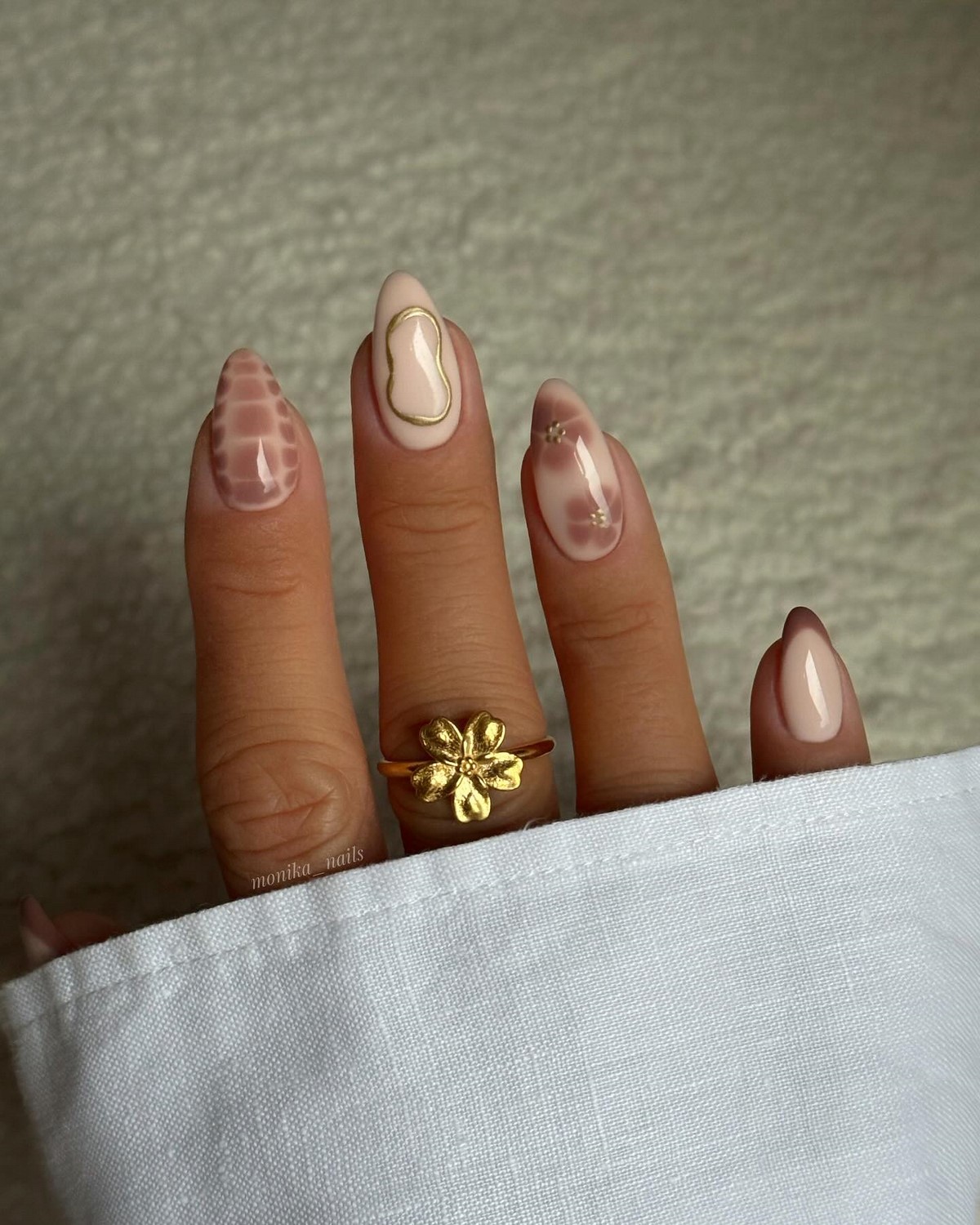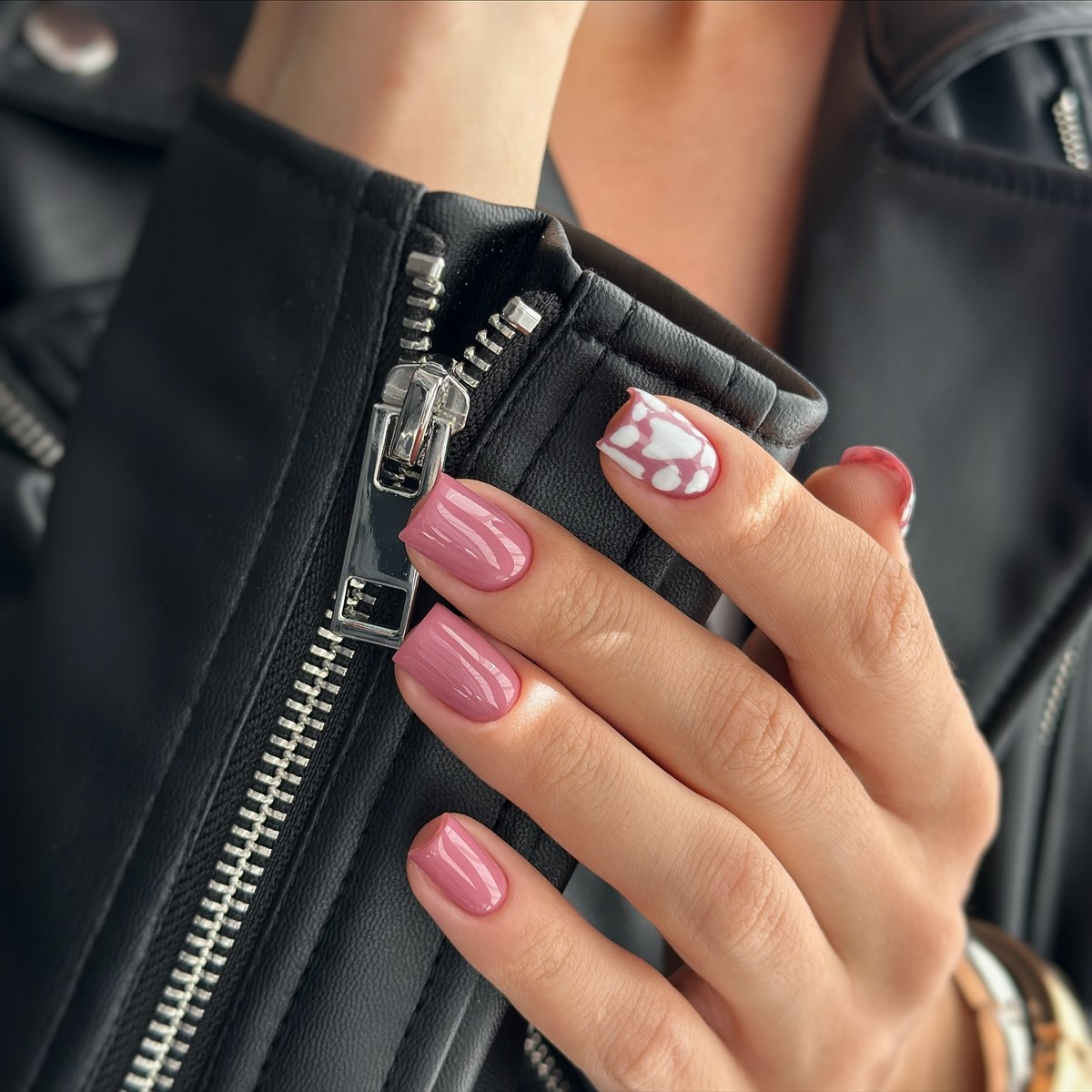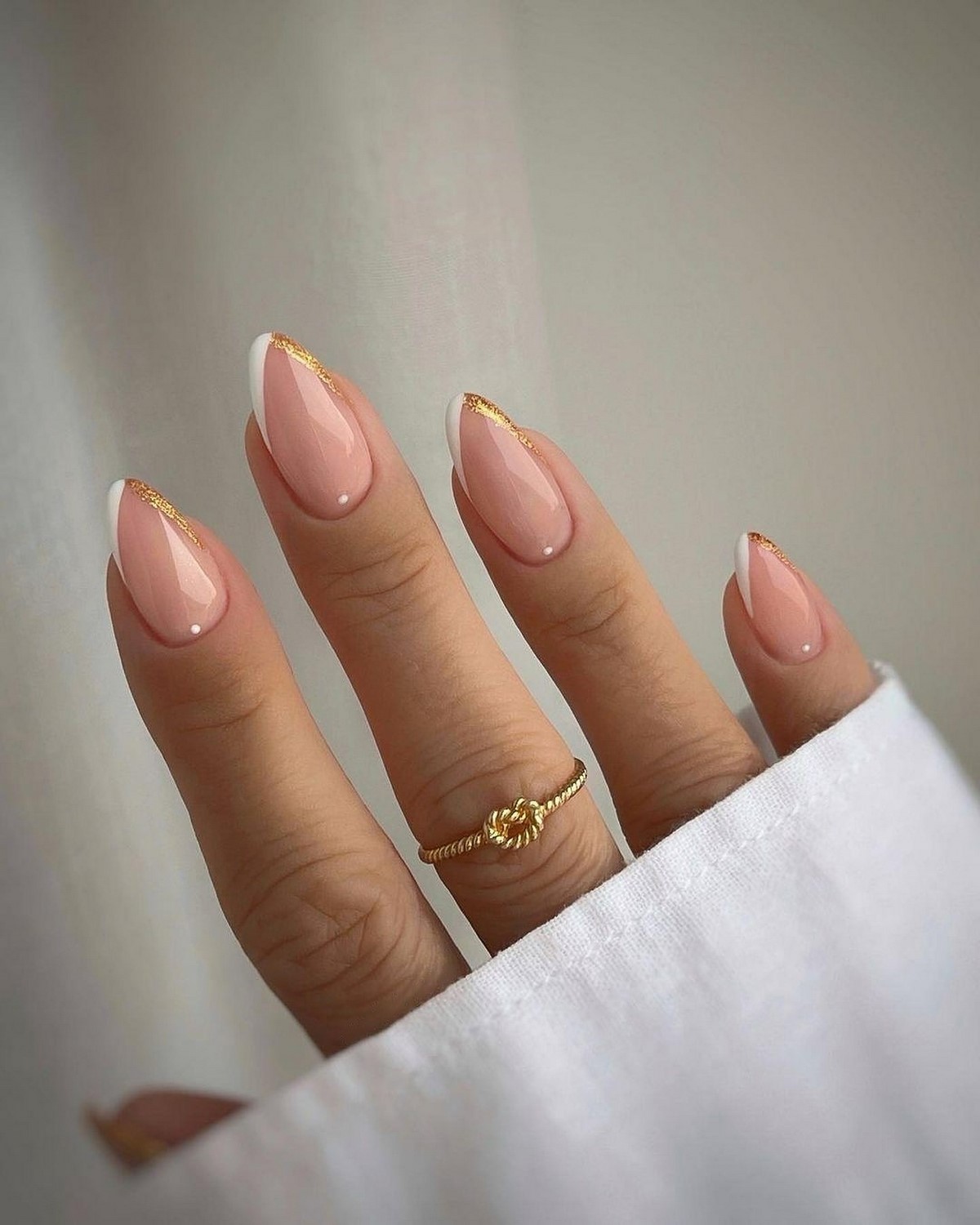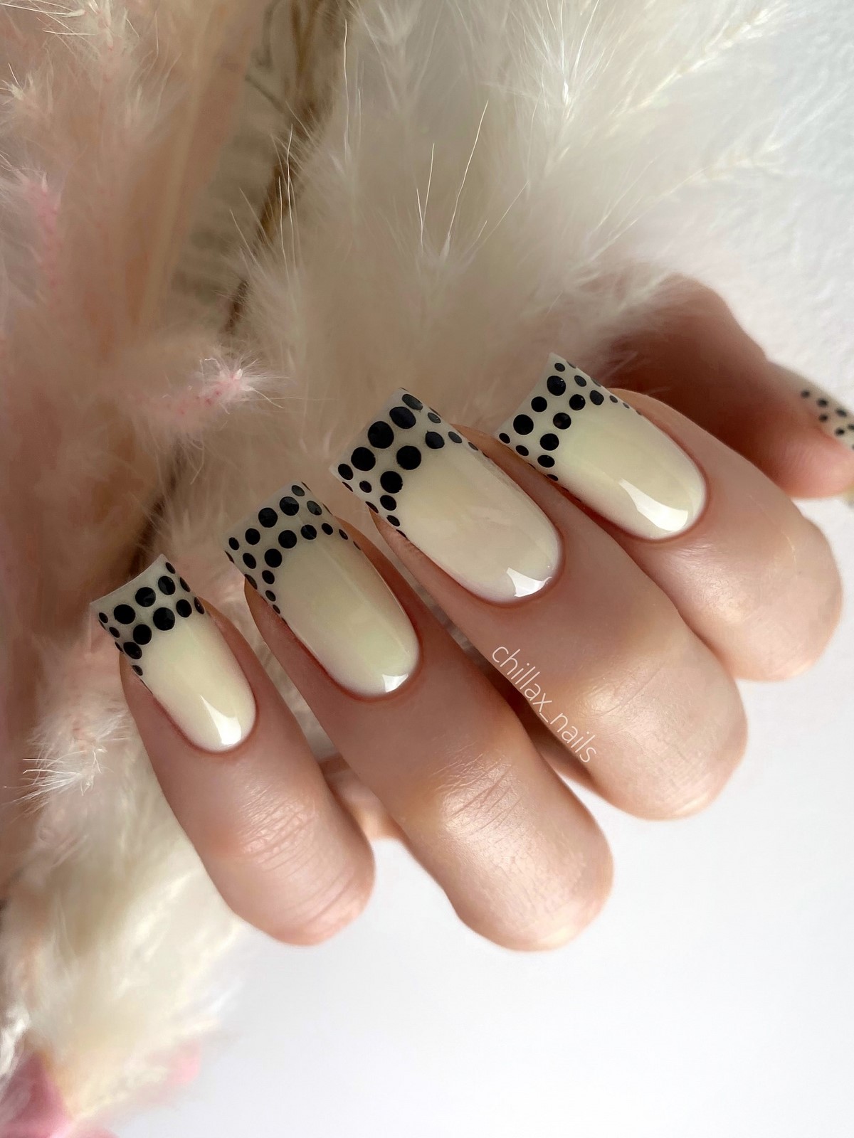 Грайливий горошок на нюдовій базі привносить нотку ретро-шарму в сучасний манікюр. Крапки можуть бути виконані в контрастних відтінках — білому, чорному, золотому — або в більш приглушеній гамі для створення ефекту тон-в-тон. Розташування горошку варіюється від хаотичного до впорядкованого, а розмір крапок — від мініатюрних до великих акцентних, що дозволяє створювати різноманітні композиції під будь-який стиль.
