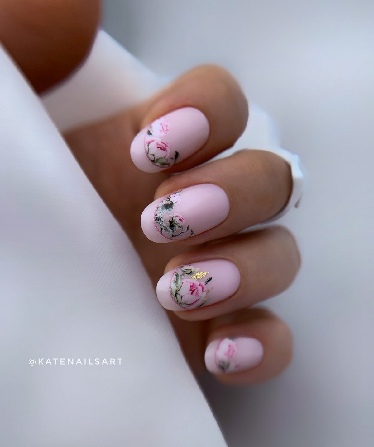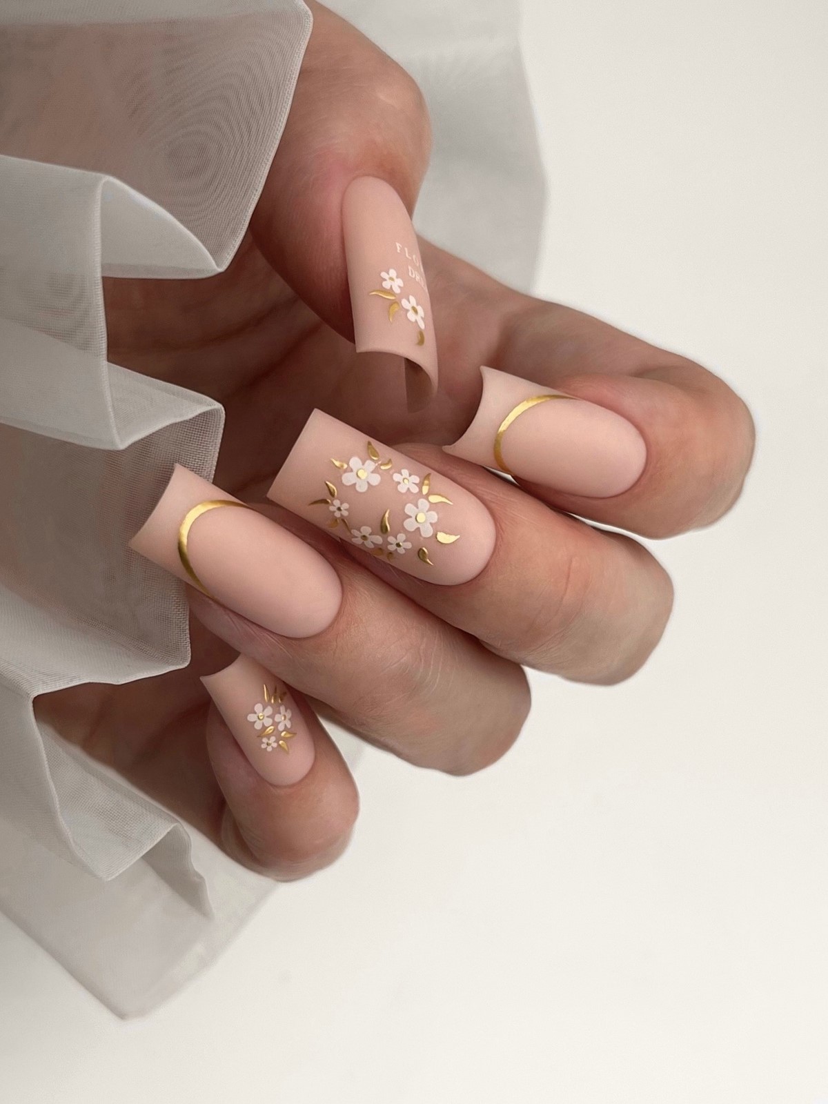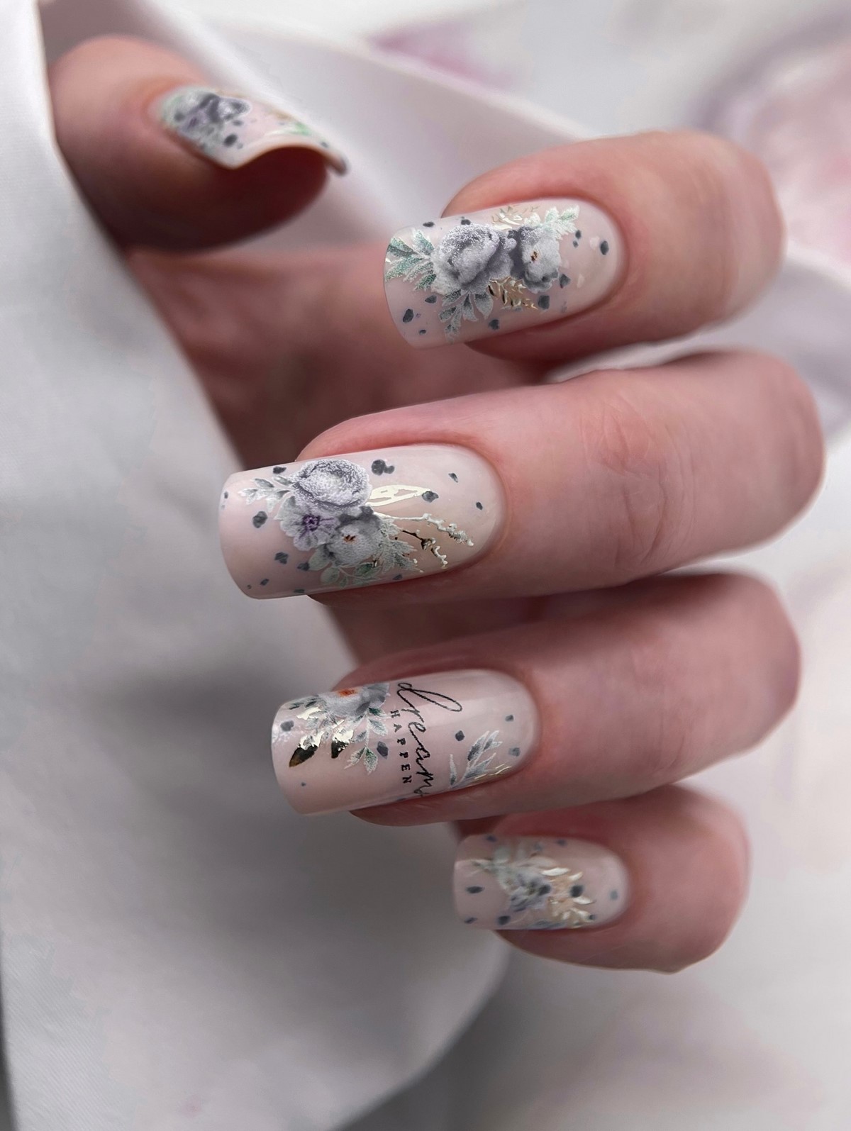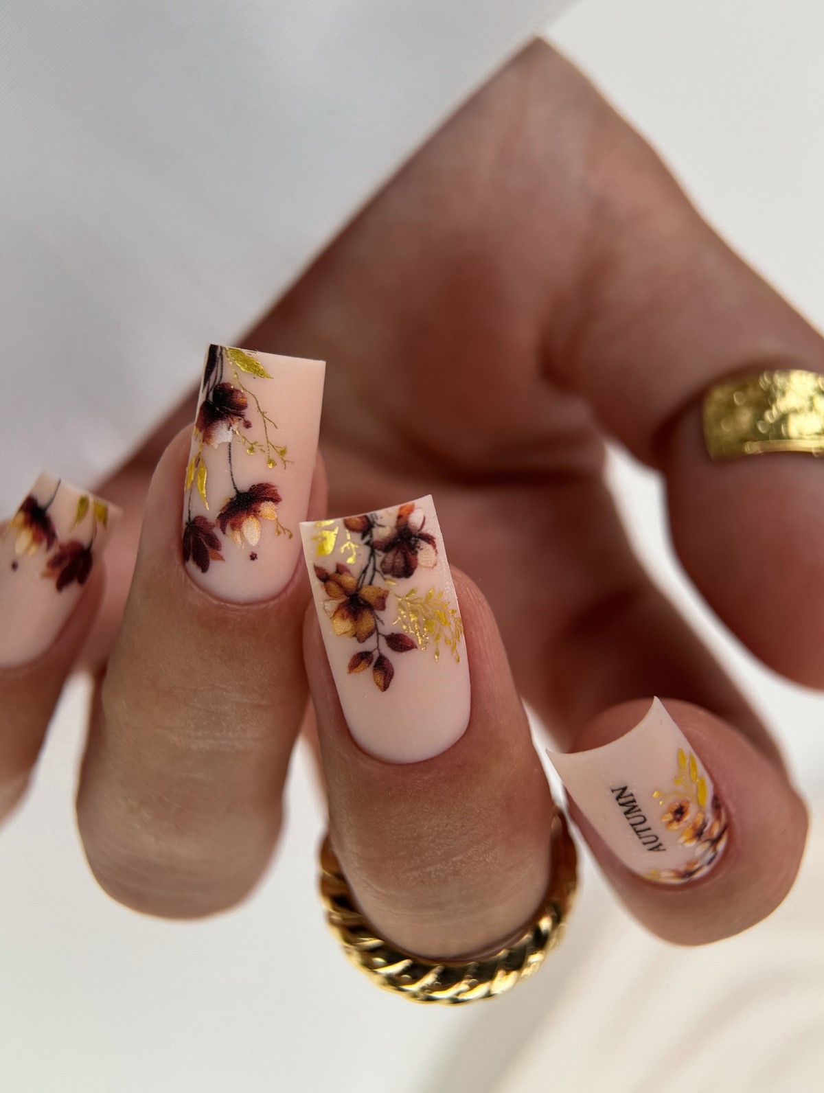 Ніжні квіткові мотиви на нюдовій основі втілюють романтичність і жіночність. В осінньо-зимовому сезоні актуальні приглушені квіткові композиції в теракотових, бордових, пильно-рожевих і смарагдових тонах. Малюнки можуть бути виконані тонкими лініями для створення акварельного ефекту або більш щільними мазками для графічності, а розташування квітів — від одного акцентного нігтя до повного покриття всіх пальців.