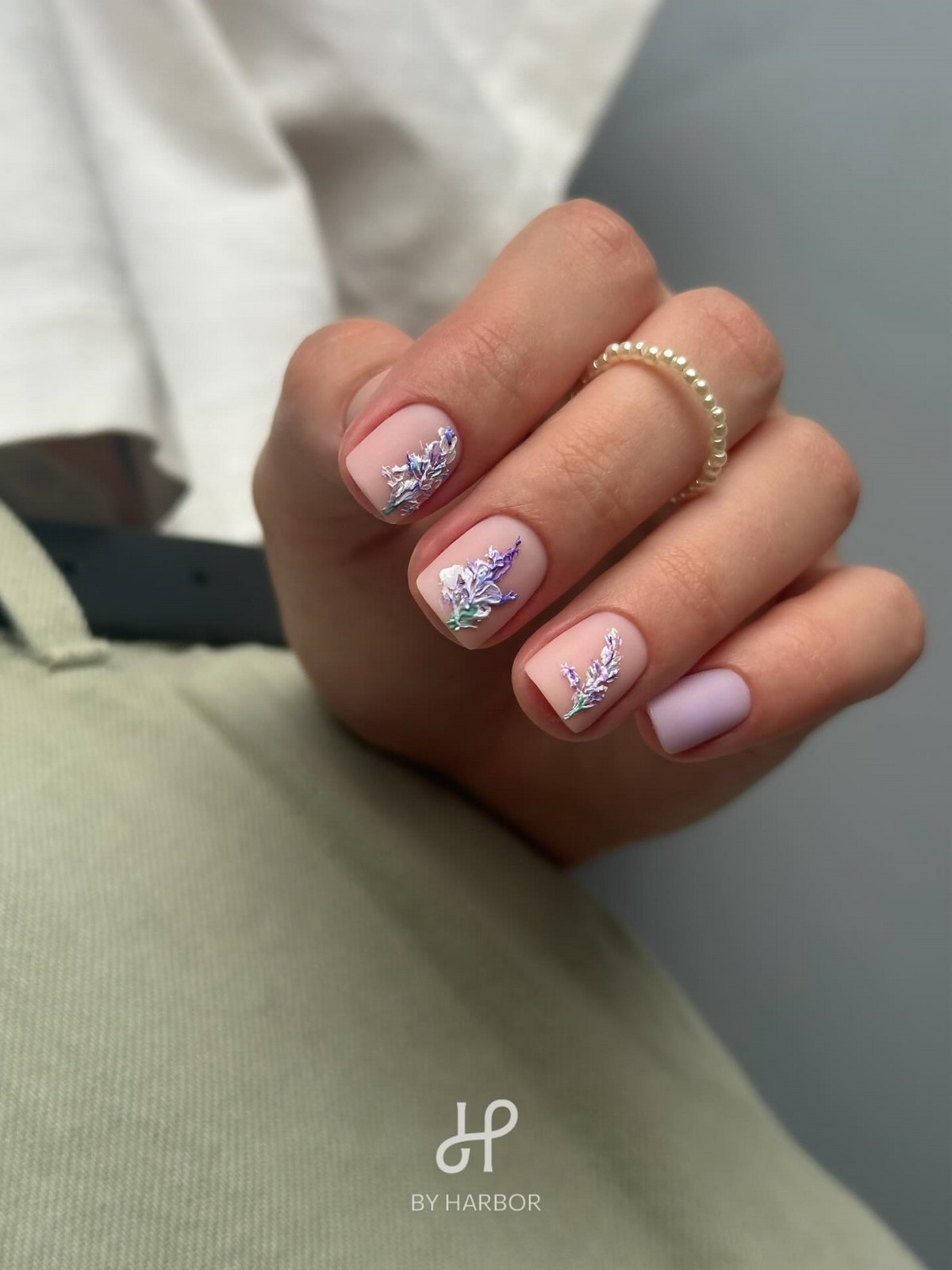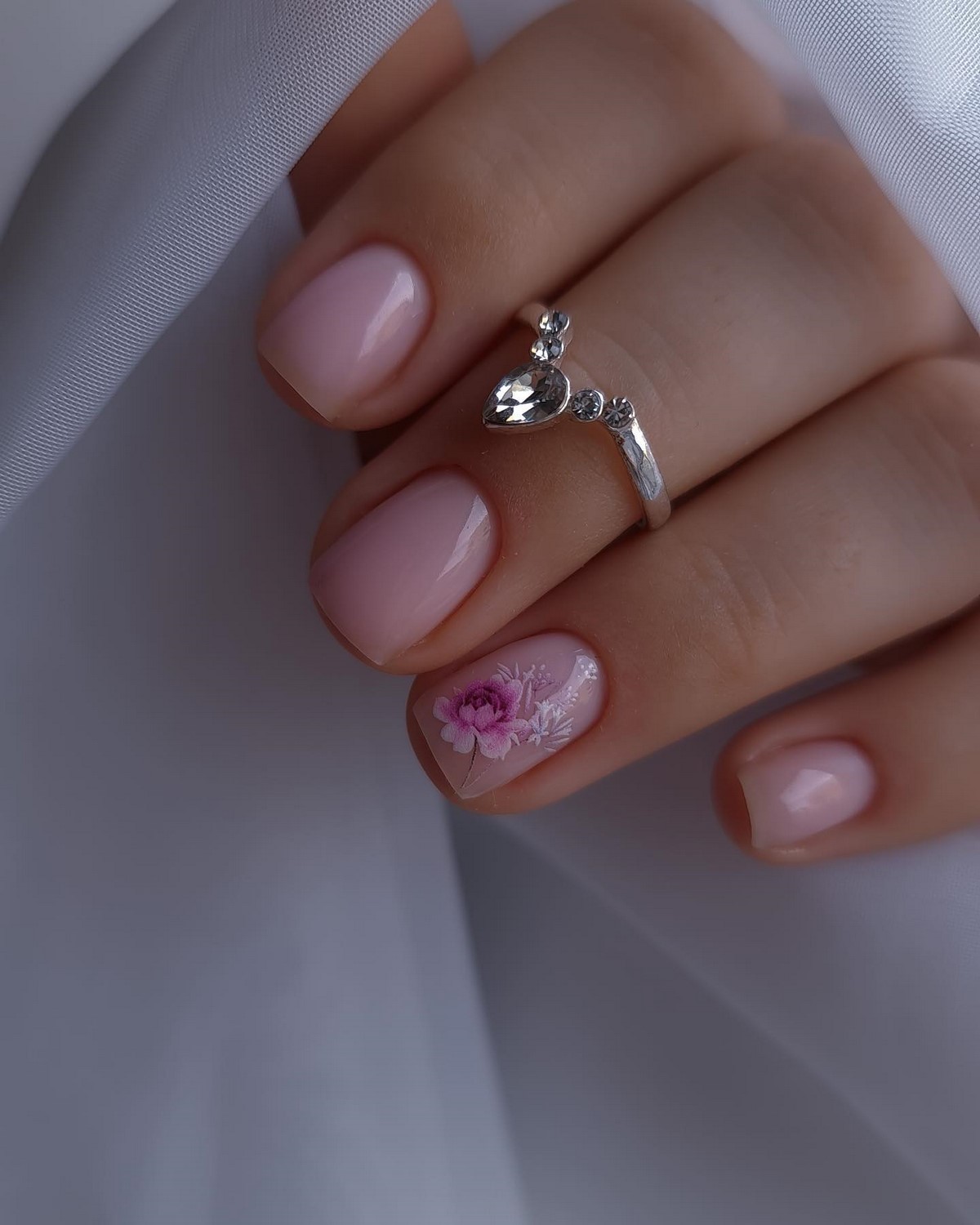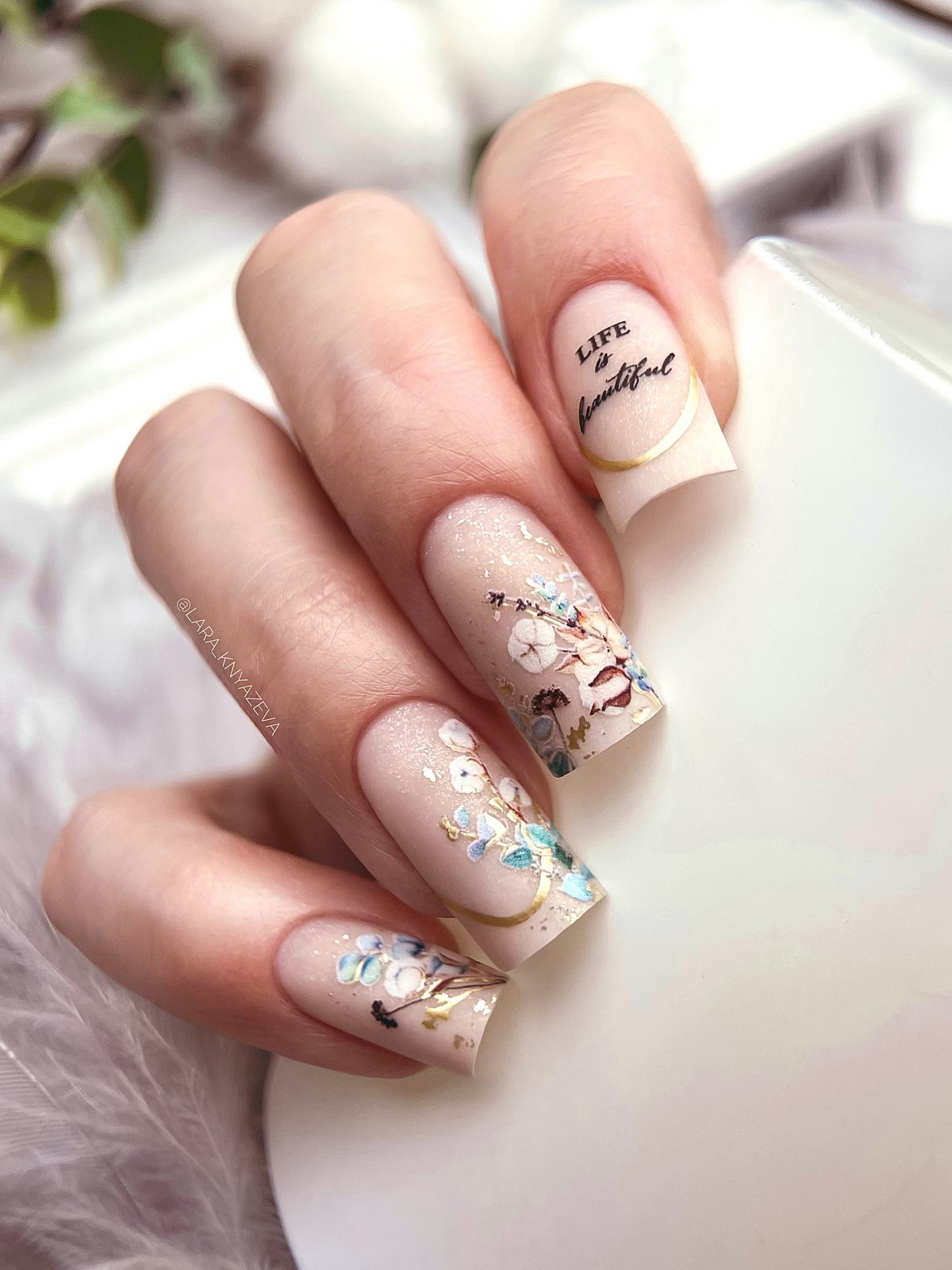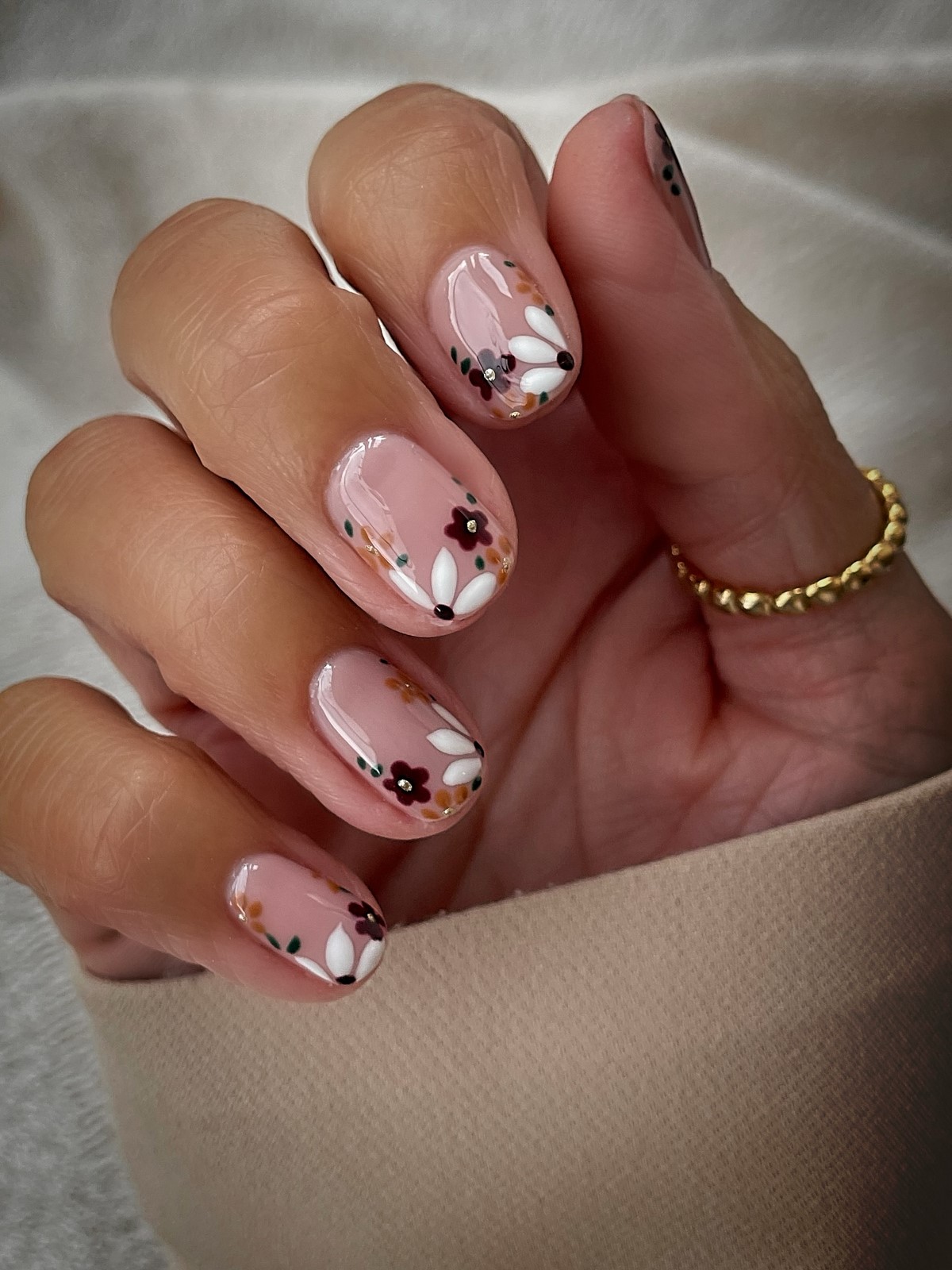 Ніжні квіткові мотиви на нюдовій основі втілюють романтичність і жіночність. В осінньо-зимовому сезоні актуальні приглушені квіткові композиції в теракотових, бордових, пильно-рожевих і смарагдових тонах. Малюнки можуть бути виконані тонкими лініями для створення акварельного ефекту або більш щільними мазками для графічності, а розташування квітів — від одного акцентного нігтя до повного покриття всіх пальців.