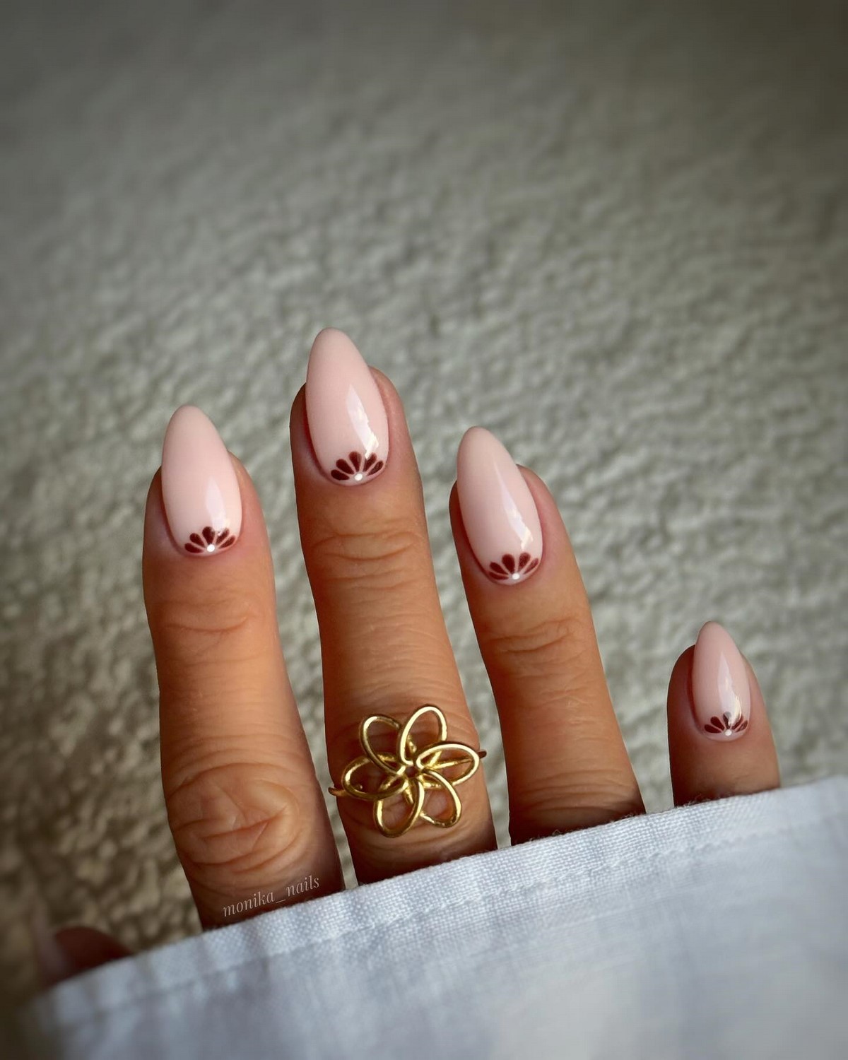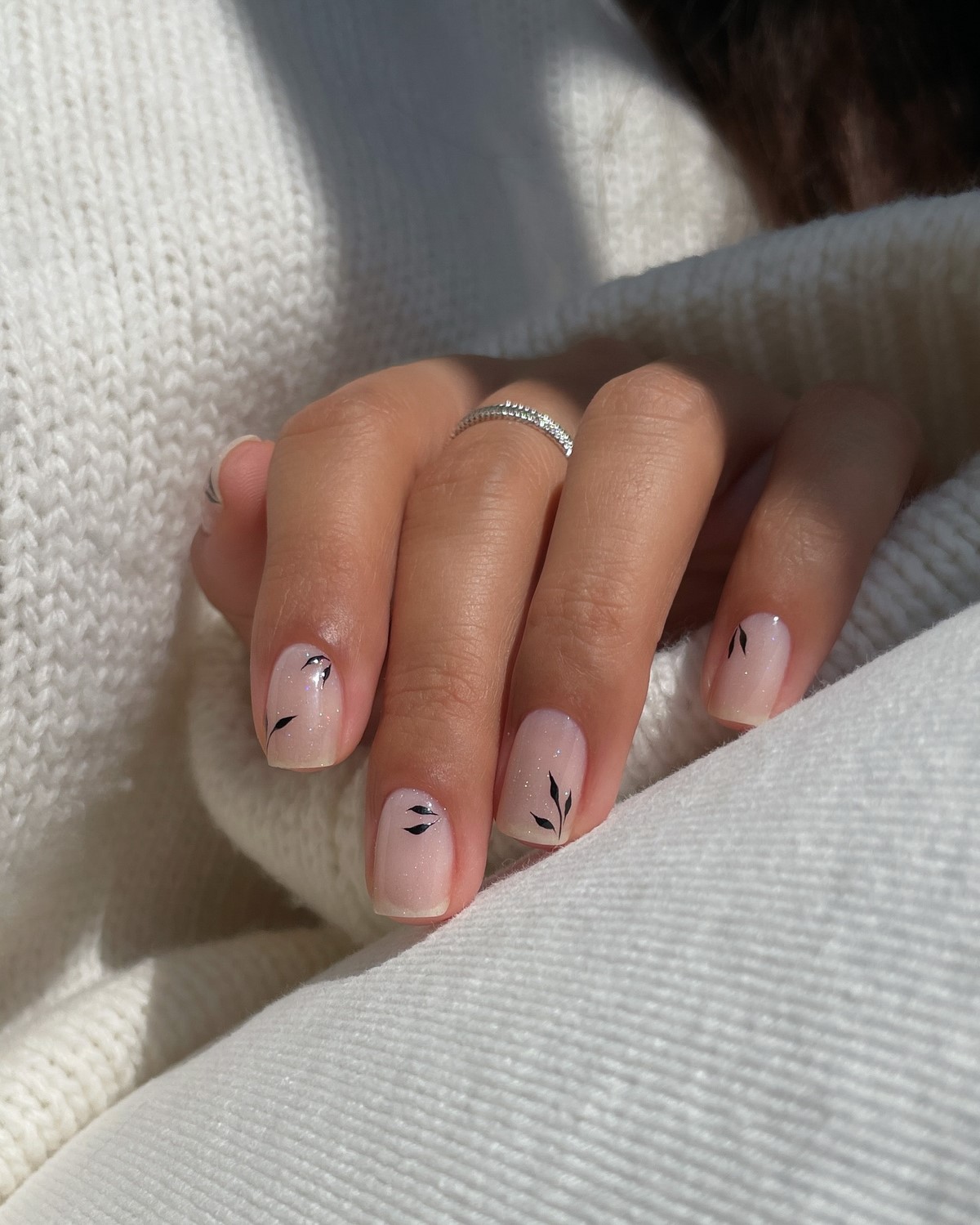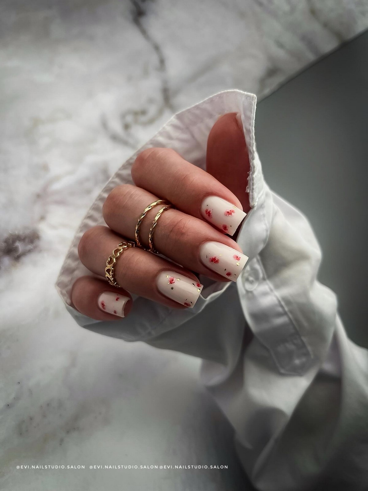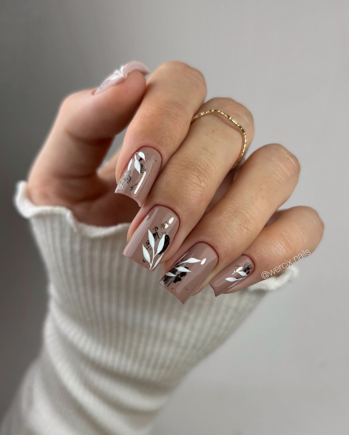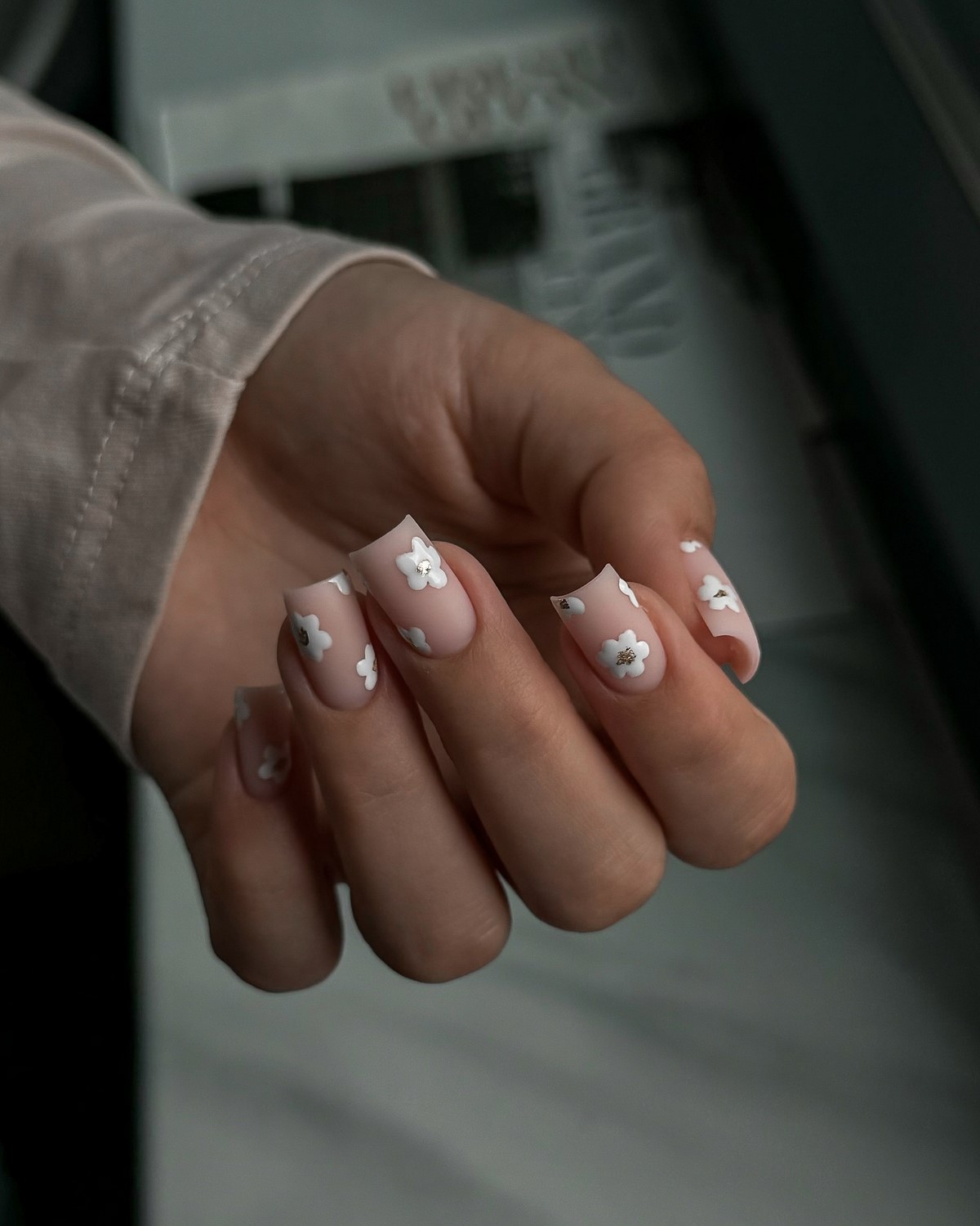 Ніжні квіткові мотиви на нюдовій основі втілюють романтичність і жіночність. В осінньо-зимовому сезоні актуальні приглушені квіткові композиції в теракотових, бордових, пильно-рожевих і смарагдових тонах. Малюнки можуть бути виконані тонкими лініями для створення акварельного ефекту або більш щільними мазками для графічності, а розташування квітів — від одного акцентного нігтя до повного покриття всіх пальців.