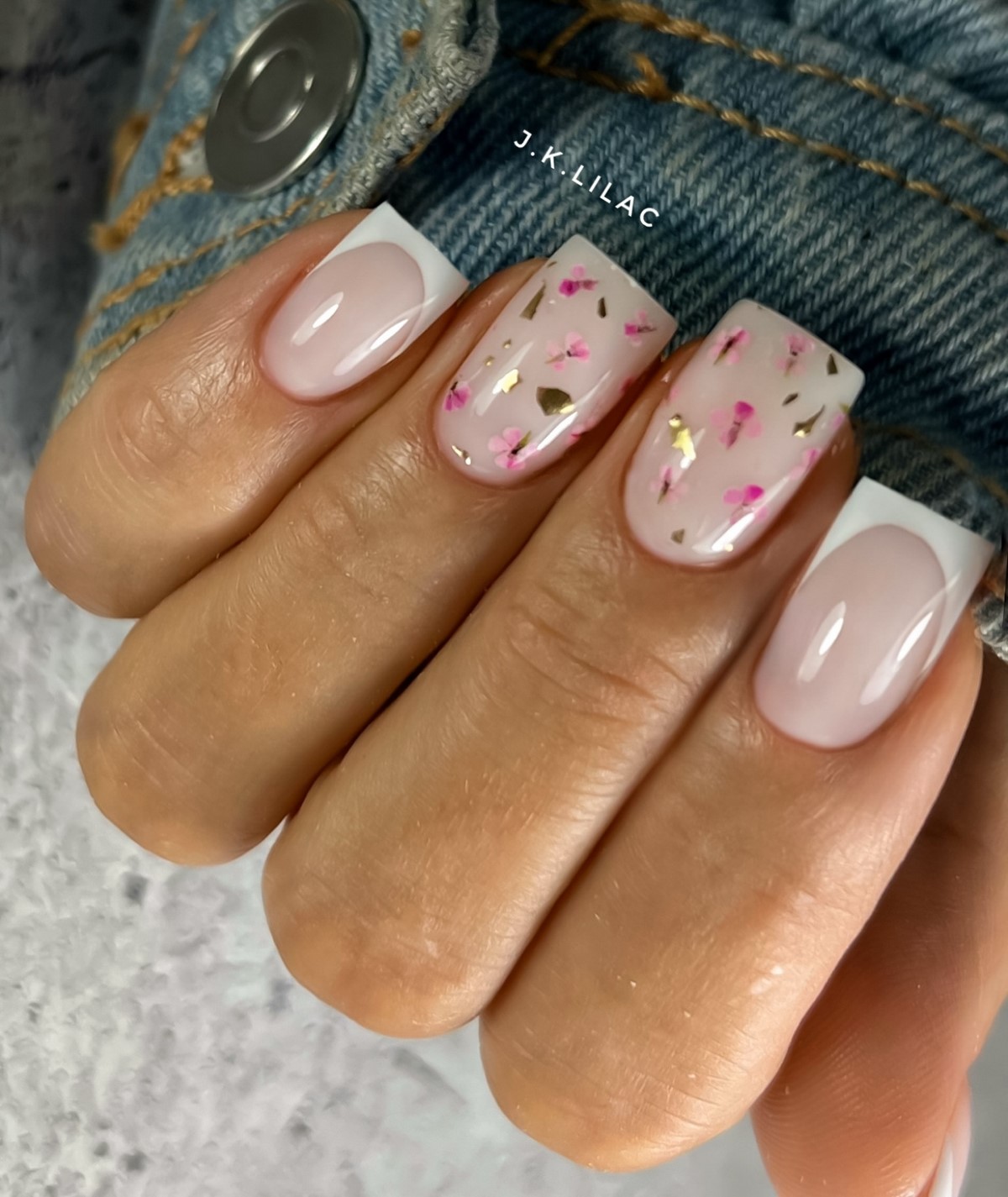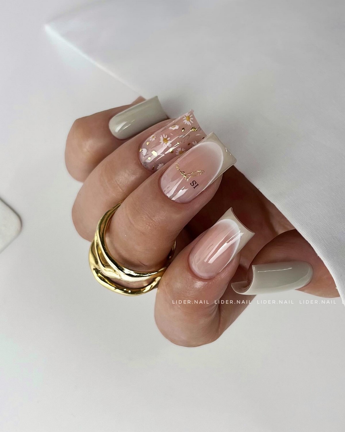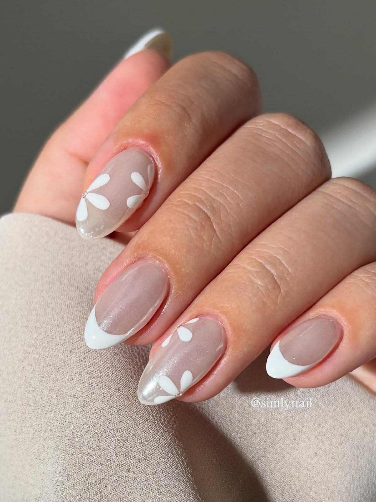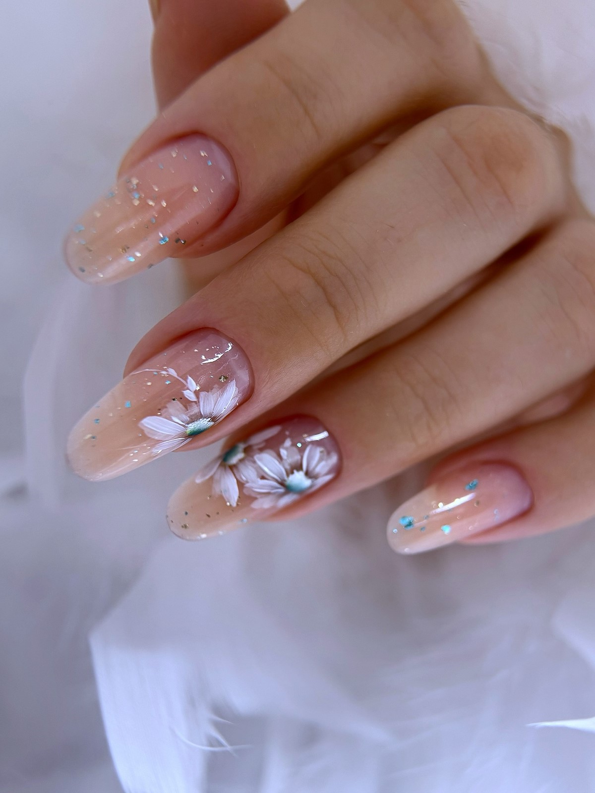 Ніжні квіткові мотиви на нюдовій основі втілюють романтичність і жіночність. В осінньо-зимовому сезоні актуальні приглушені квіткові композиції в теракотових, бордових, пильно-рожевих і смарагдових тонах. Малюнки можуть бути виконані тонкими лініями для створення акварельного ефекту або більш щільними мазками для графічності, а розташування квітів — від одного акцентного нігтя до повного покриття всіх пальців.